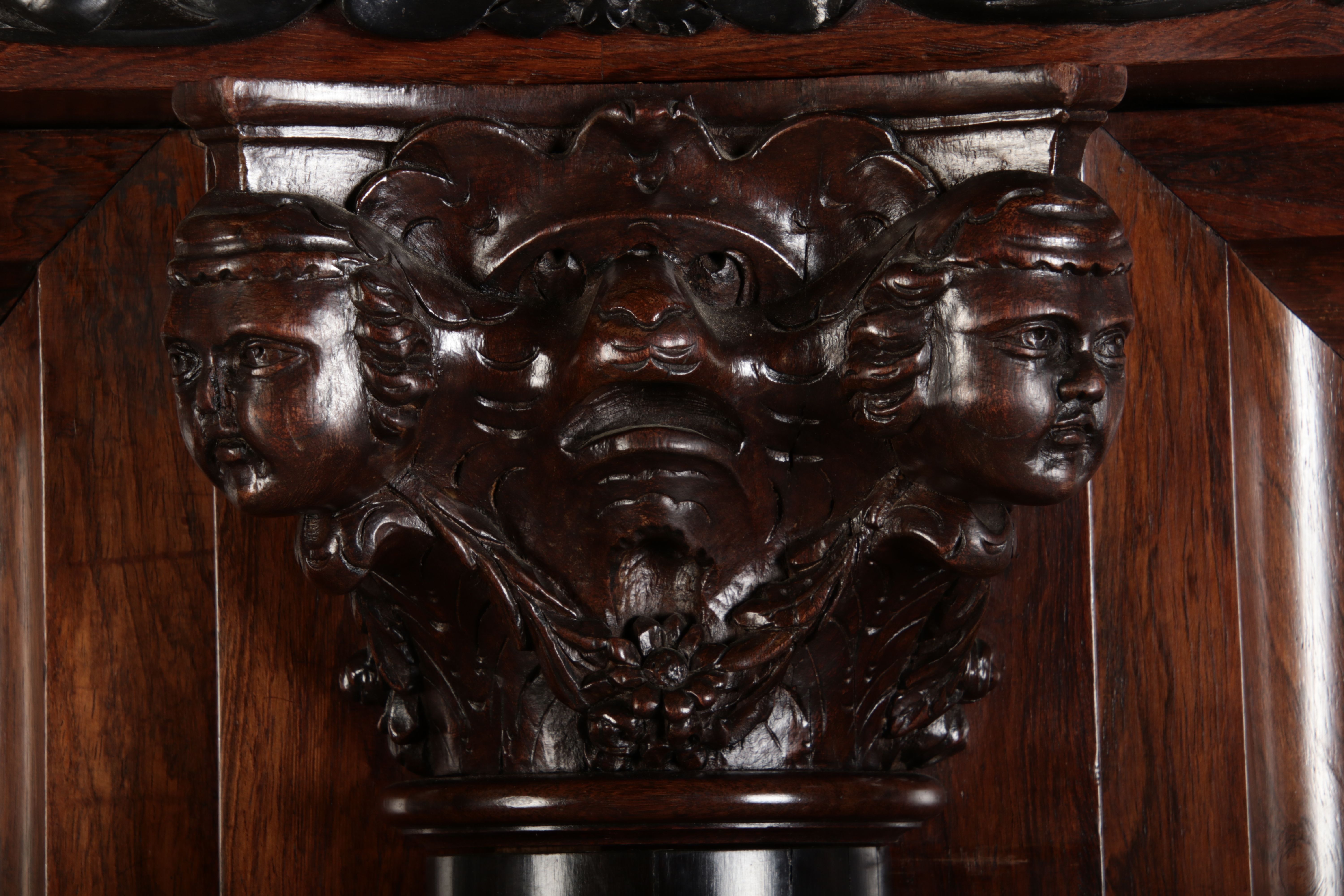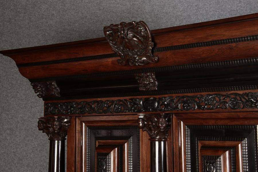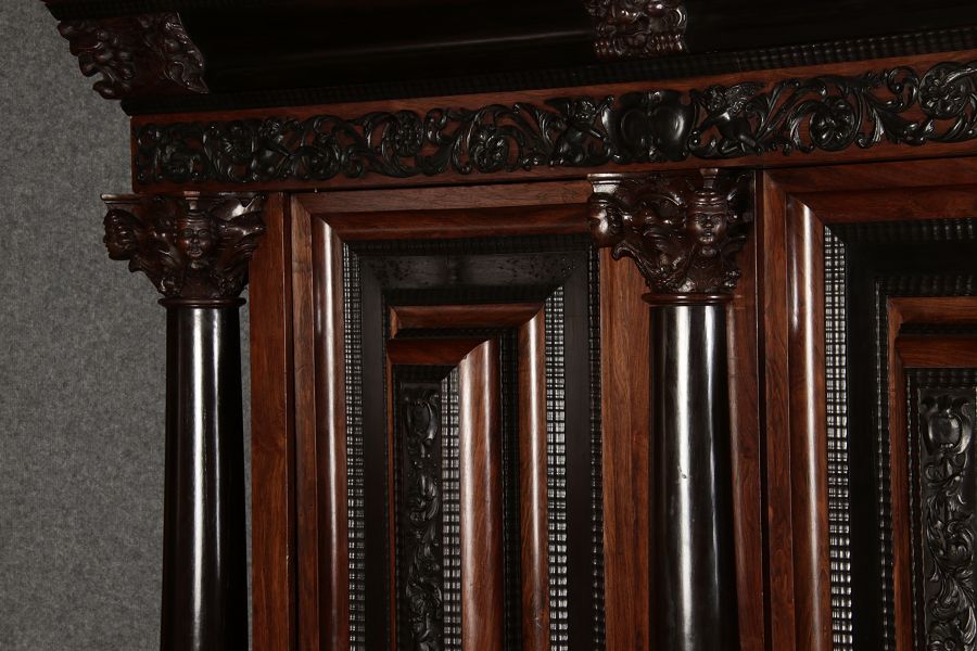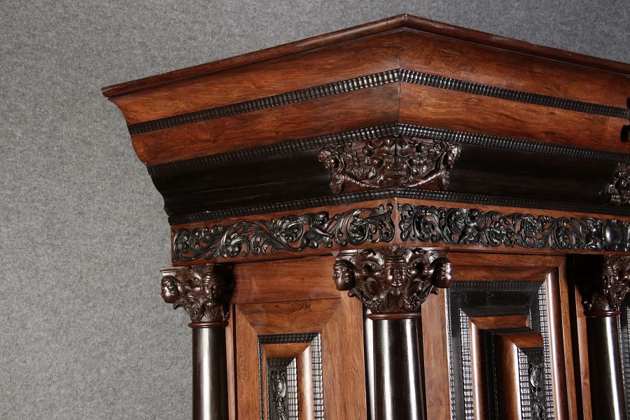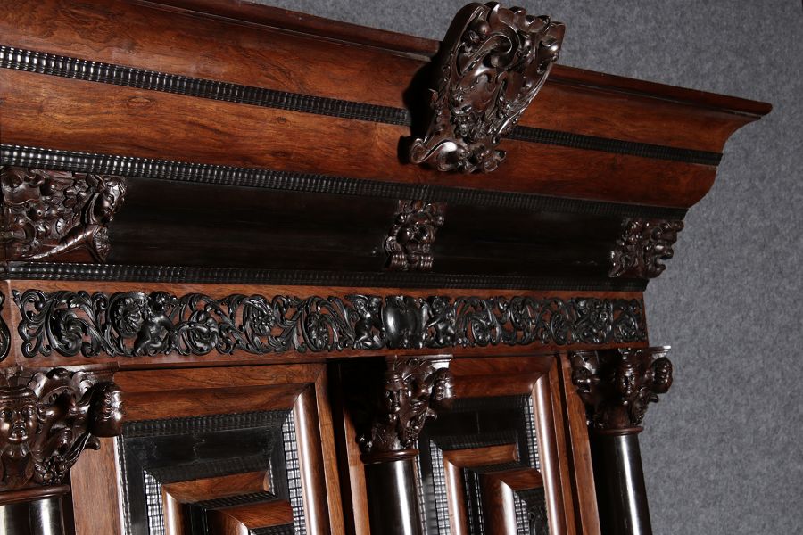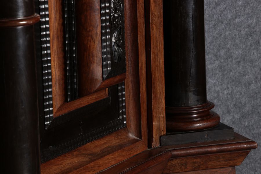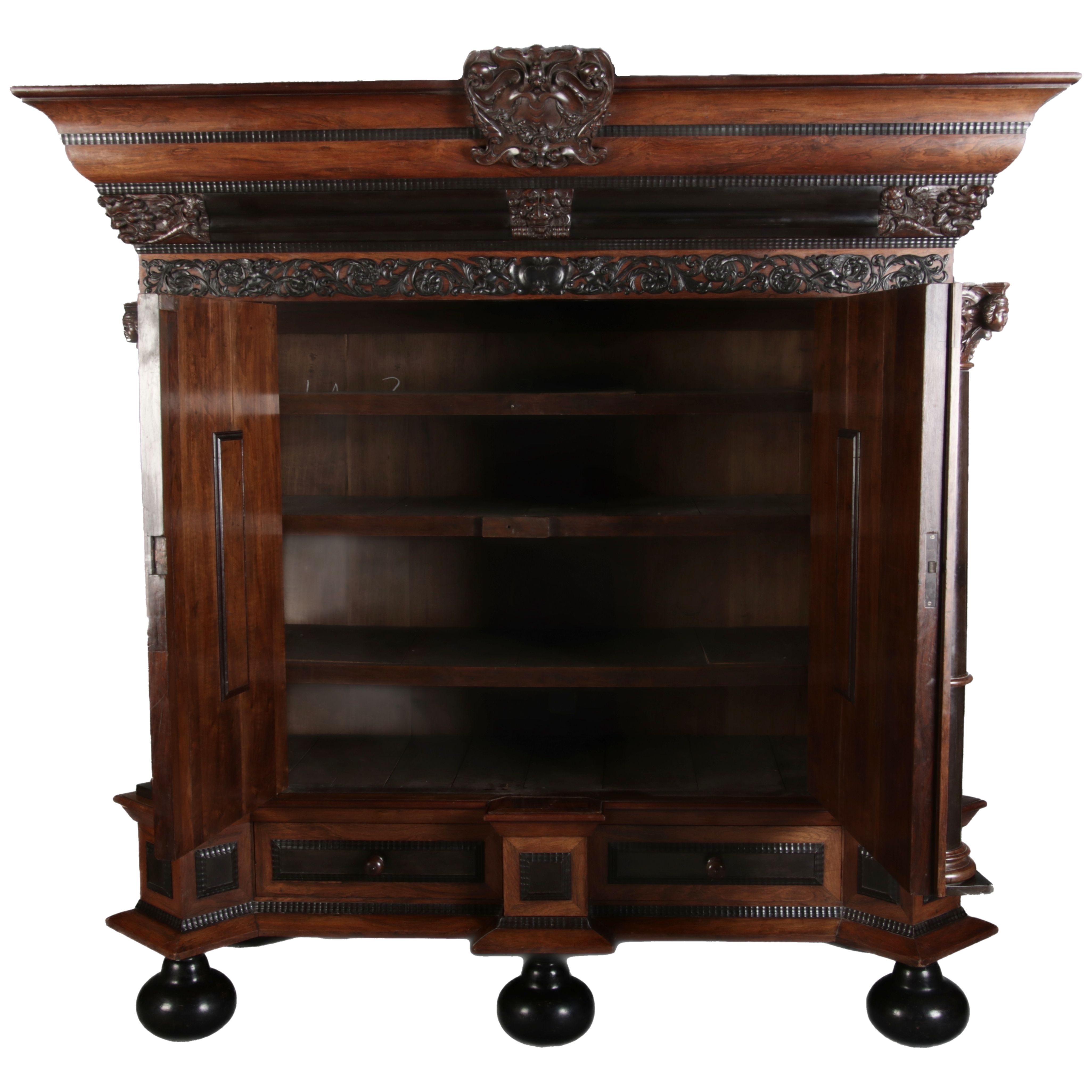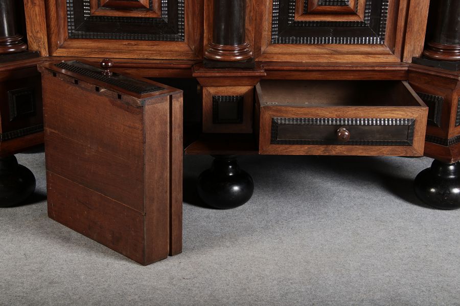 Antiker Barockschrank Amsterdamer Schapp, 5 ebonisierten Säulen, Kissenfüllungen, geschnitzte Kapitele - Türen - Gesimse, Geheimfach, auf hohen Füßen |