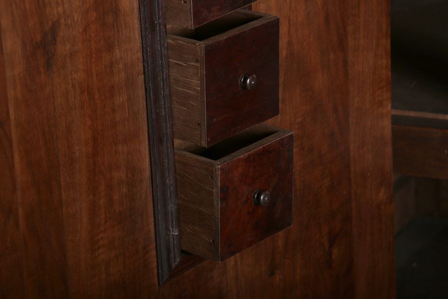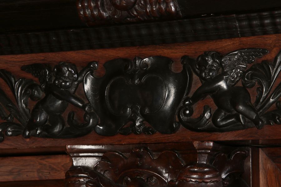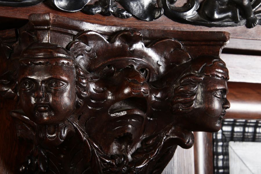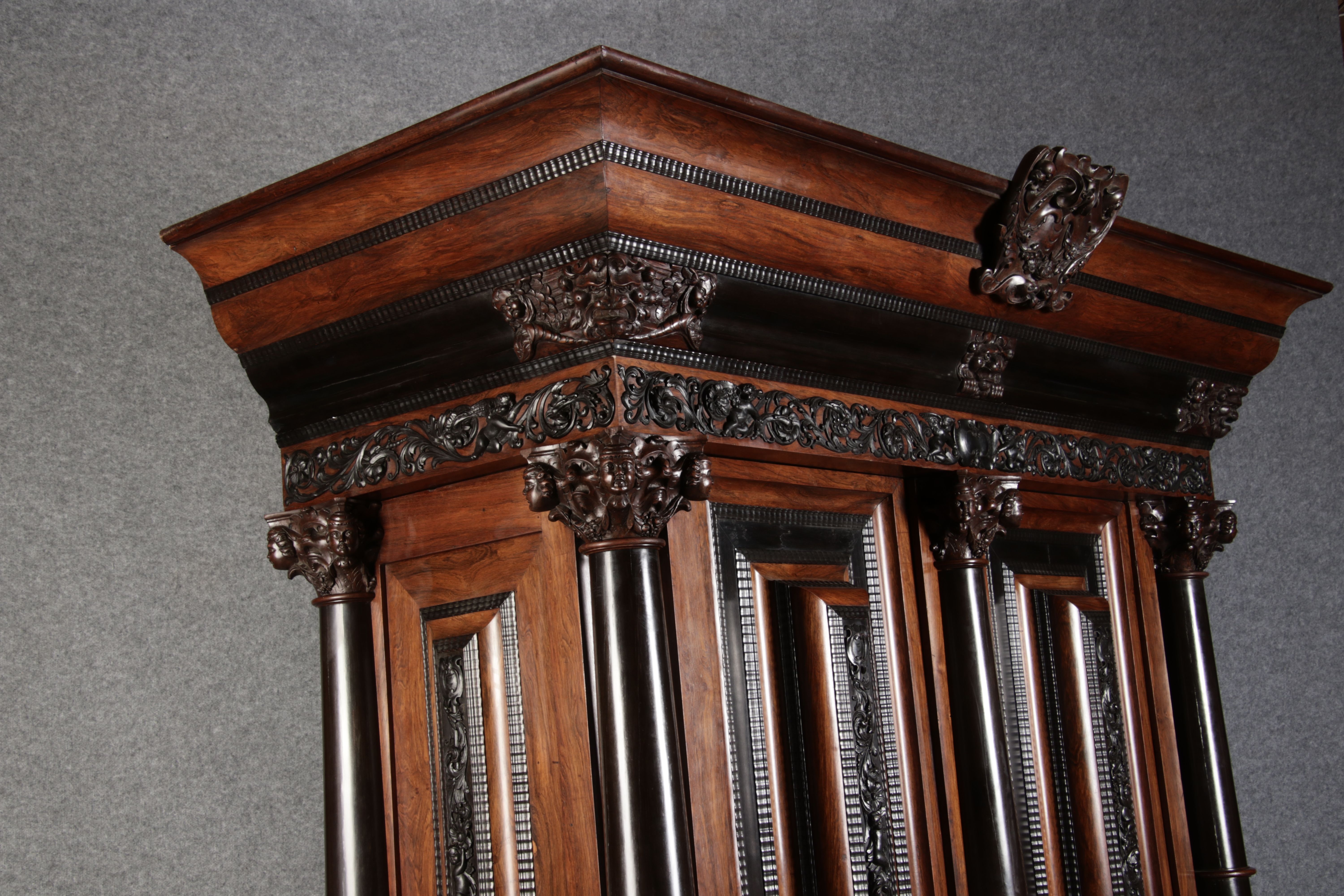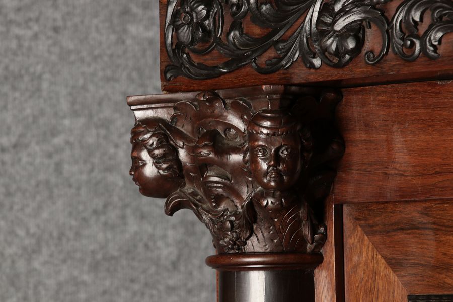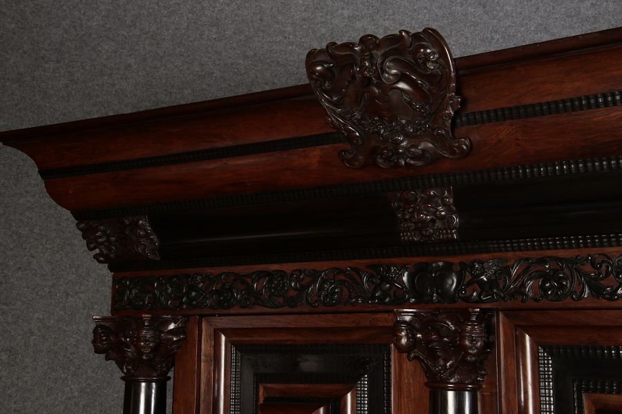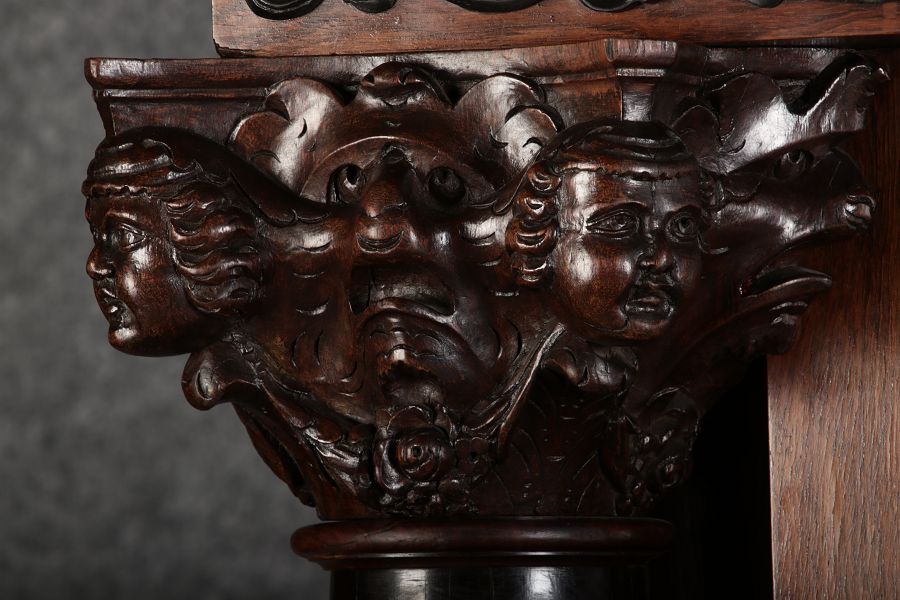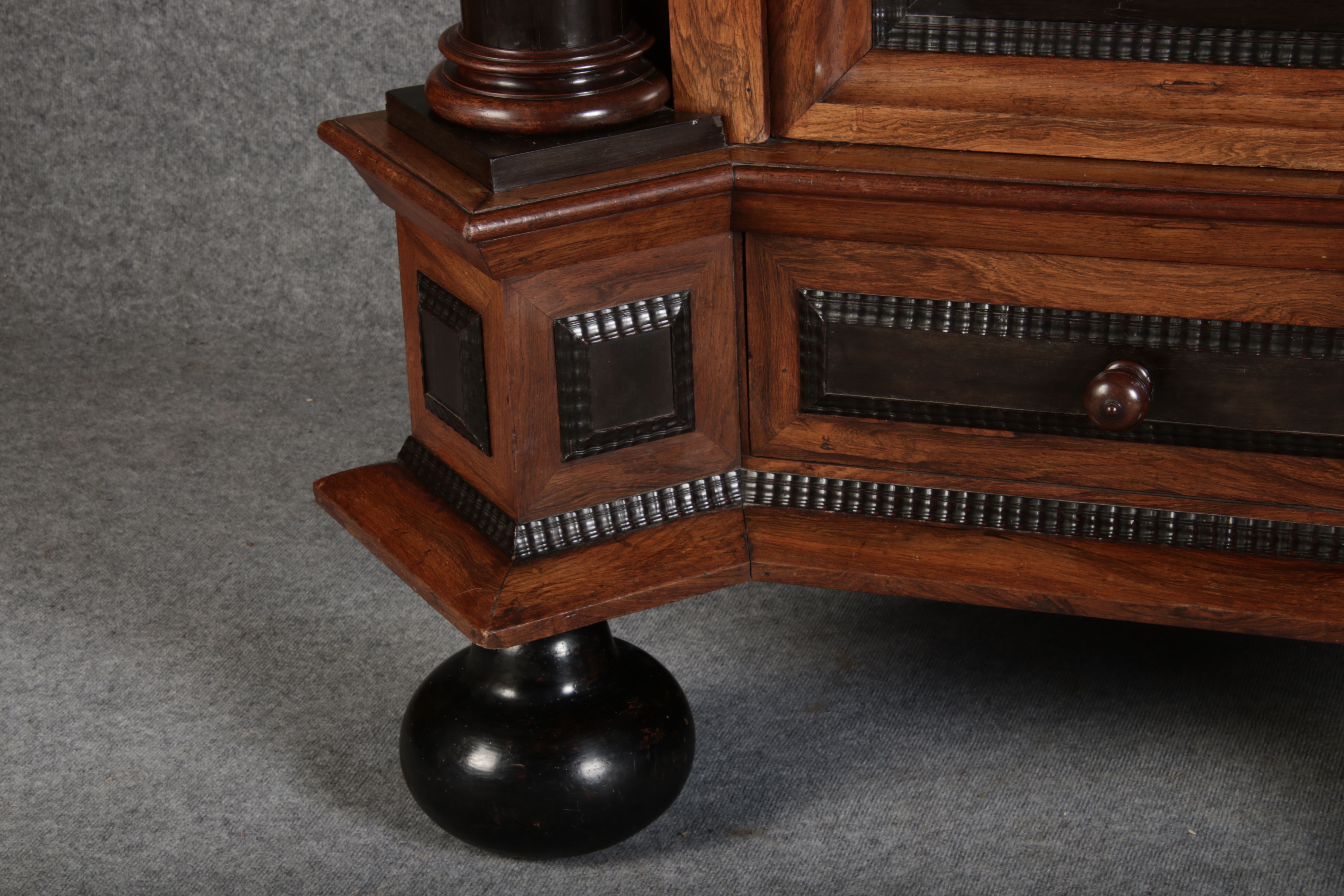 Antiker Barockschrank Amsterdamer Schapp, 5 ebonisierten Säulen, Kissenfüllungen, geschnitzte Kapitele - Türen - Gesimse, Geheimfach, auf hohen Füßen |