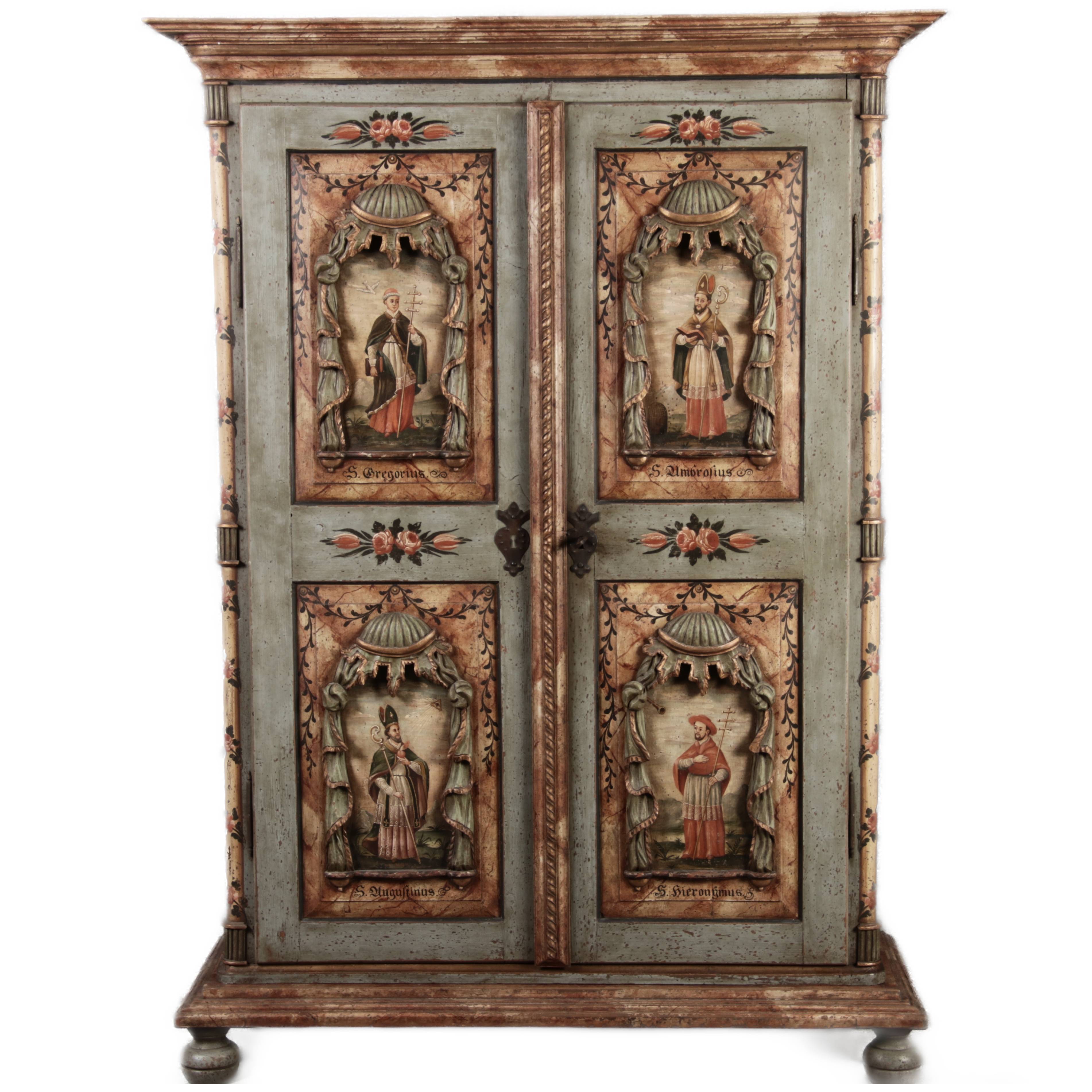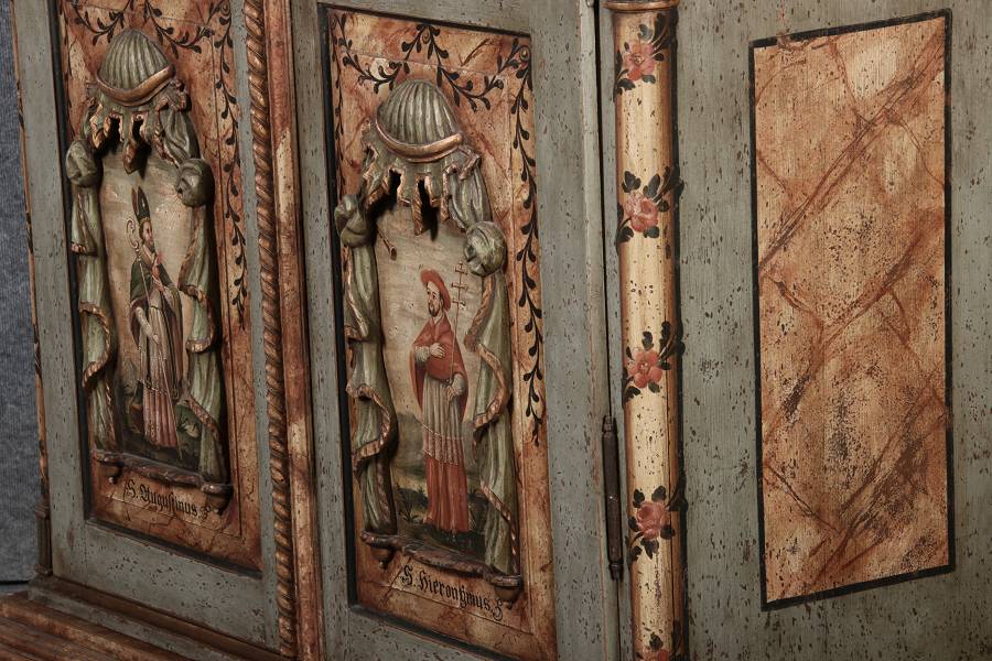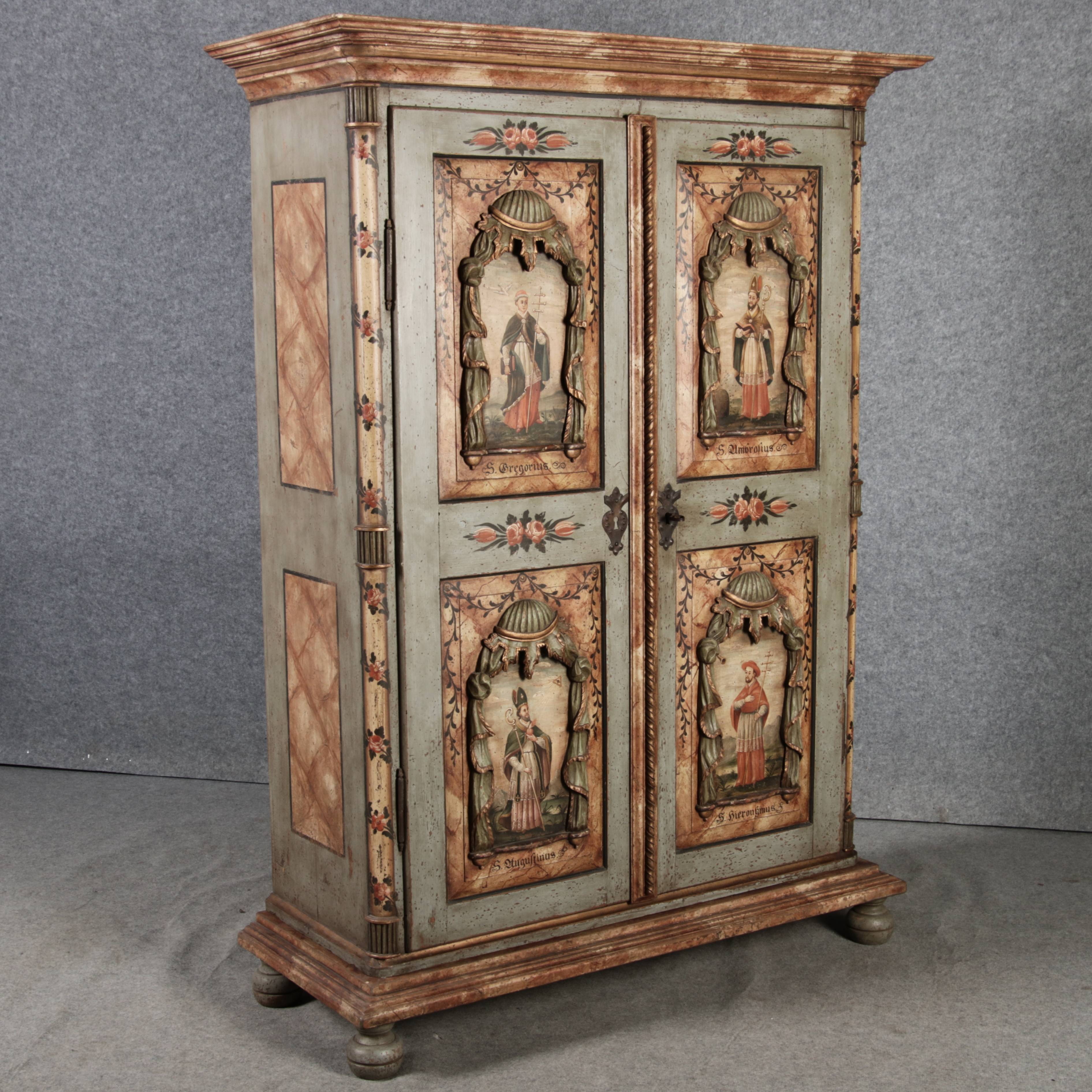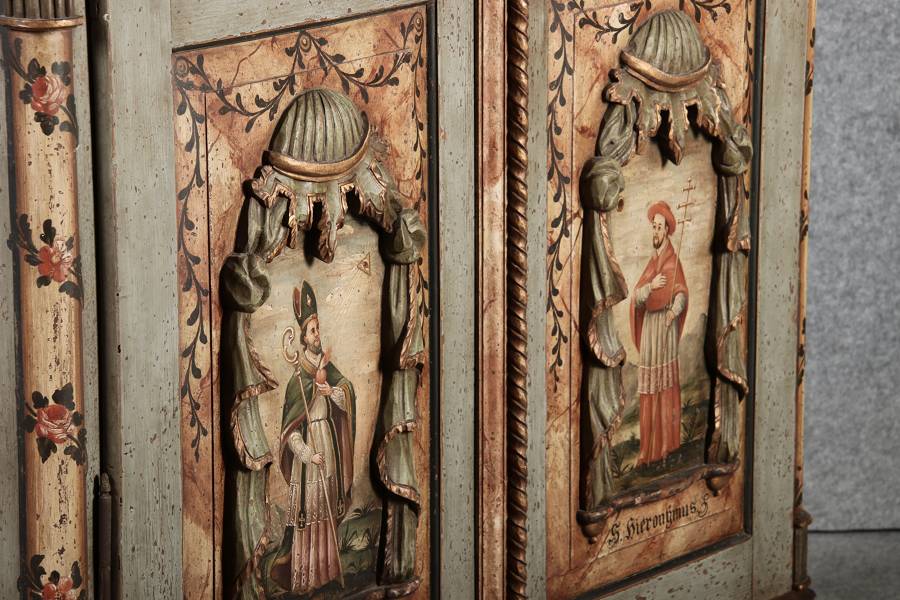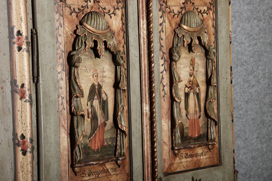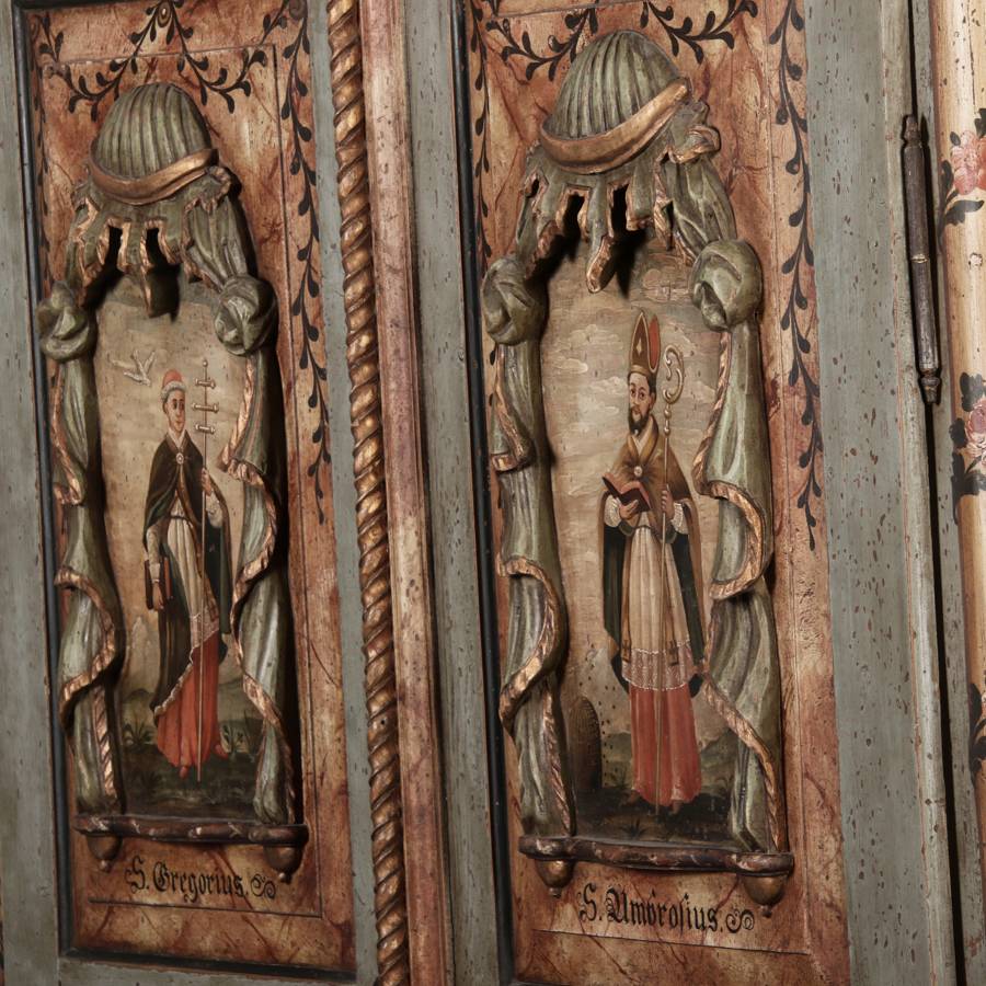 Beschreibung/description: Barockschrank aus dem 19 Jh. mit aufwendig geschnitzten Türfeldern.Die vier Felder mit Schnitzwerk und Darstellungen von S. Gregorius, S. Ambrosius, S. Augustinus und S. Hieronymus ArtikelNummer /number: sch122