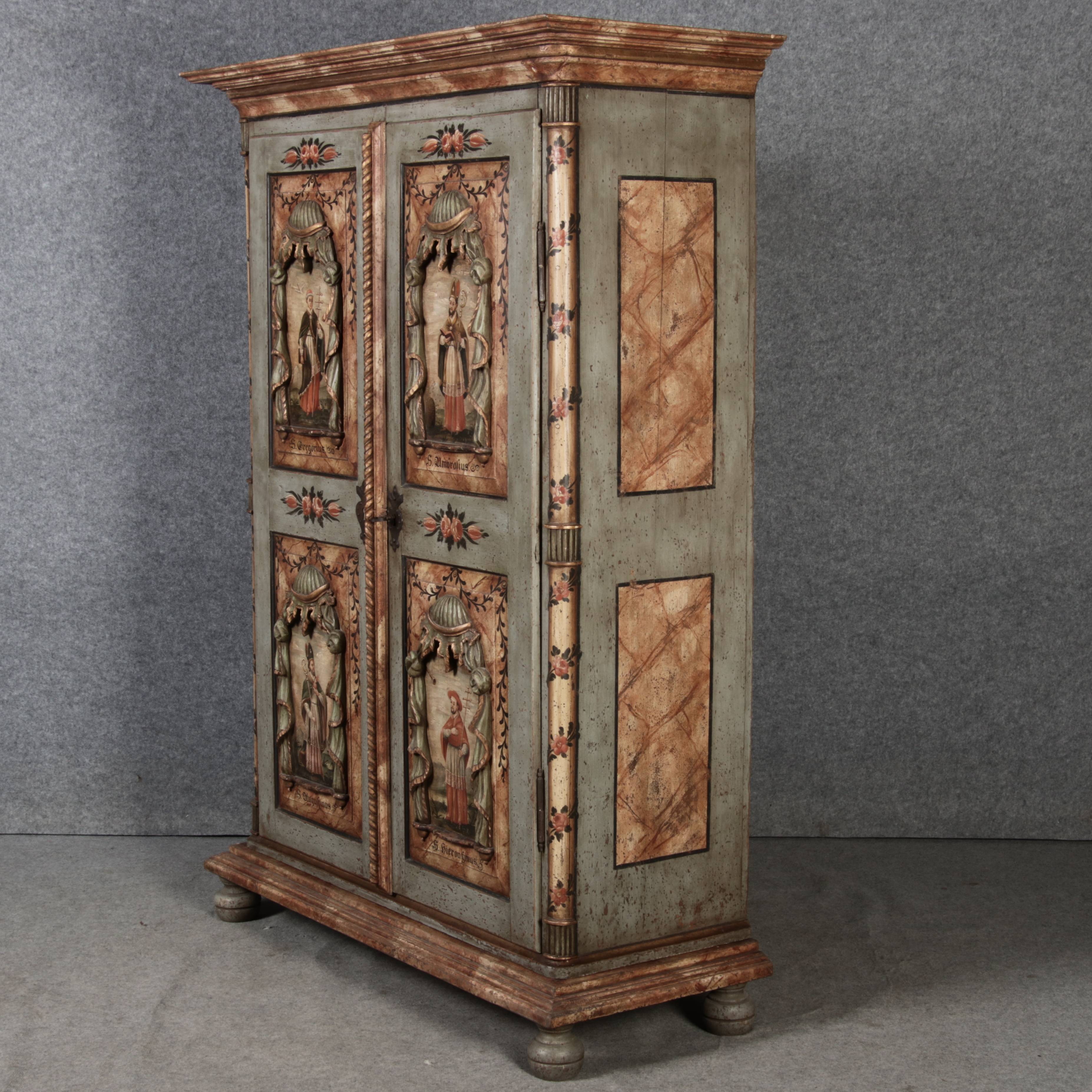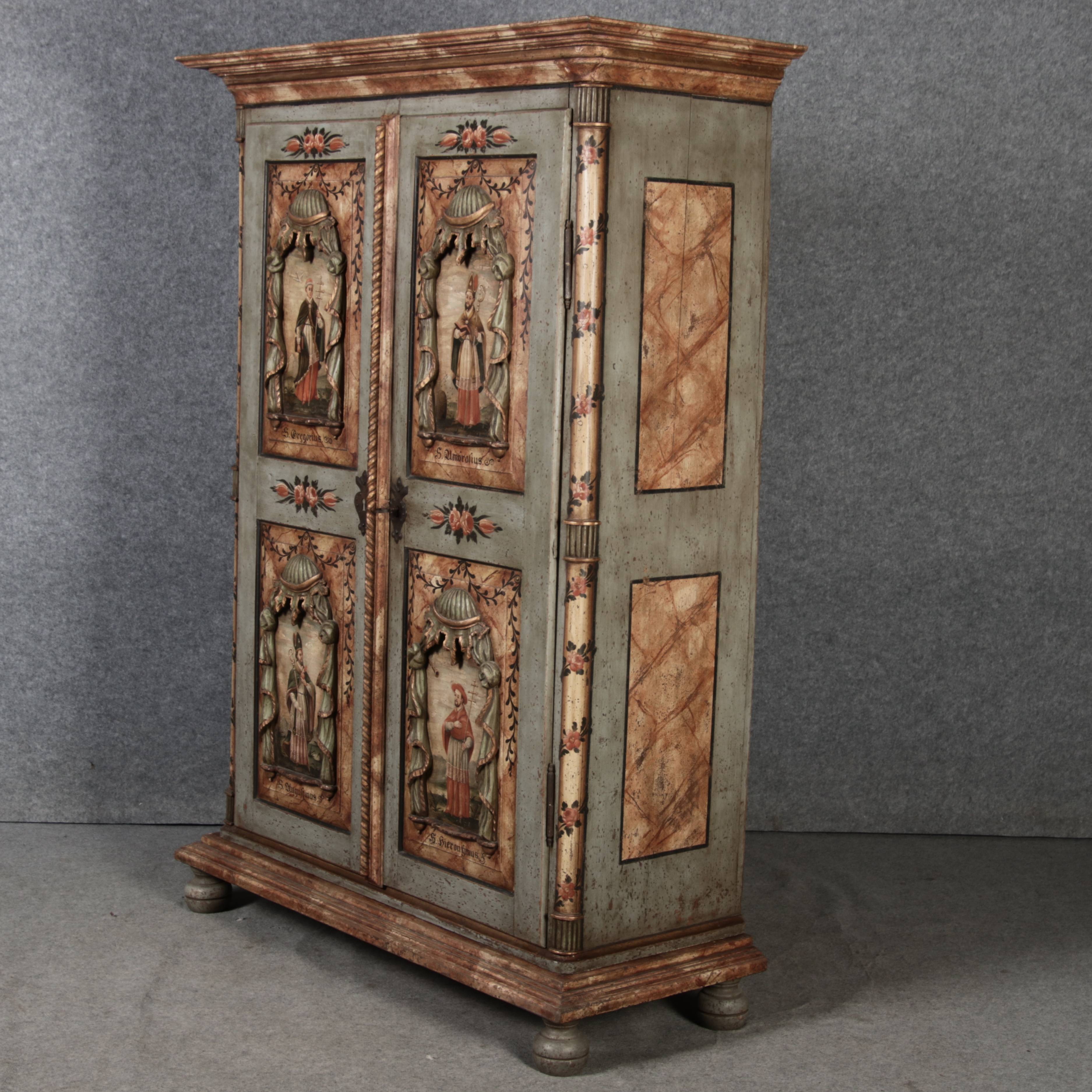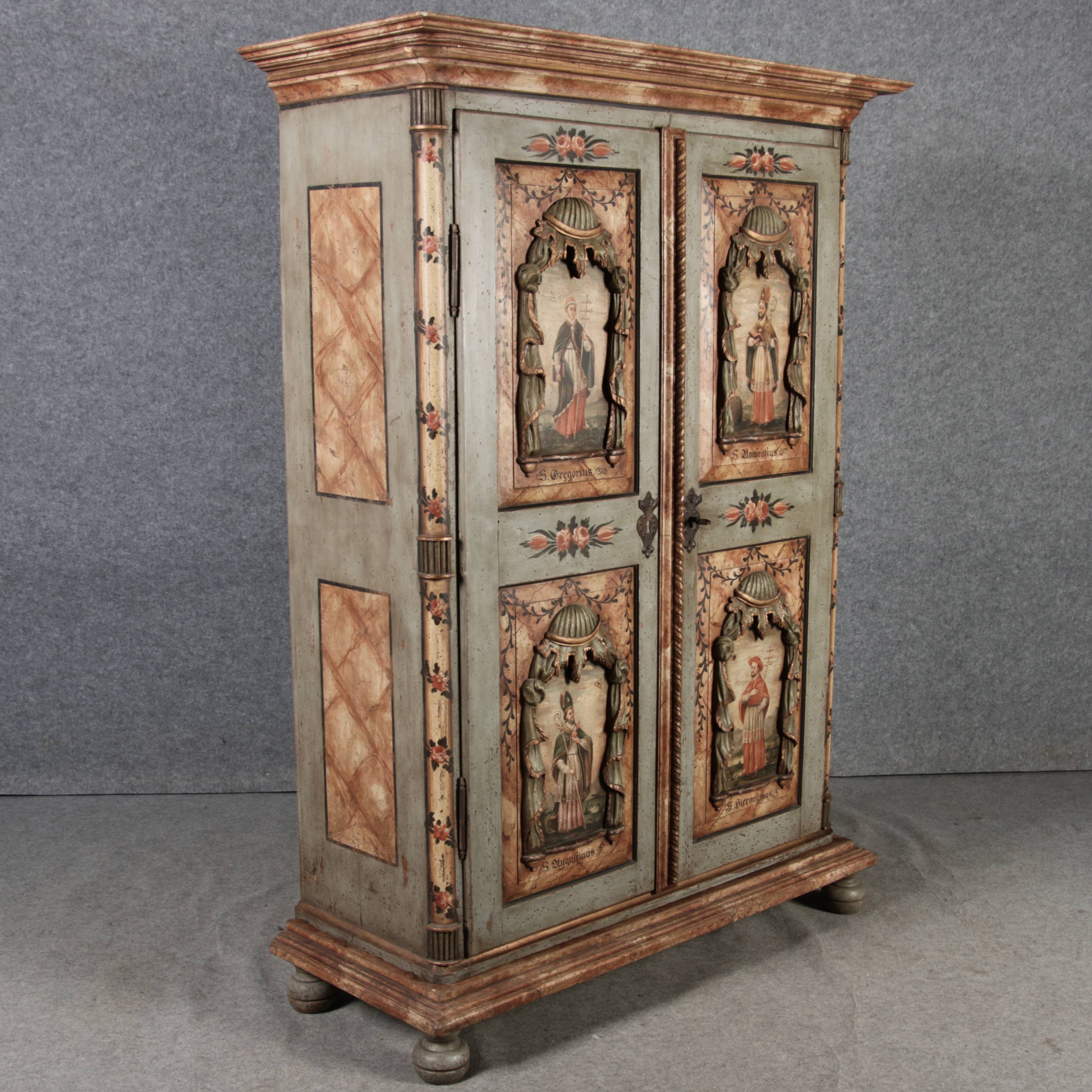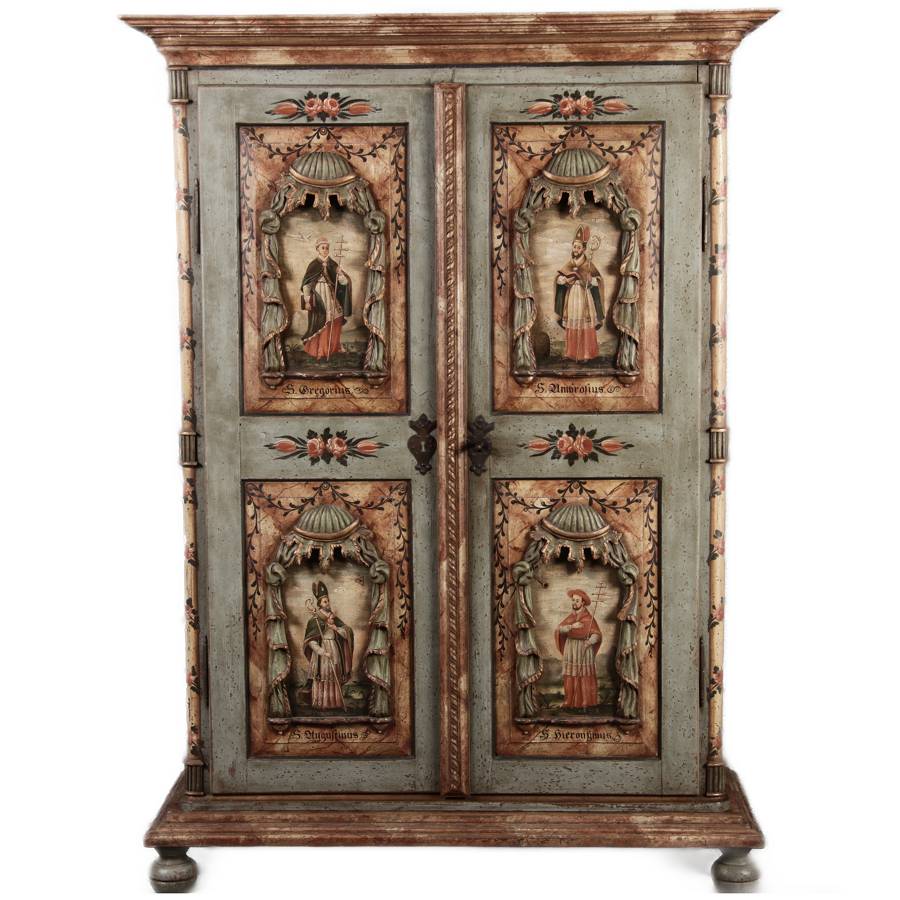 Beschreibung/description: Barockschrank aus dem 19 Jh. mit aufwendig geschnitzten Türfeldern.Die vier Felder mit Schnitzwerk und Darstellungen von S. Gregorius, S. Ambrosius, S. Augustinus und S. Hieronymus ArtikelNummer /number: sch122