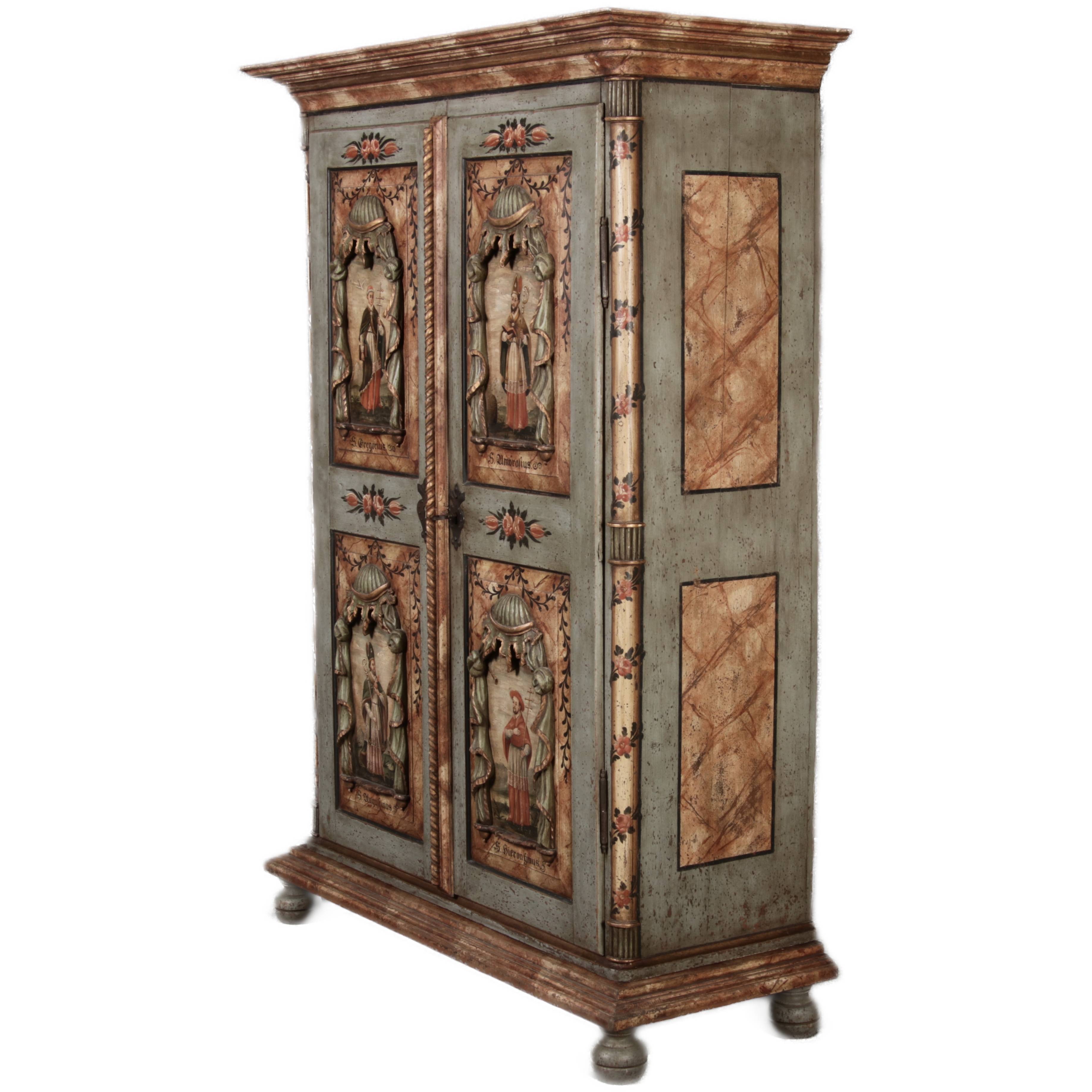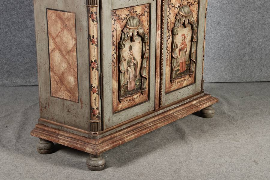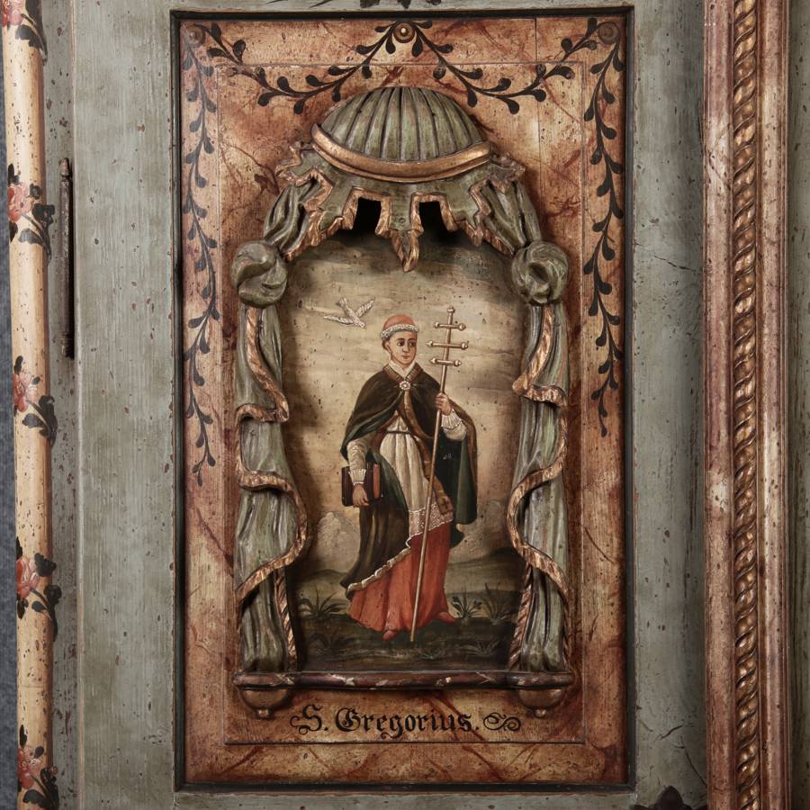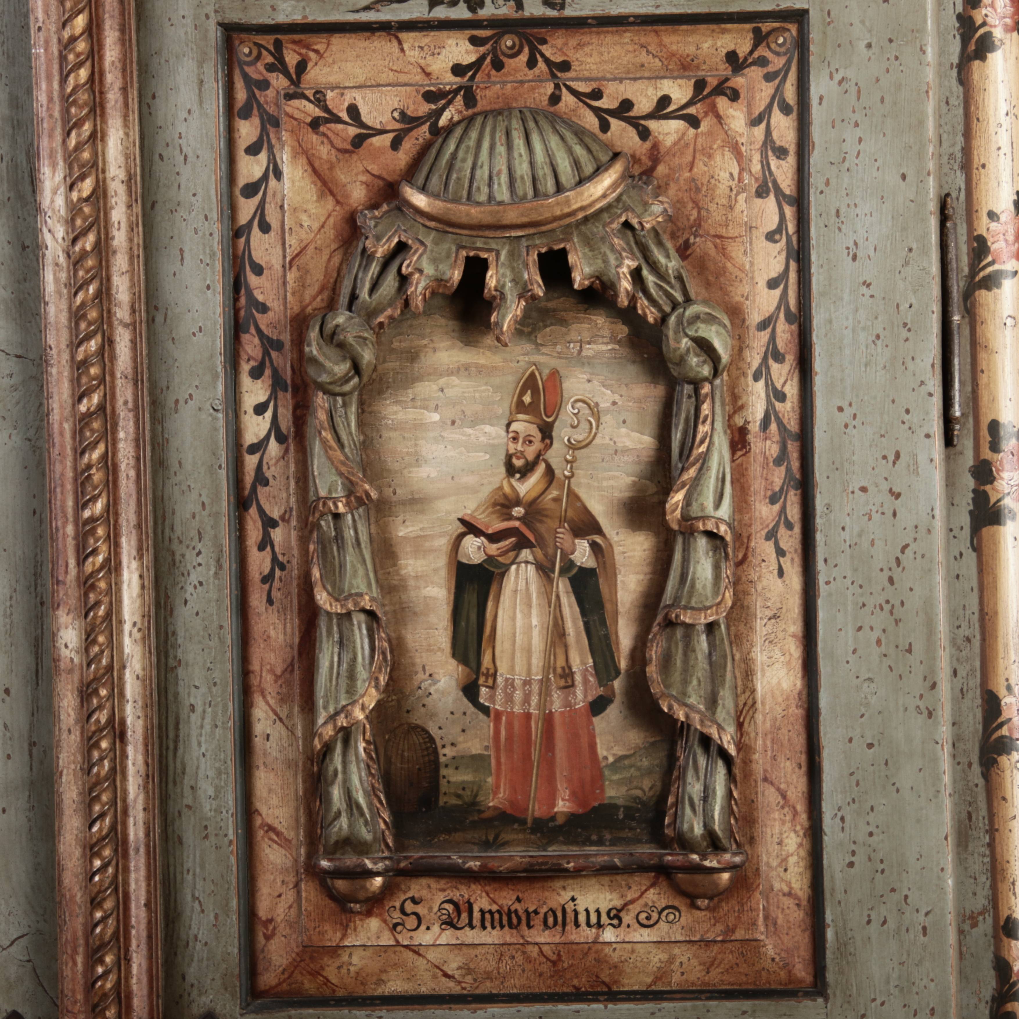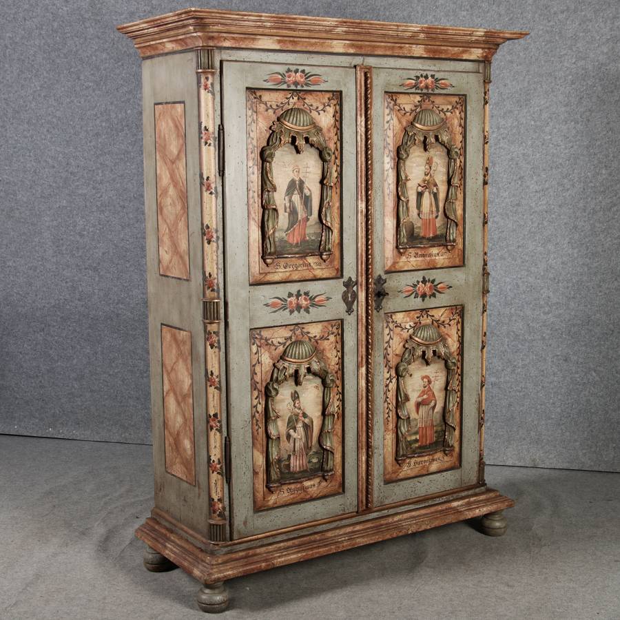 Beschreibung/description: Barockschrank aus dem 19 Jh. mit aufwendig geschnitzten Türfeldern.Die vier Felder mit Schnitzwerk und Darstellungen von S. Gregorius, S. Ambrosius, S. Augustinus und S. Hieronymus ArtikelNummer /number: sch122