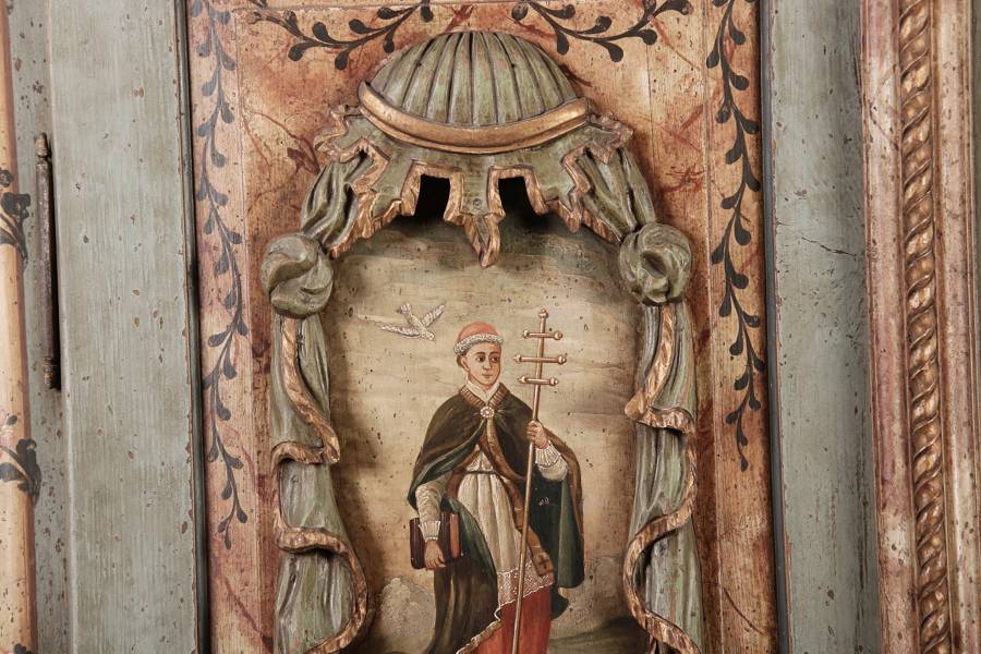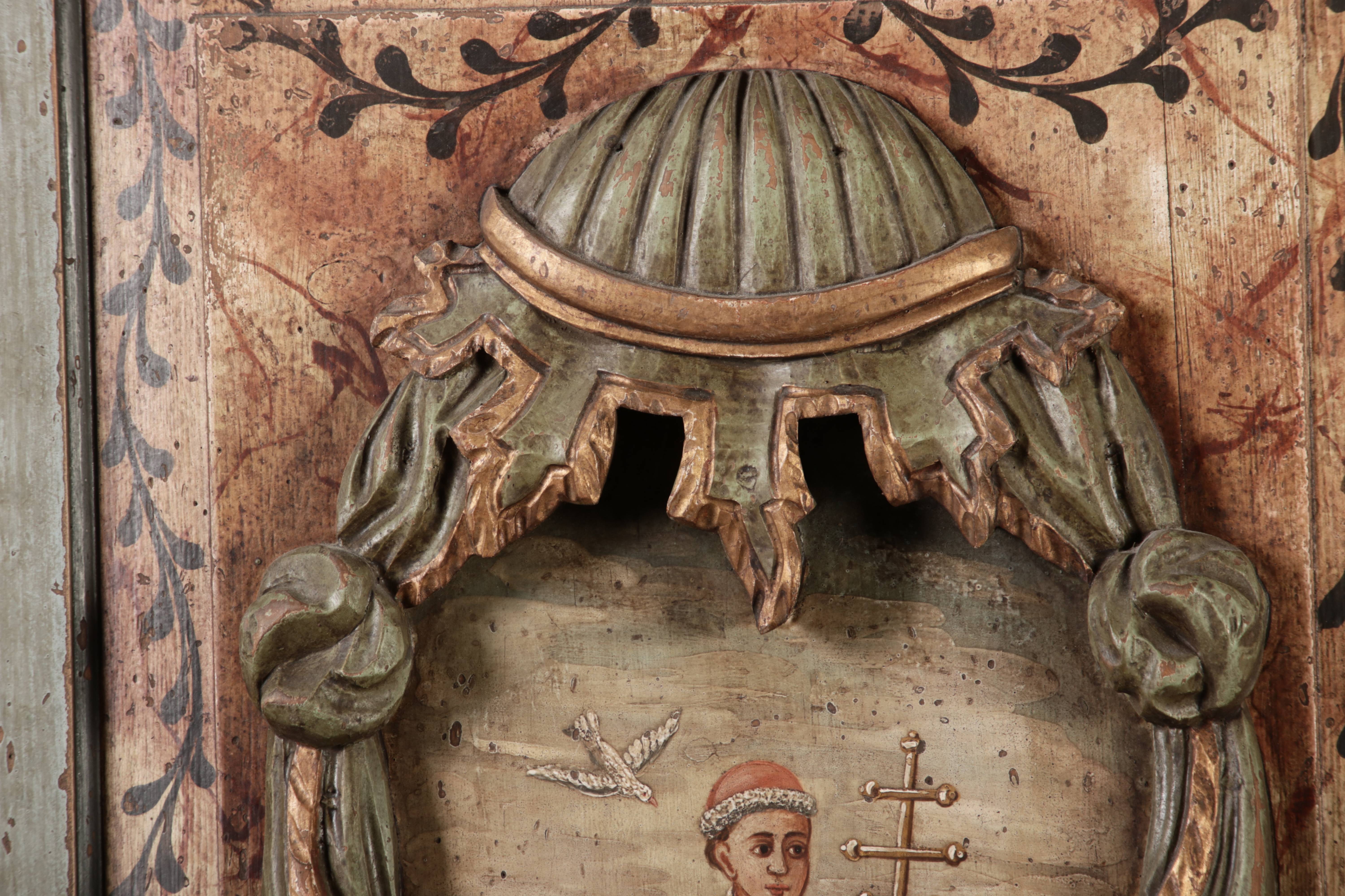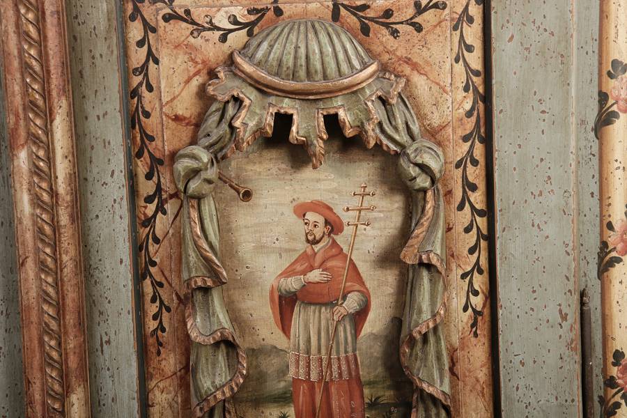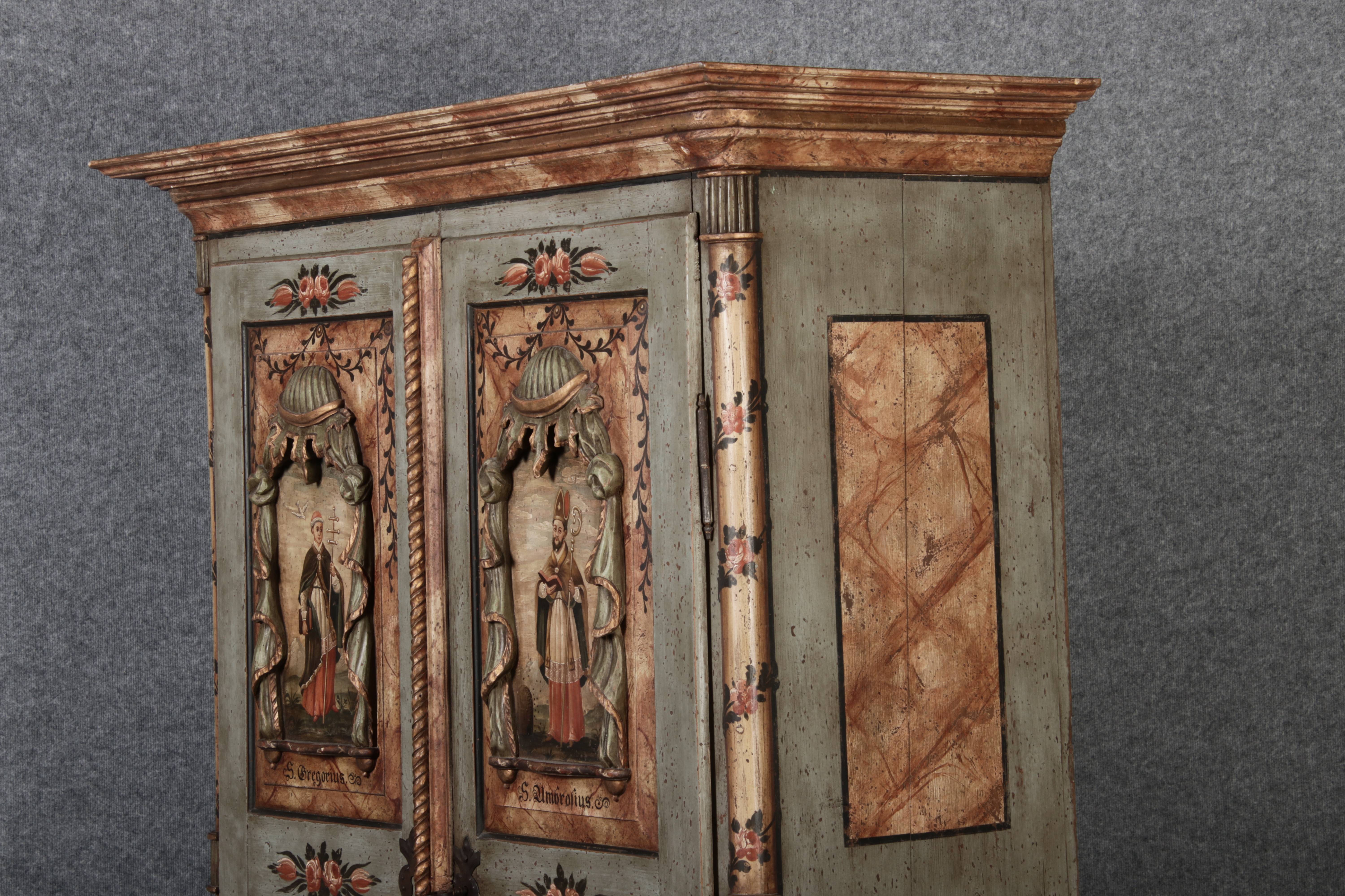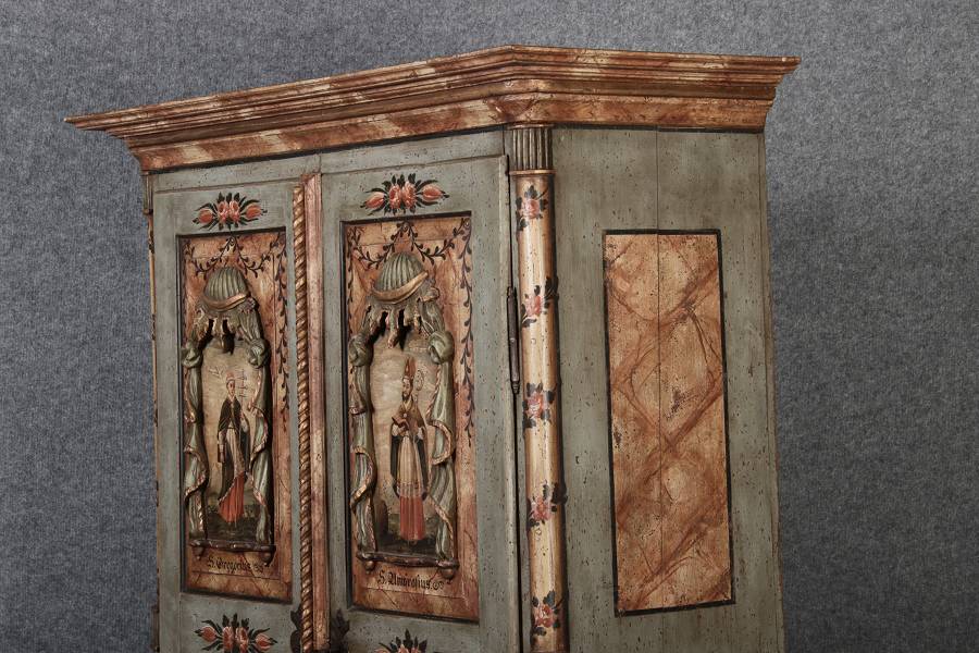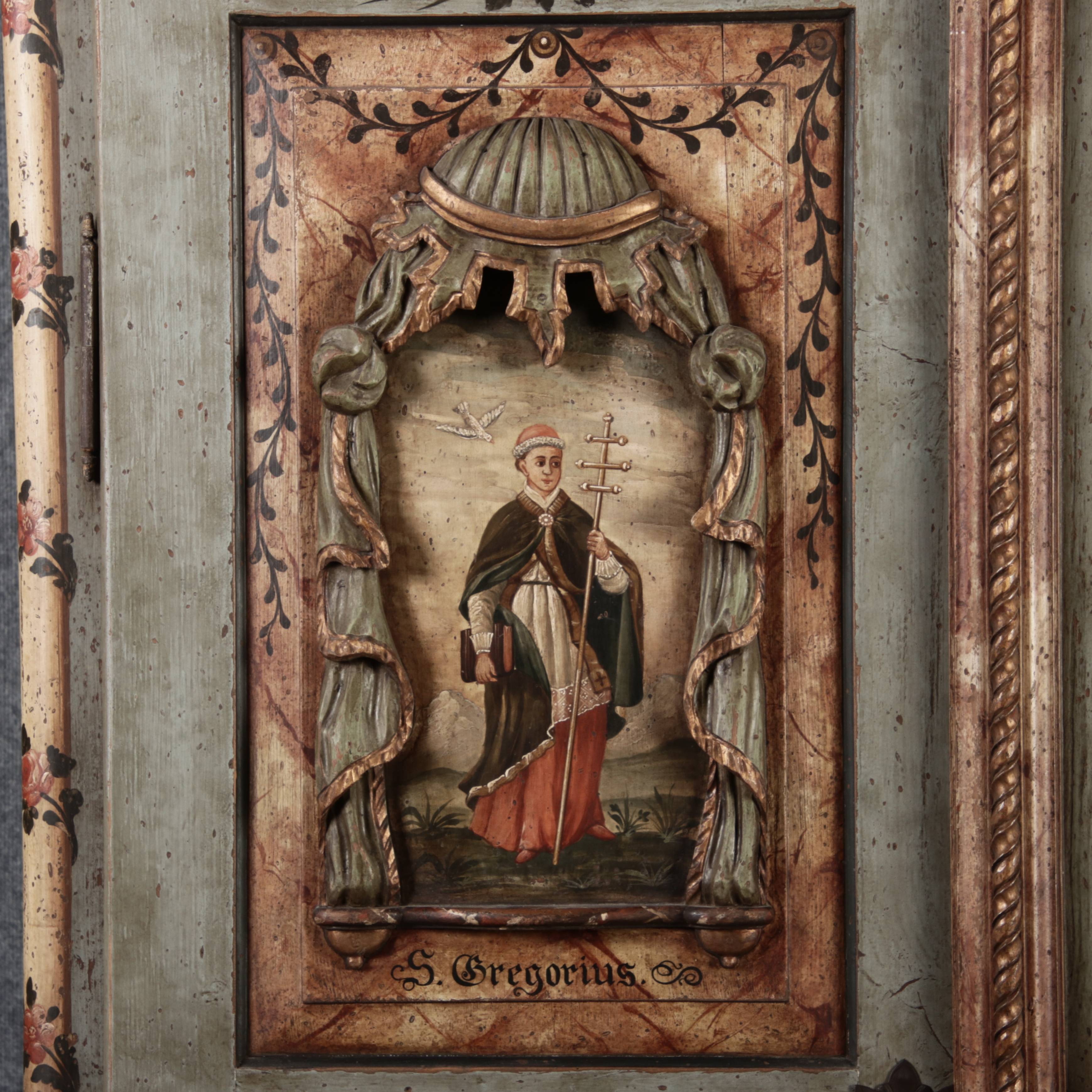 Beschreibung/description: Barockschrank aus dem 19 Jh. mit aufwendig geschnitzten Türfeldern.Die vier Felder mit Schnitzwerk und Darstellungen von S. Gregorius, S. Ambrosius, S. Augustinus und S. Hieronymus ArtikelNummer /number: sch122