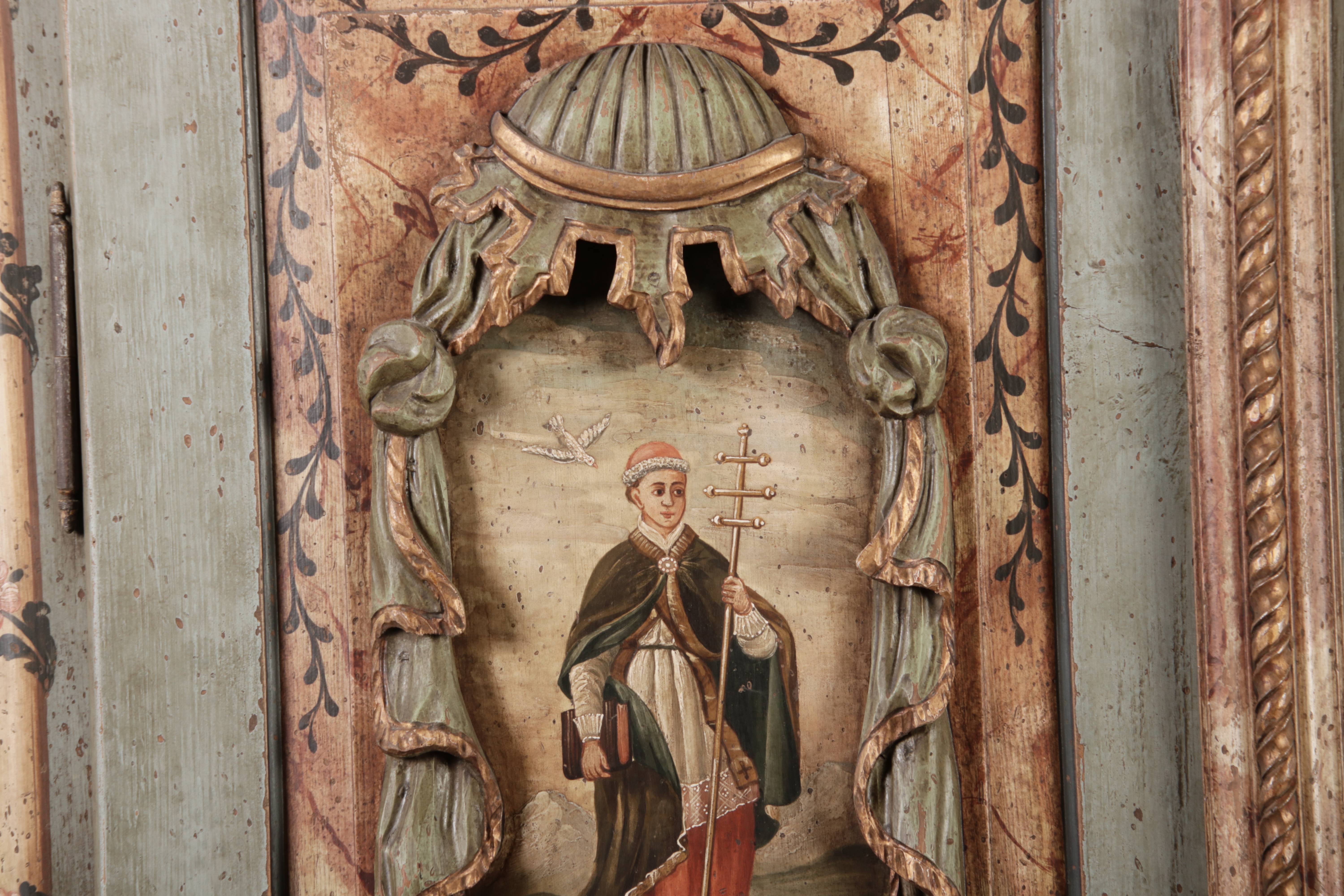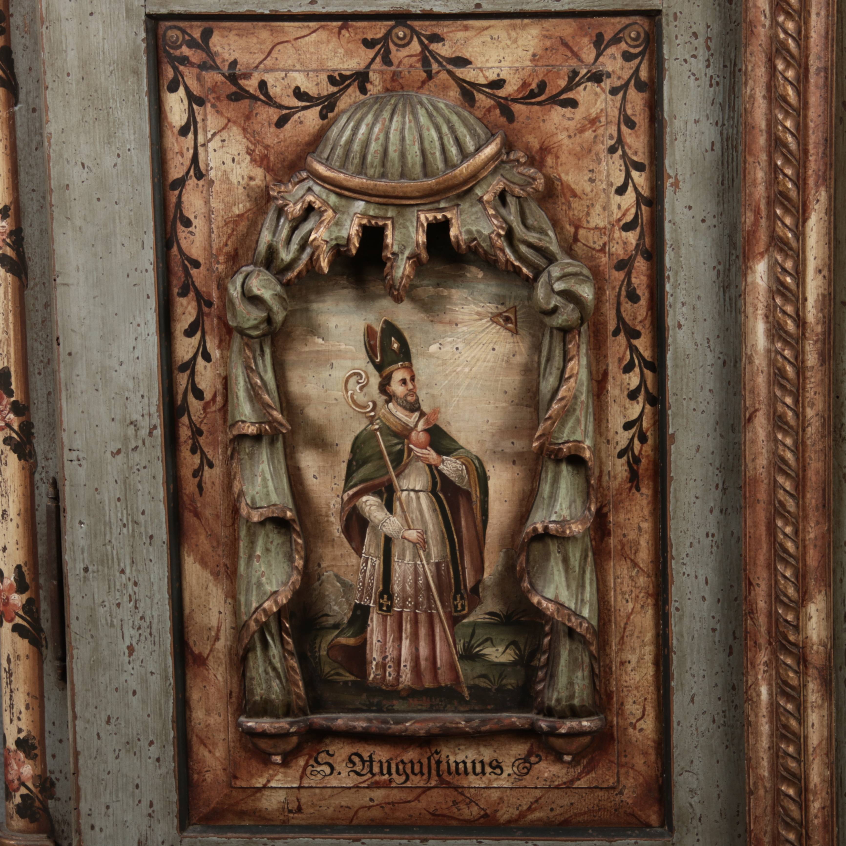 Barockschrank aus dem 19 Jh. mit aufwendig geschnitzten Türfeldern.Die vier Felder mit Schnitzwerk und Darstellungen von S. Gregorius, S. Ambrosius, S. Augustinus und S. Hieronymus