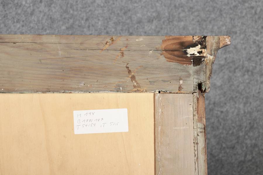 Masse/dimensions: Höhe/Height ca. 198 cm, Breite Korpus/Broad Boda ca. 177 cm, Breite Gesims/Broad cornice ca. 187 cm, Tiefe Korpus/Deep body ca. 54 cm, Tiefe Gesims/Deep cornice ca. 59 cm,