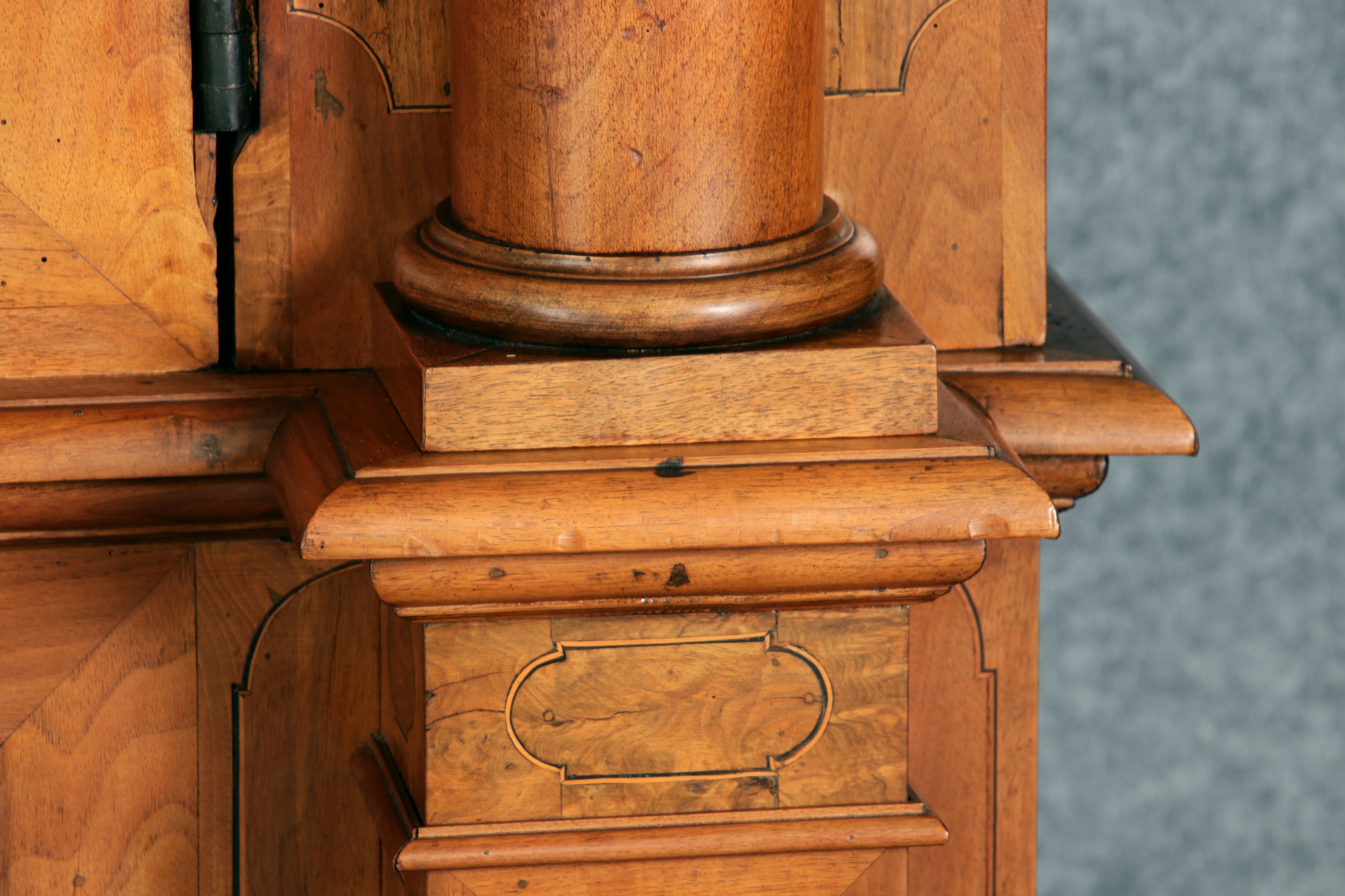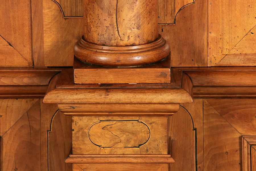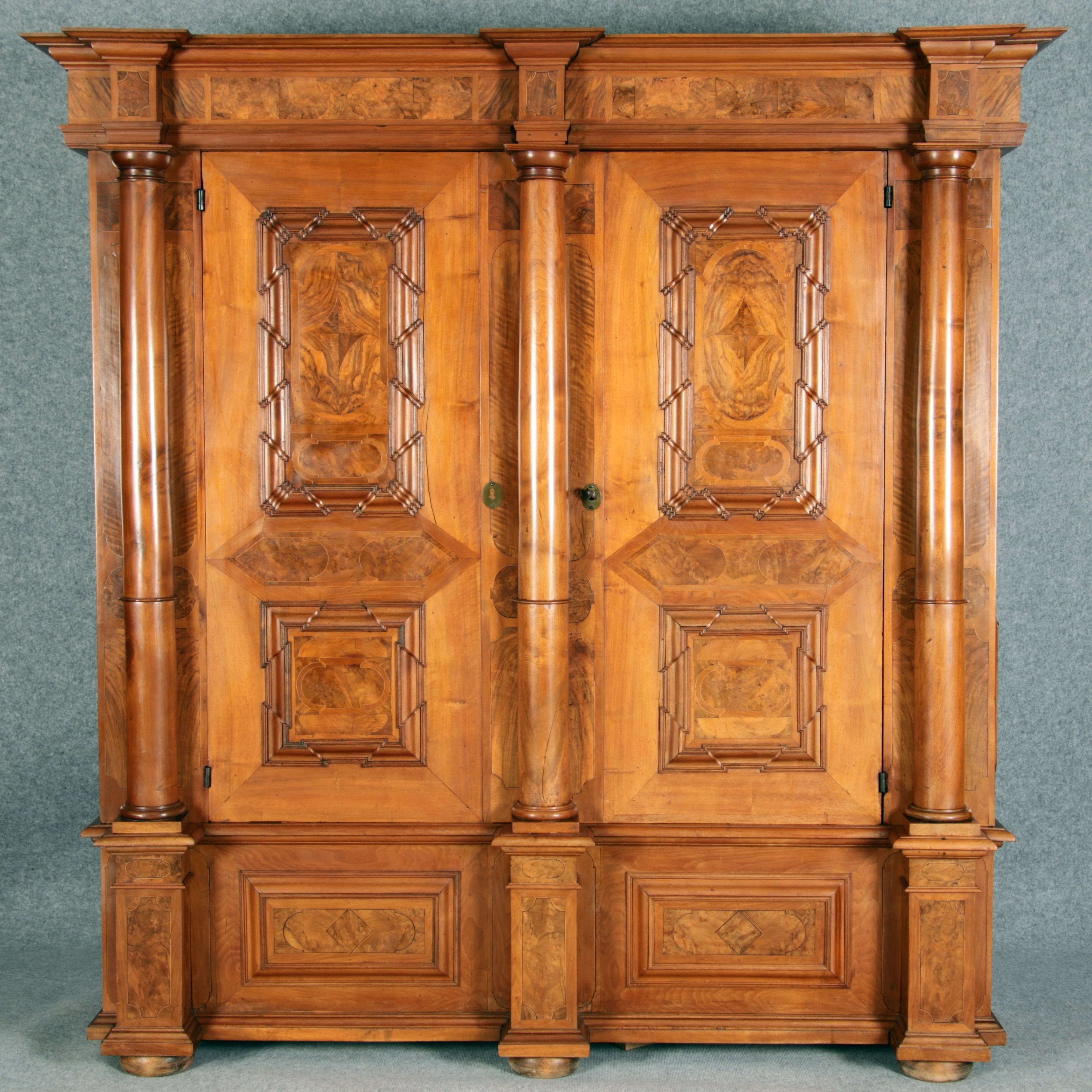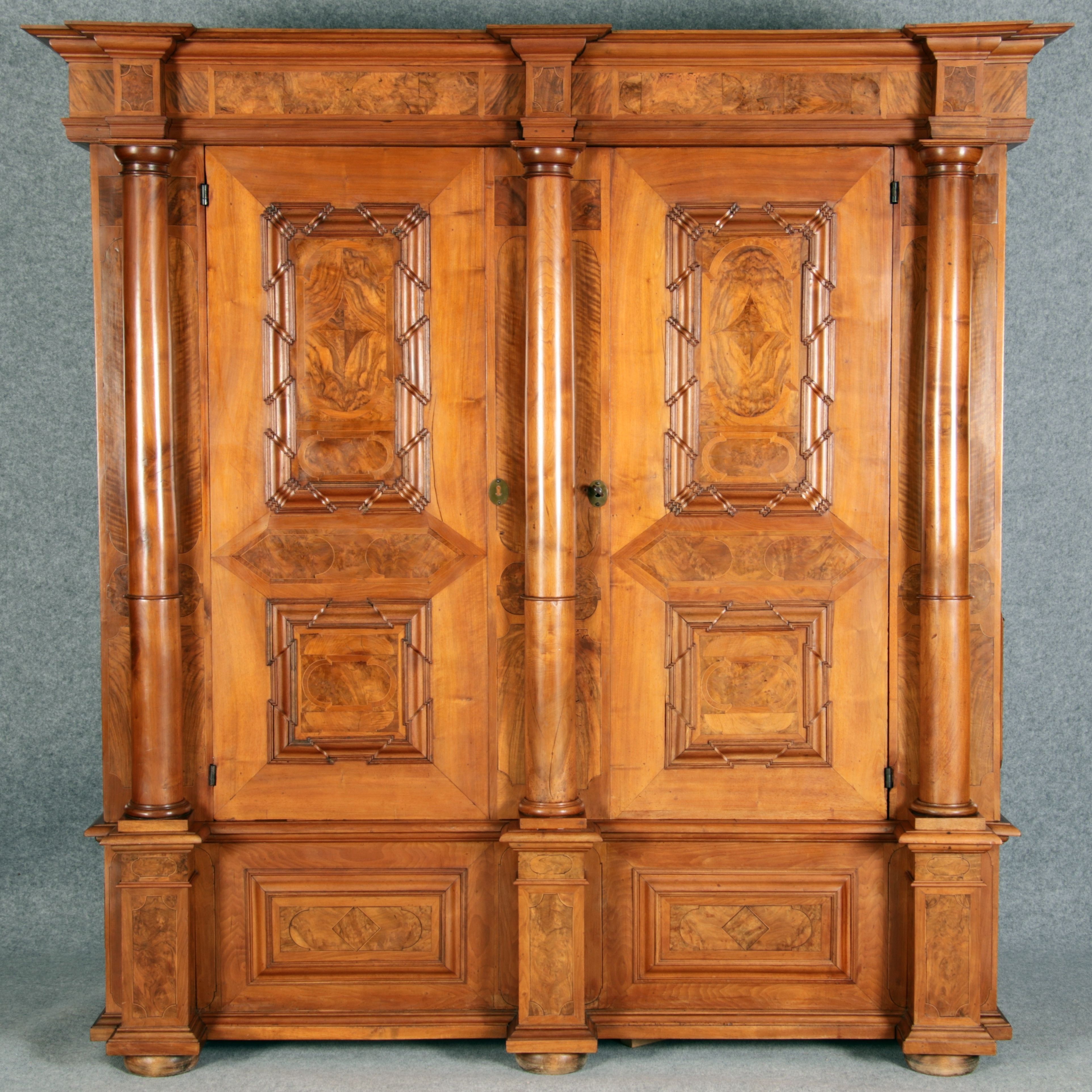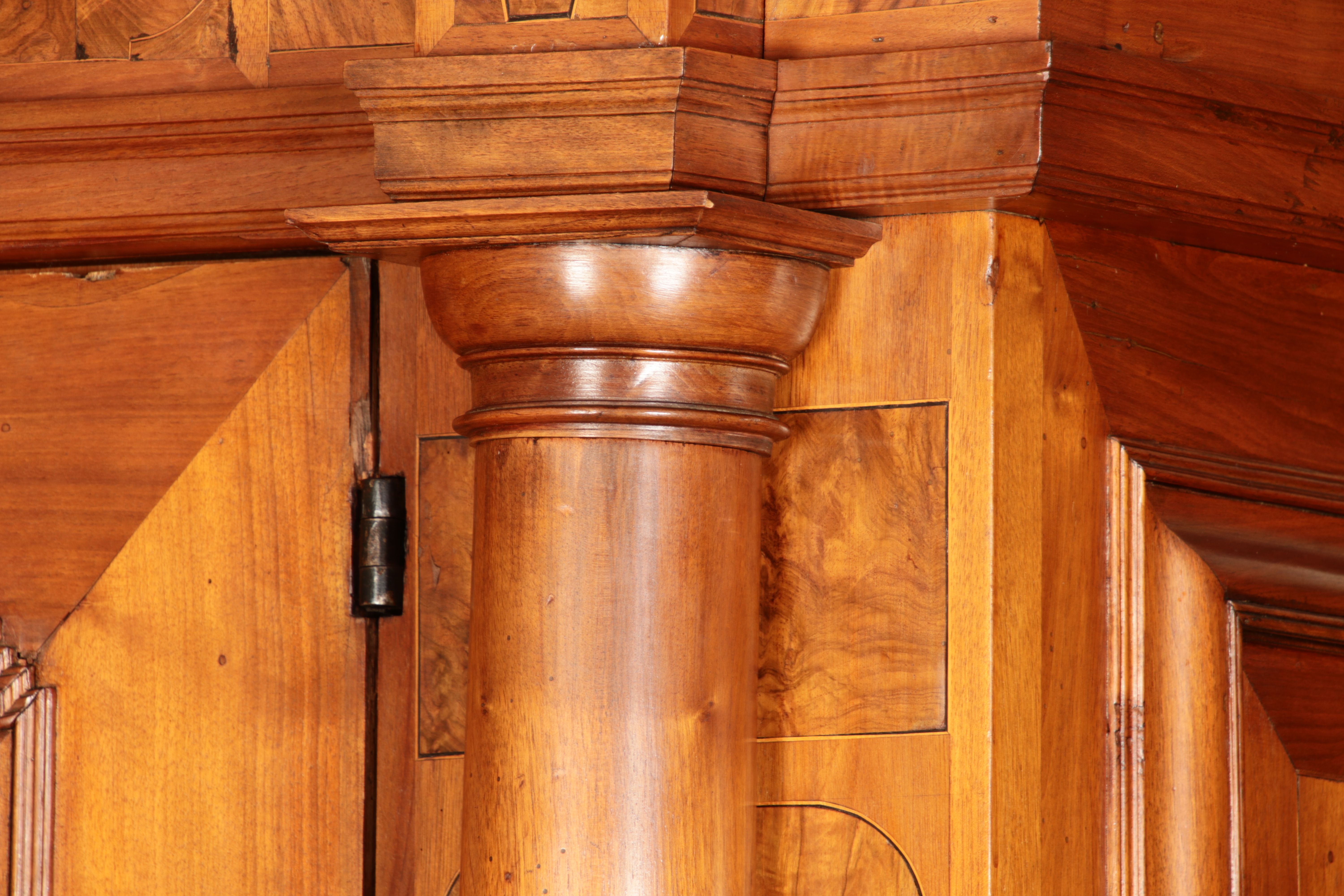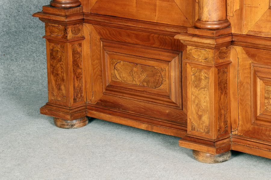 mit drei massiven großen Säulen Kassetenfüllungen und Einlegearbeiten.
