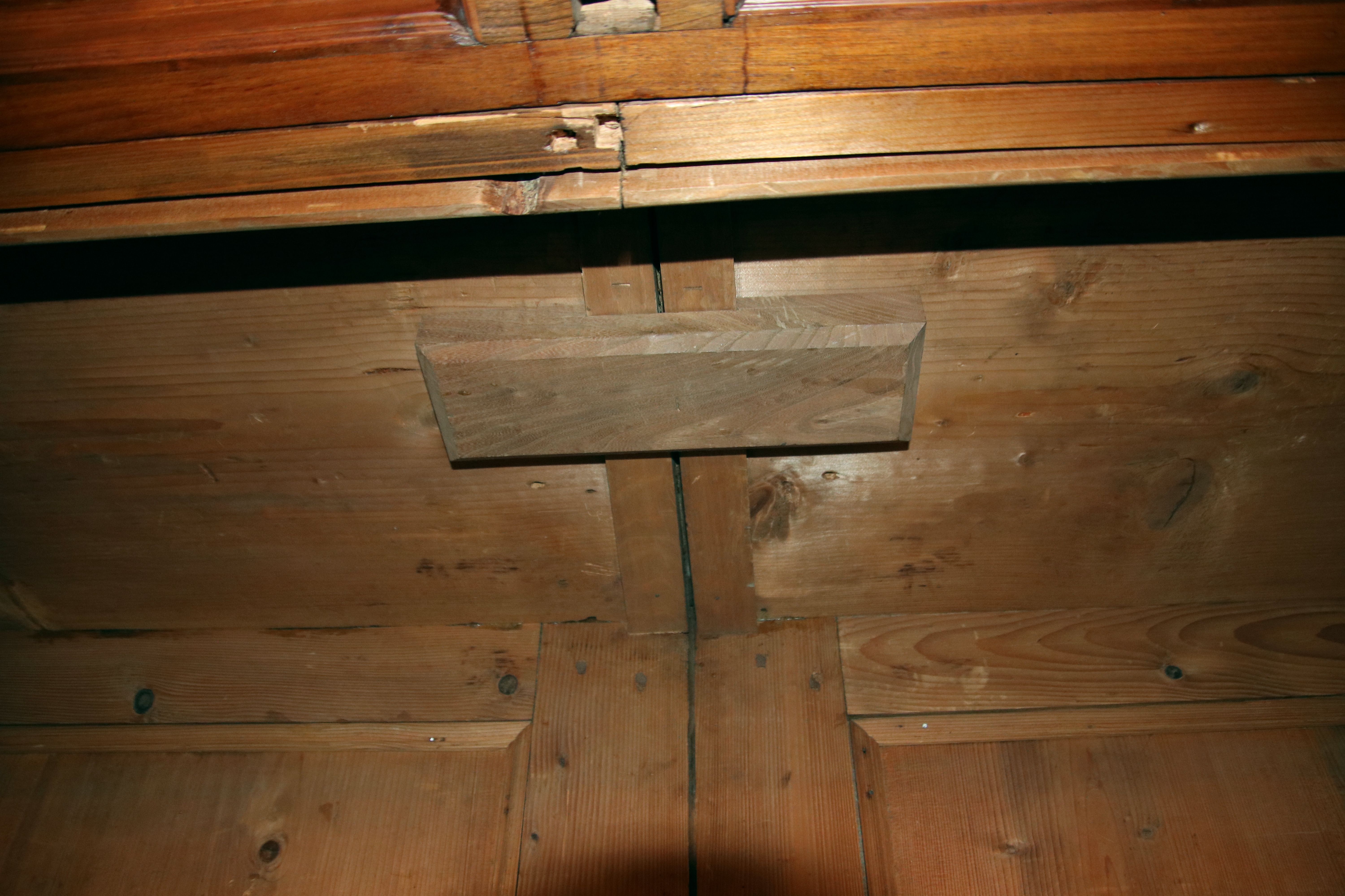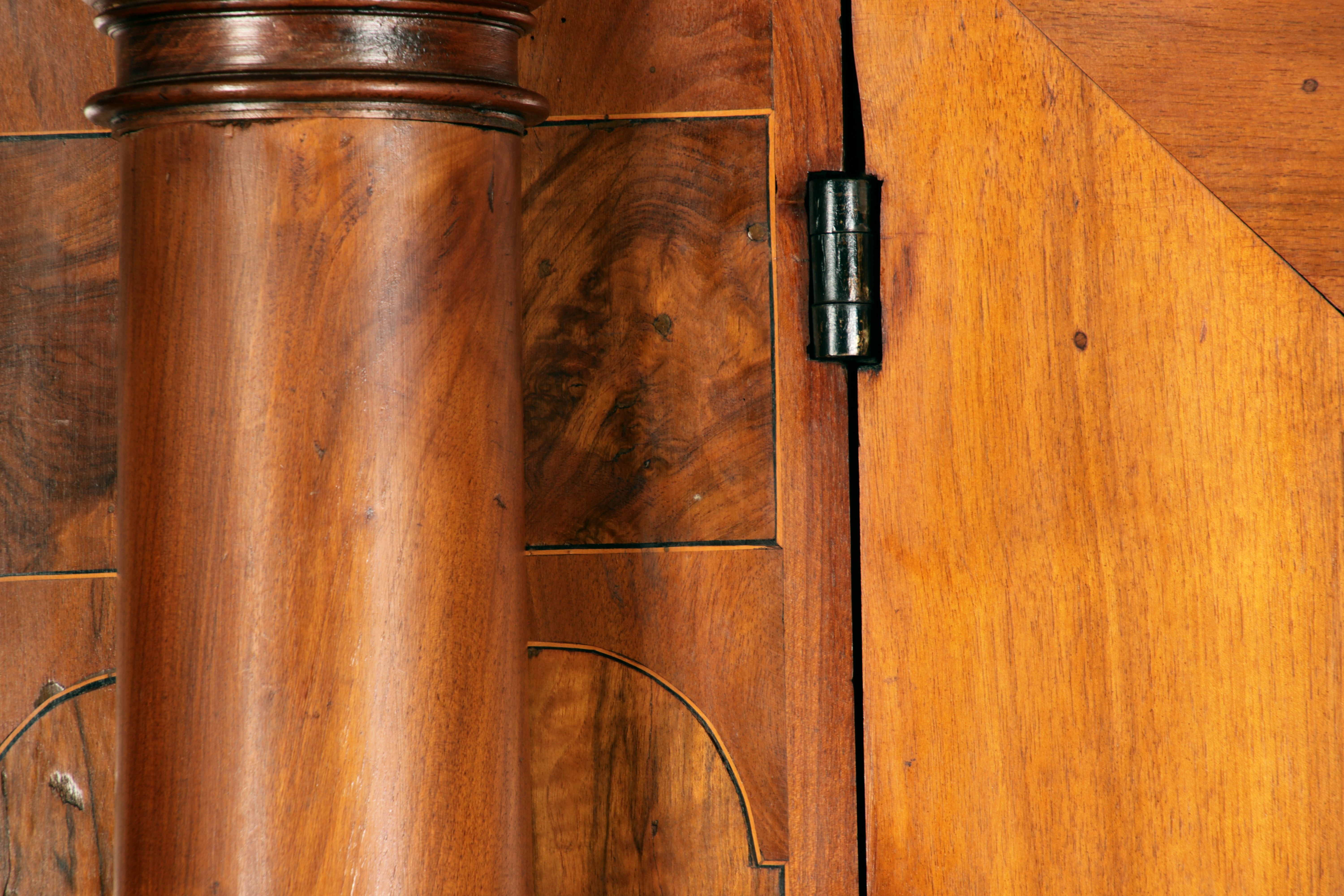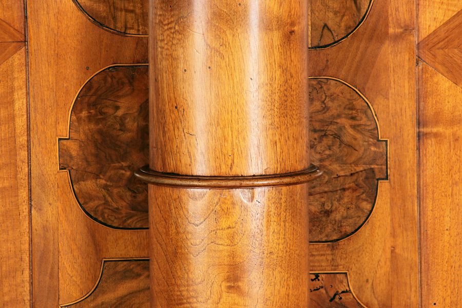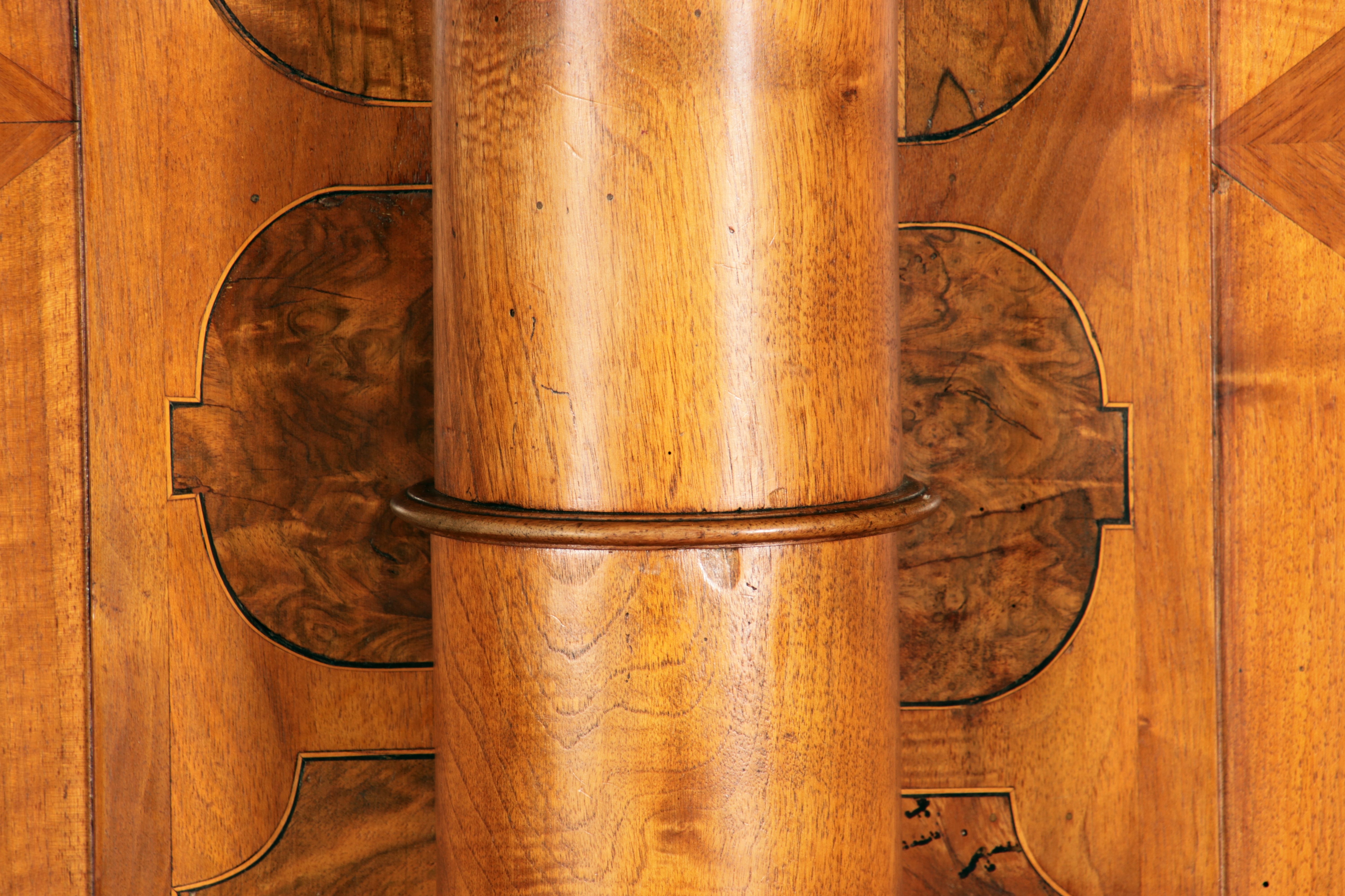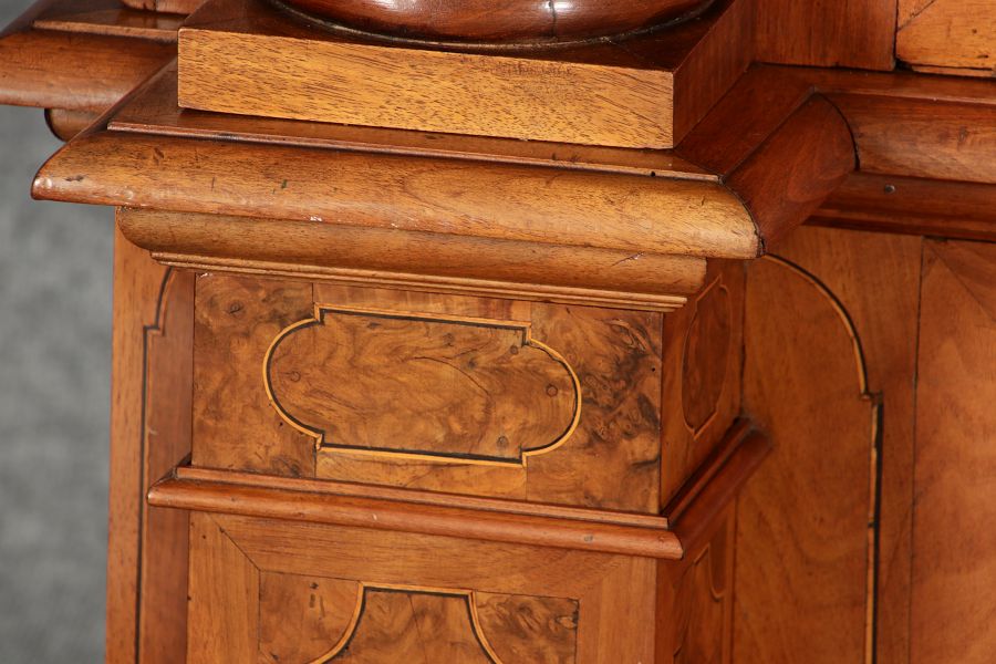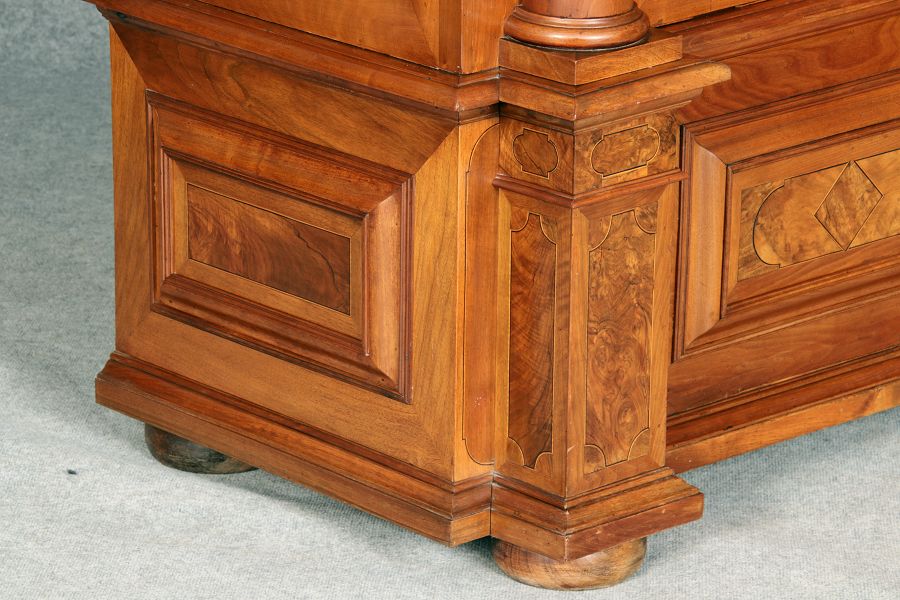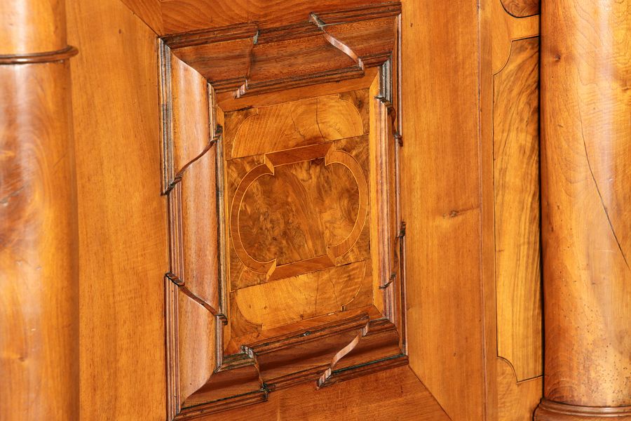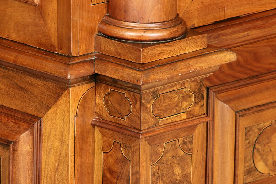 mit drei massiven großen Säulen Kassetenfüllungen und Einlegearbeiten.