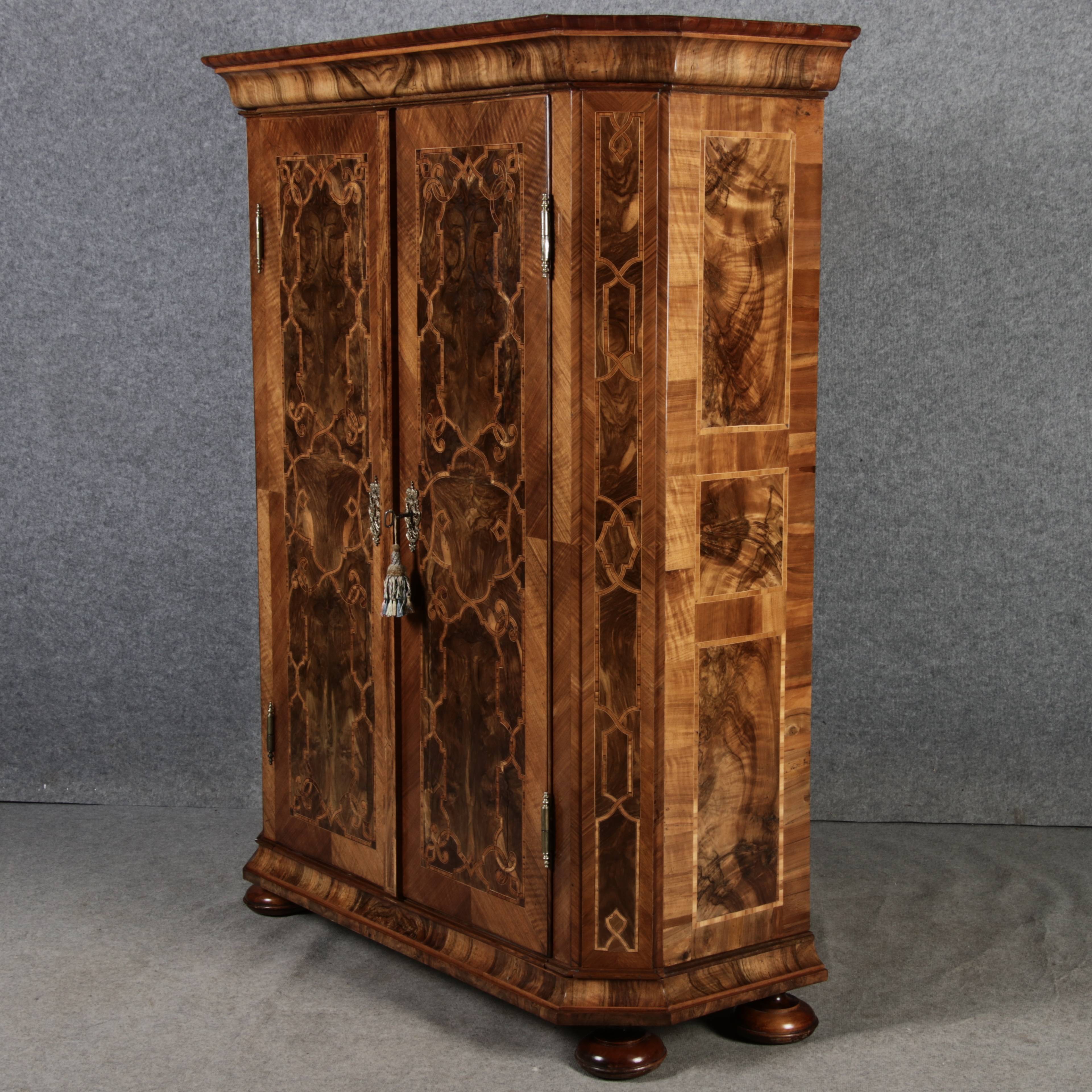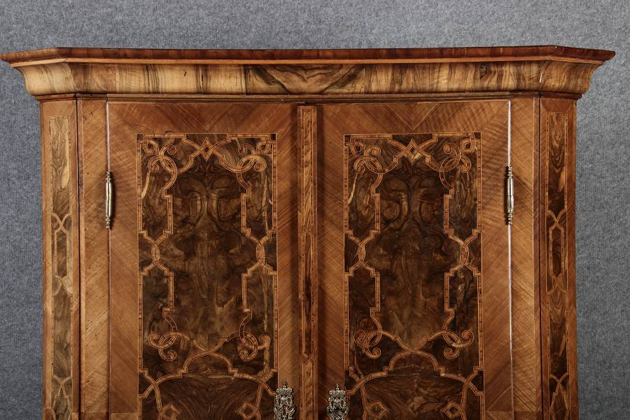 Masse/dimensions: Höhe/Height ca. 190 cm, Breite Korpus/Broad Boda ca. 140 cm, Breite Gesims/Broad cornice ca. 157 cm, Tiefe Korpus/Deep body ca. 48 cm, Tiefe Gesims/Deep cornice ca. 58 cm,