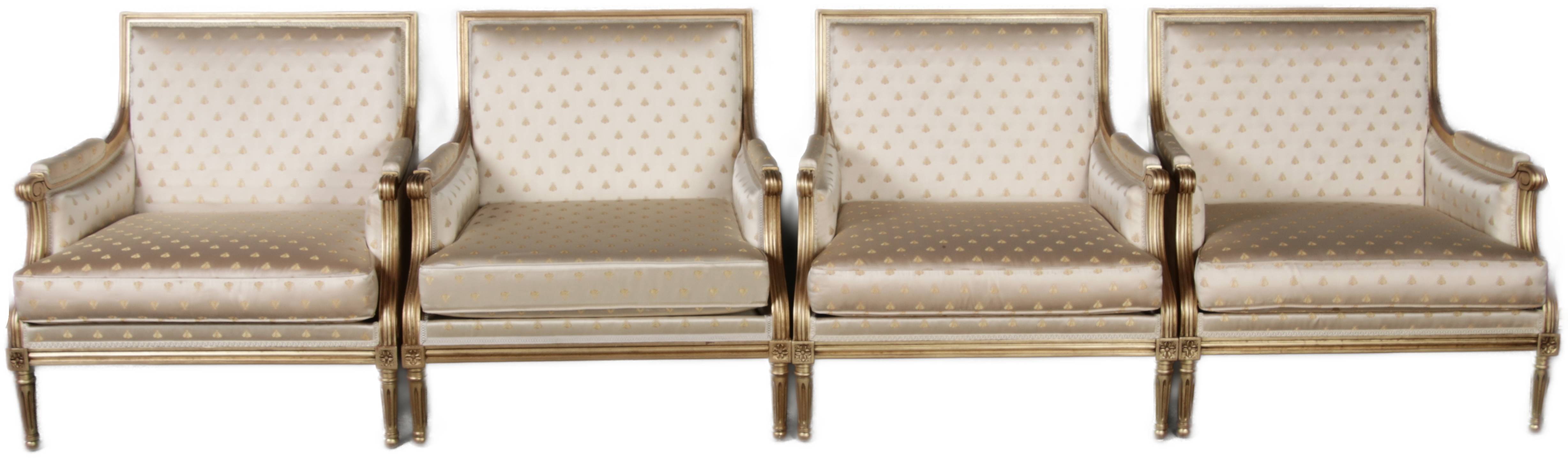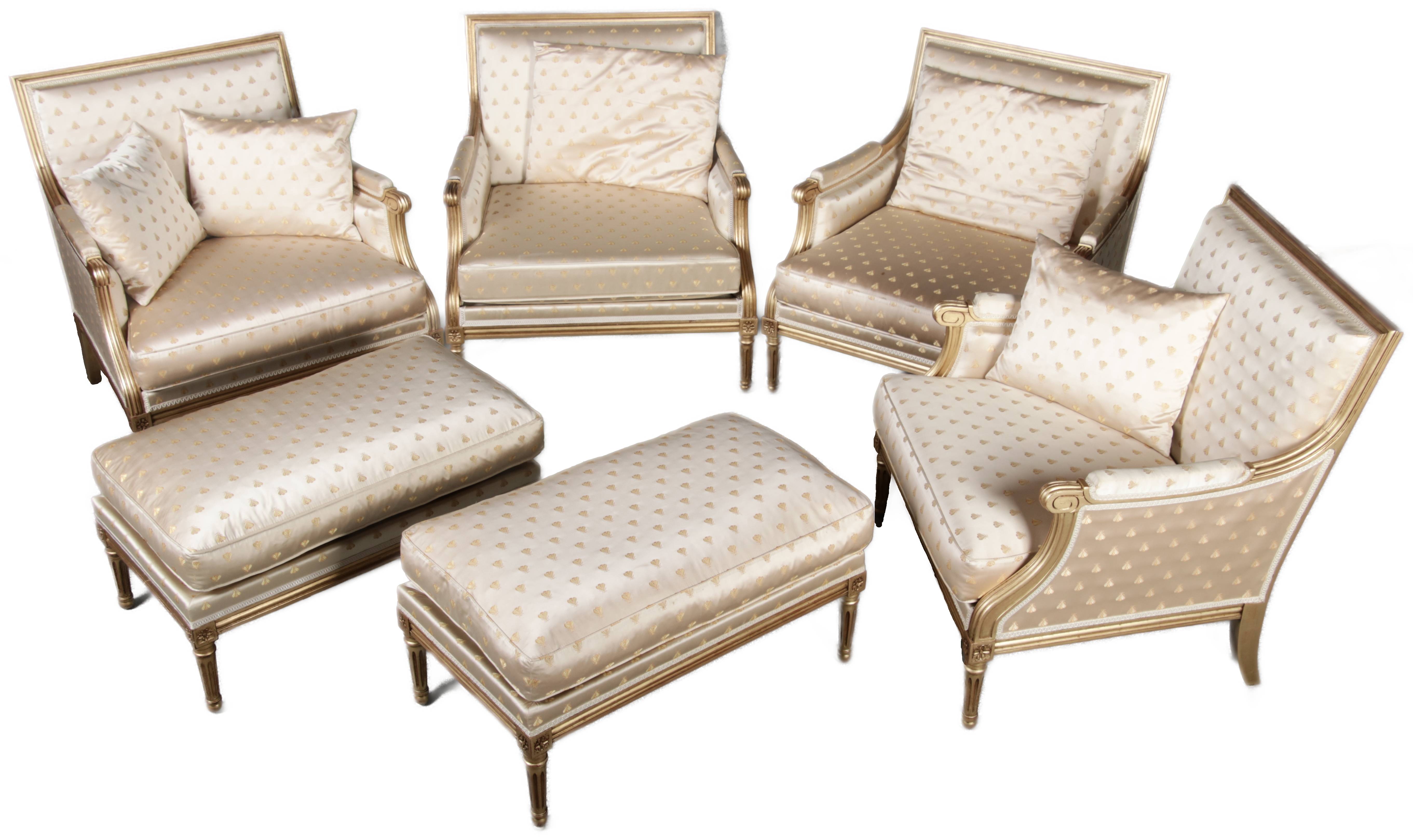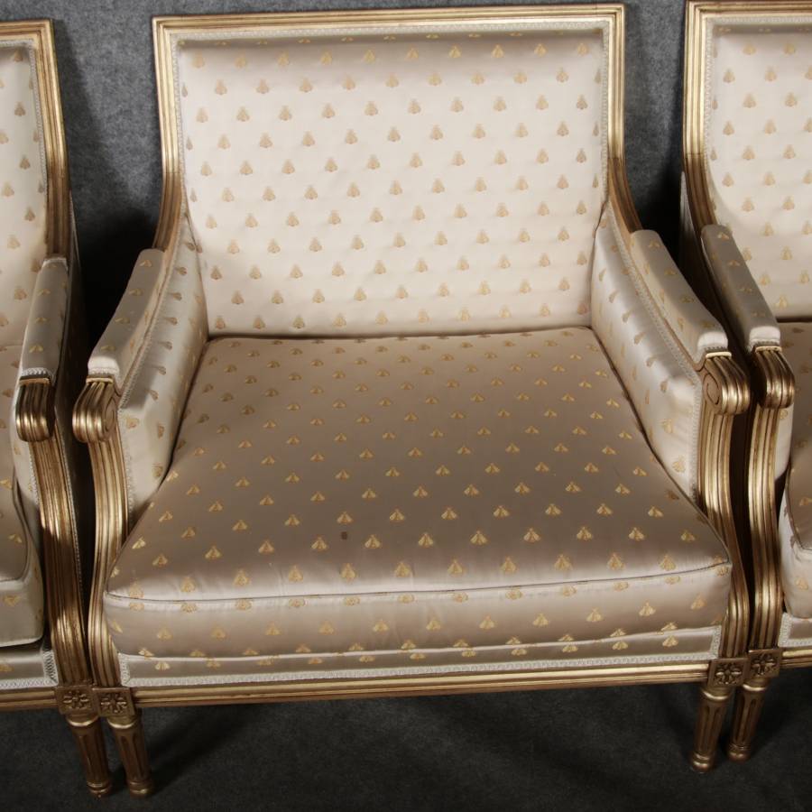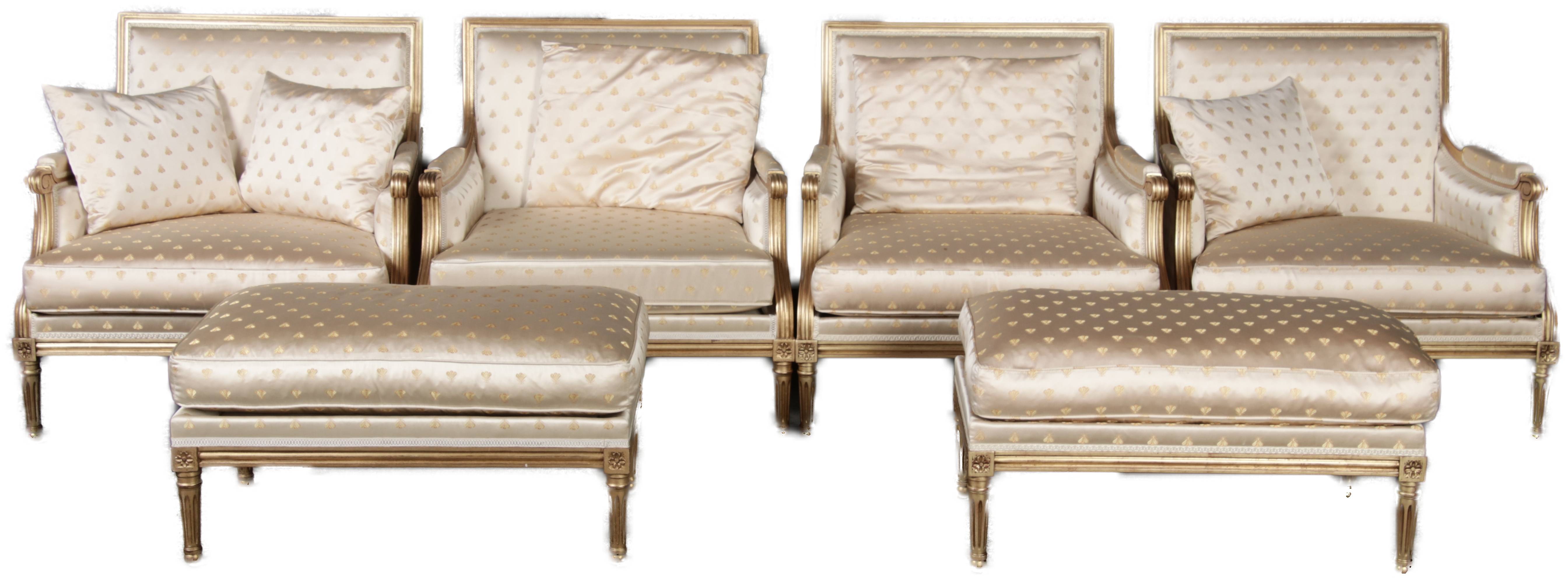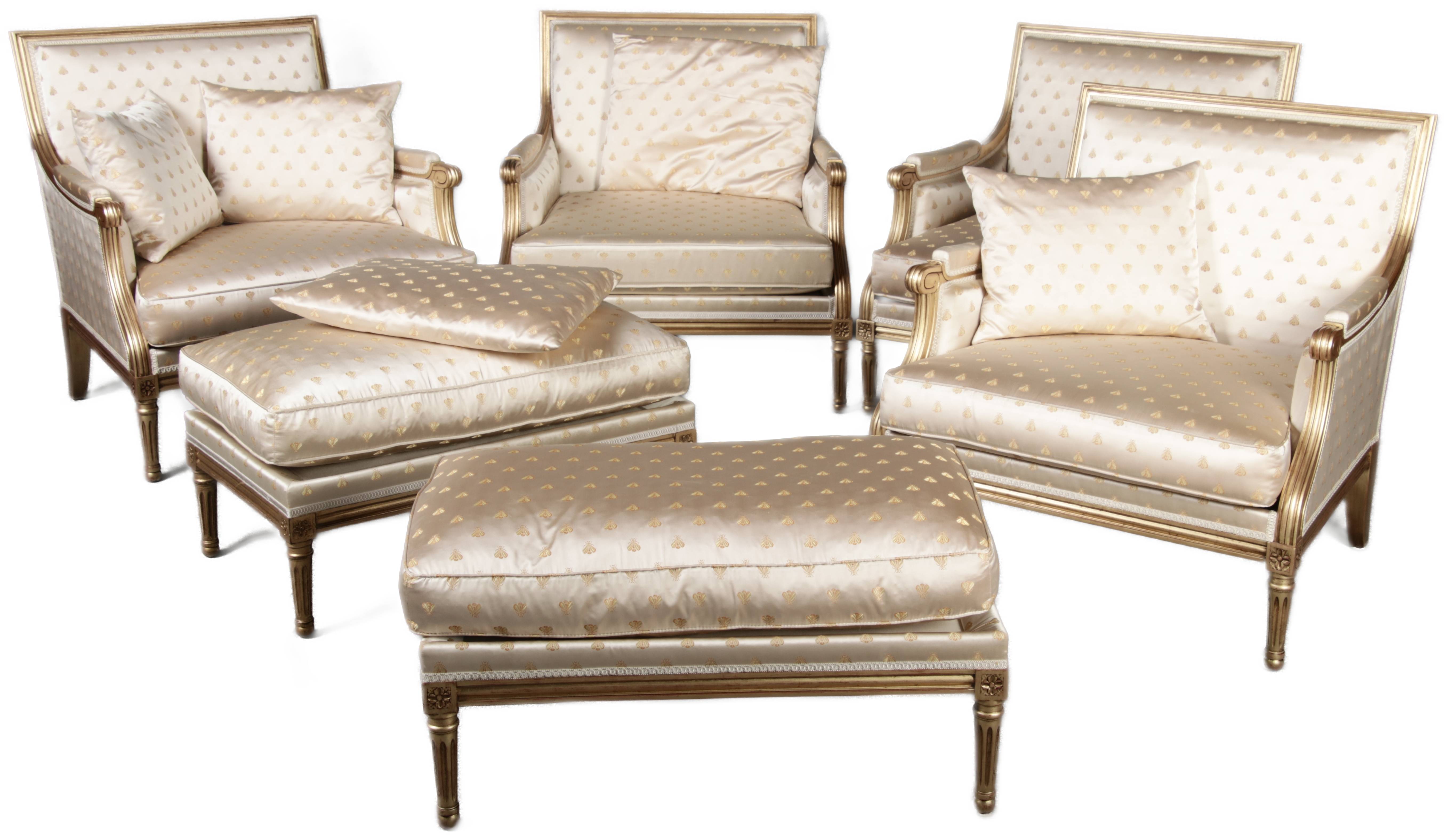 Exklusive Sitzgruppe im Louis-XVI-Stil – Pierre Counot Blandin, Frankreich Diese außergewöhnliche, gepolsterte Sitzgruppe besteht aus vier vergoldeten Bergères sowie zwei passenden Bänken und wurde von der renommierten französischen Manufaktur Pierre Counot Blandin gefertigt. Die Möbel sind im eleganten Louis-XVI-Stil gehalten und überzeugen durch ihre klassische Linienführung, hochwertige Materialien und exzellente handwerkliche Verarbeitung. Die Sitzgruppe befindet sich insgesamt in sehr gutem Zustand. Lediglich minimale, Flecken sind vorhanden, siehe Bilder. Die Bezüge sind abziehbar und waschbar, was sowohl Pflegeleichtigkeit als auch Alltagstauglichkeit gewährleistet. Die Polsterung der Kissen von den Sitzbänken sowie die Kissen – vermutlich mit Daunenfedern gefüllt – sorgt für außergewöhnlichen Sitzkomfort. Aufgrund der Ausführung ist davon auszugehen, dass es sich um eine Sonderanfertigung handelt, da diese Sitzgruppe in dieser Form nicht im aktuellen Katalog von Counot Blandin gelistet ist. Vergleichbare Modelle sind jedoch im Herstellerkatalog zu finden. Bereits auf den ersten Blick wird deutlich, dass es sich um handgefertigte Möbel von höchster Qualität handelt. Die Sitzgruppe stammt von