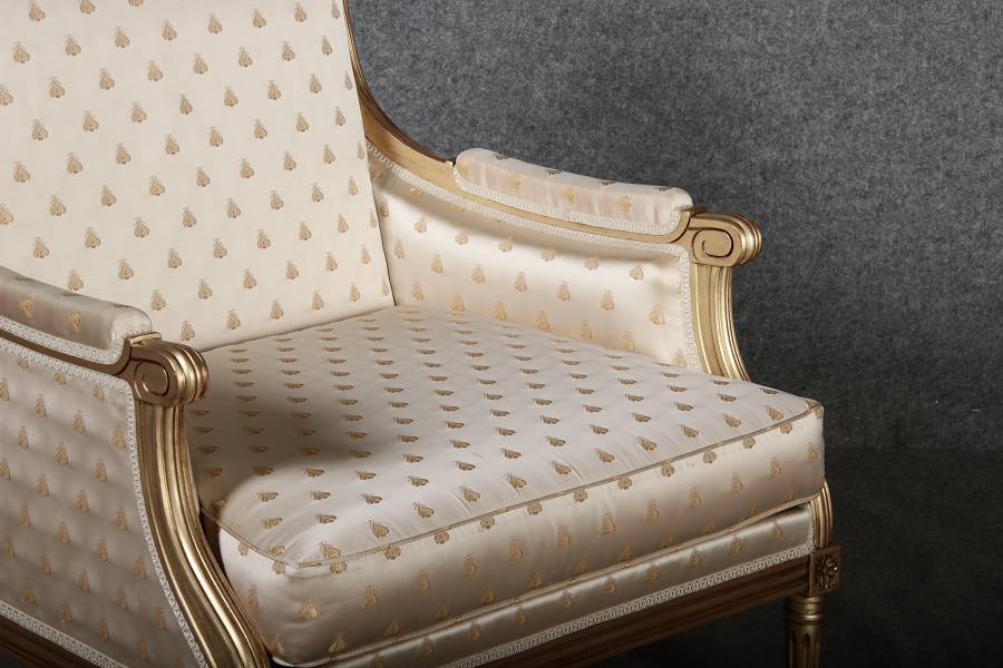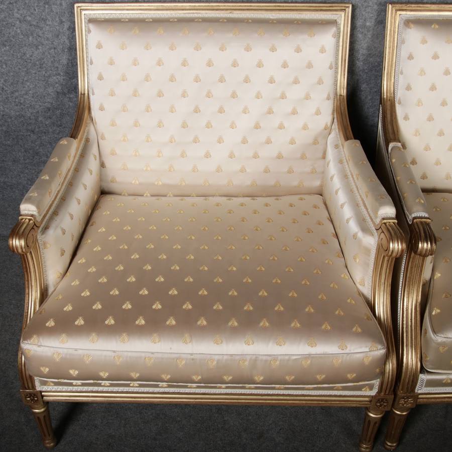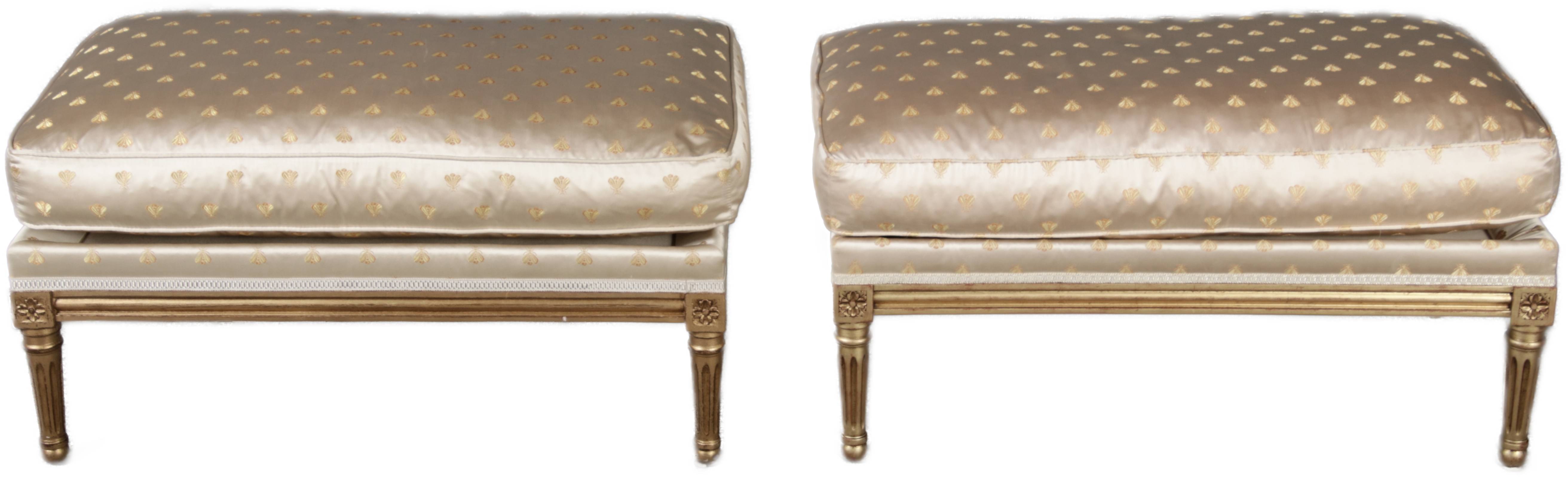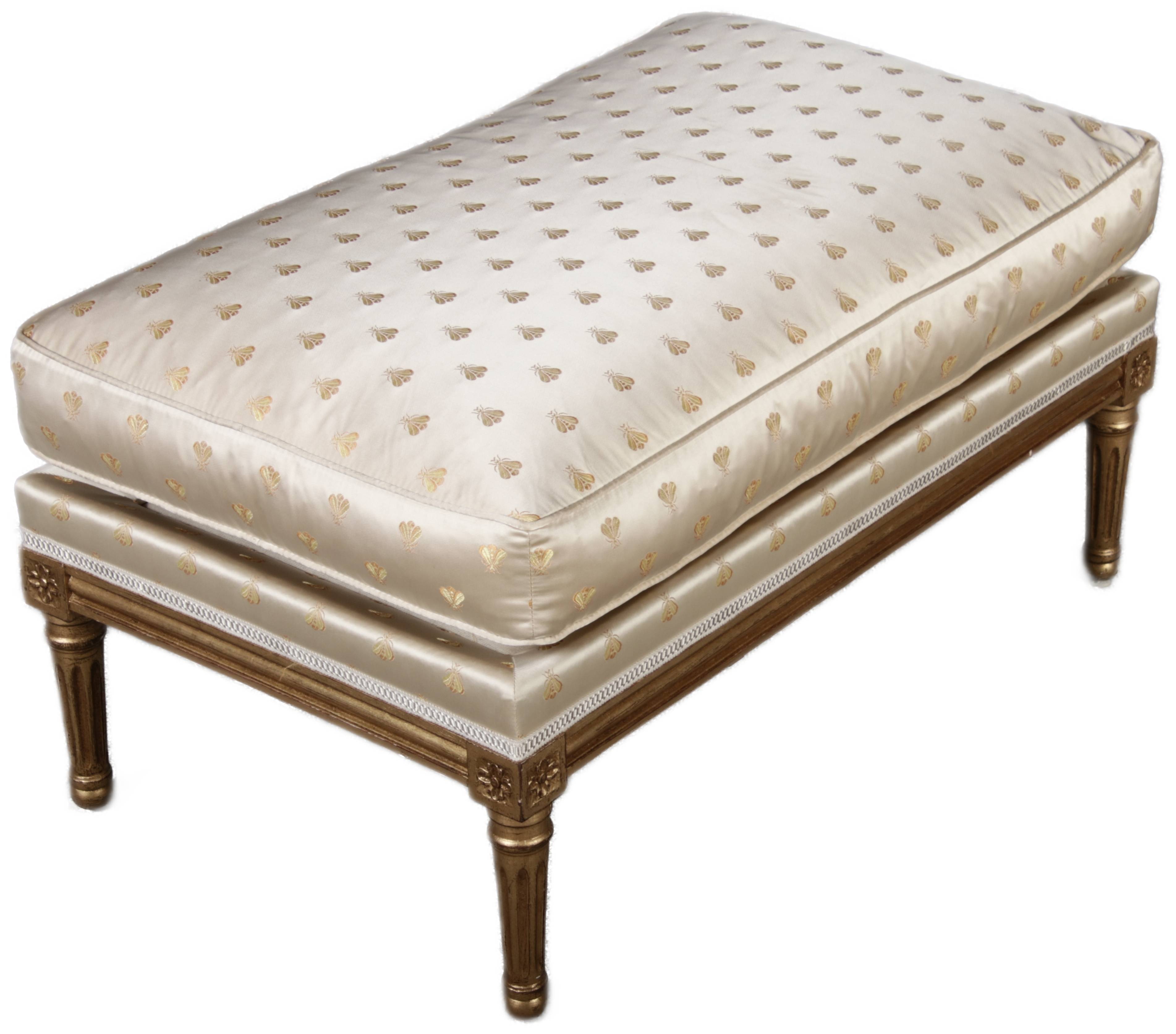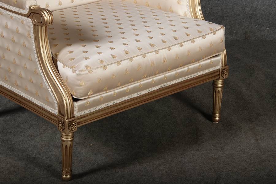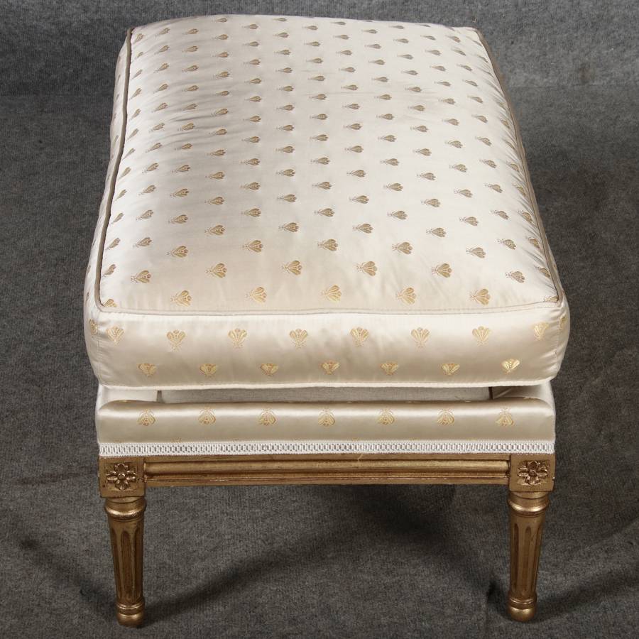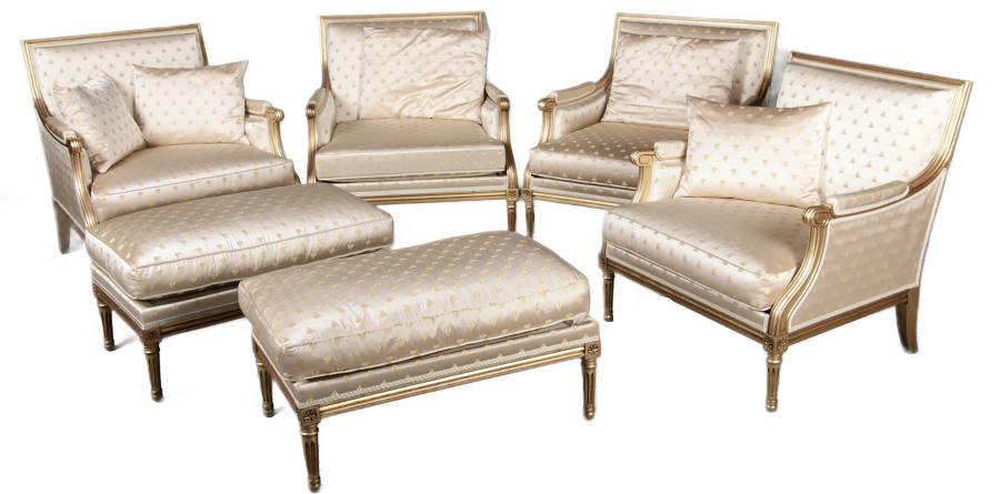 Exklusive Sitzgruppe im Louis-XVI-Stil – Pierre Counot Blandin, Frankreich Diese außergewöhnliche, gepolsterte Sitzgruppe besteht aus vier vergoldeten Bergères sowie zwei passenden Bänken und wurde von der renommierten französischen Manufaktur Pierre Counot Blandin gefertigt. Die Möbel sind im eleganten Louis-XVI-Stil gehalten und überzeugen durch ihre klassische Linienführung, hochwertige Materialien und exzellente handwerkliche Verarbeitung. Die Sitzgruppe befindet sich insgesamt in sehr gutem Zustand. Lediglich minimale, Flecken sind vorhanden, siehe Bilder. Die Bezüge sind abziehbar und waschbar, was sowohl Pflegeleichtigkeit als auch Alltagstauglichkeit gewährleistet. Die Polsterung der Kissen von den Sitzbänken sowie die Kissen – vermutlich mit Daunenfedern gefüllt – sorgt für außergewöhnlichen Sitzkomfort. Aufgrund der Ausführung ist davon auszugehen, dass es sich um eine Sonderanfertigung handelt, da diese Sitzgruppe in dieser Form nicht im aktuellen Katalog von Counot Blandin gelistet ist. Vergleichbare Modelle sind jedoch im Herstellerkatalog zu finden. Bereits auf den ersten Blick wird deutlich, dass es sich um handgefertigte Möbel von höchster Qualität handelt. Die Sitzgruppe stammt von