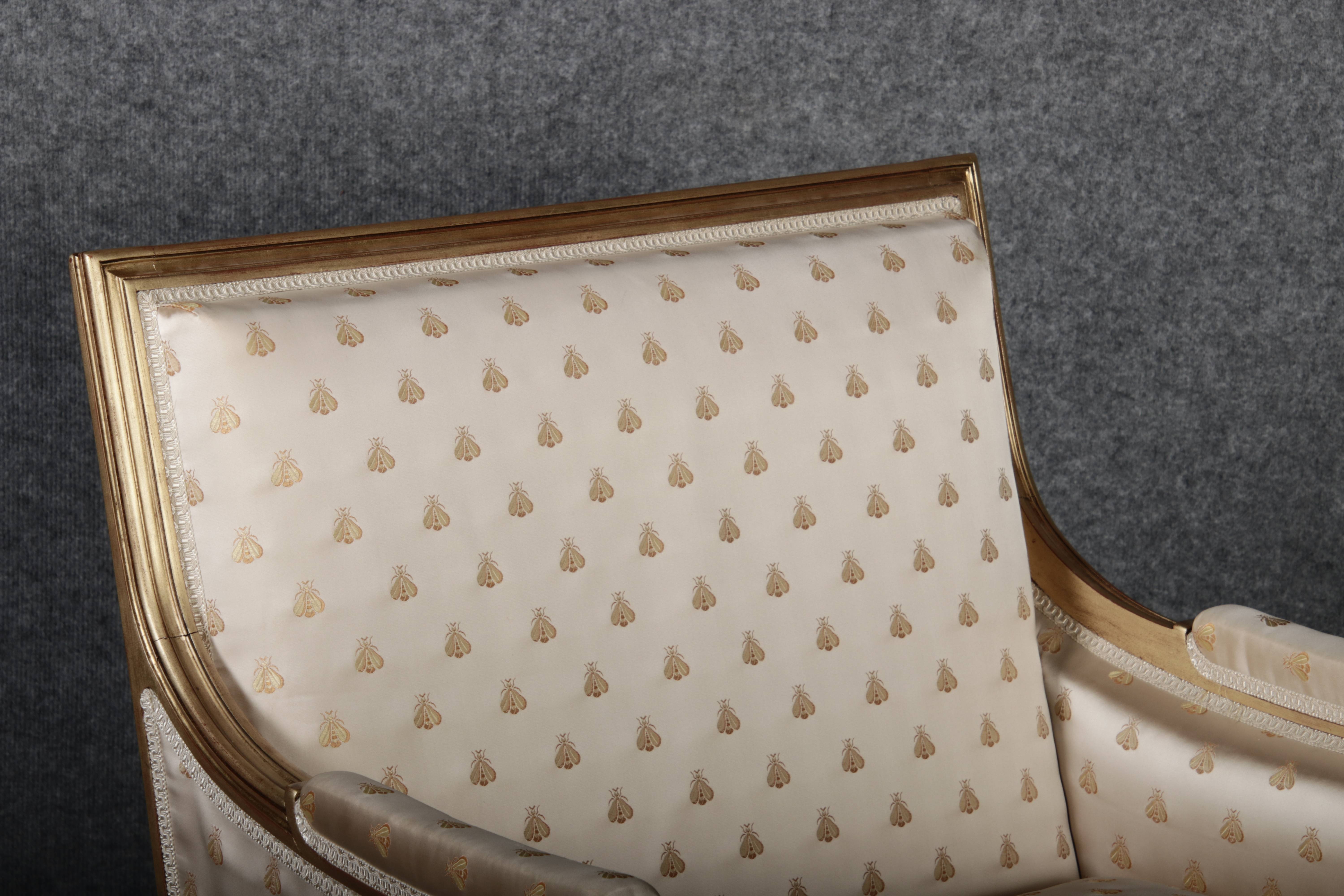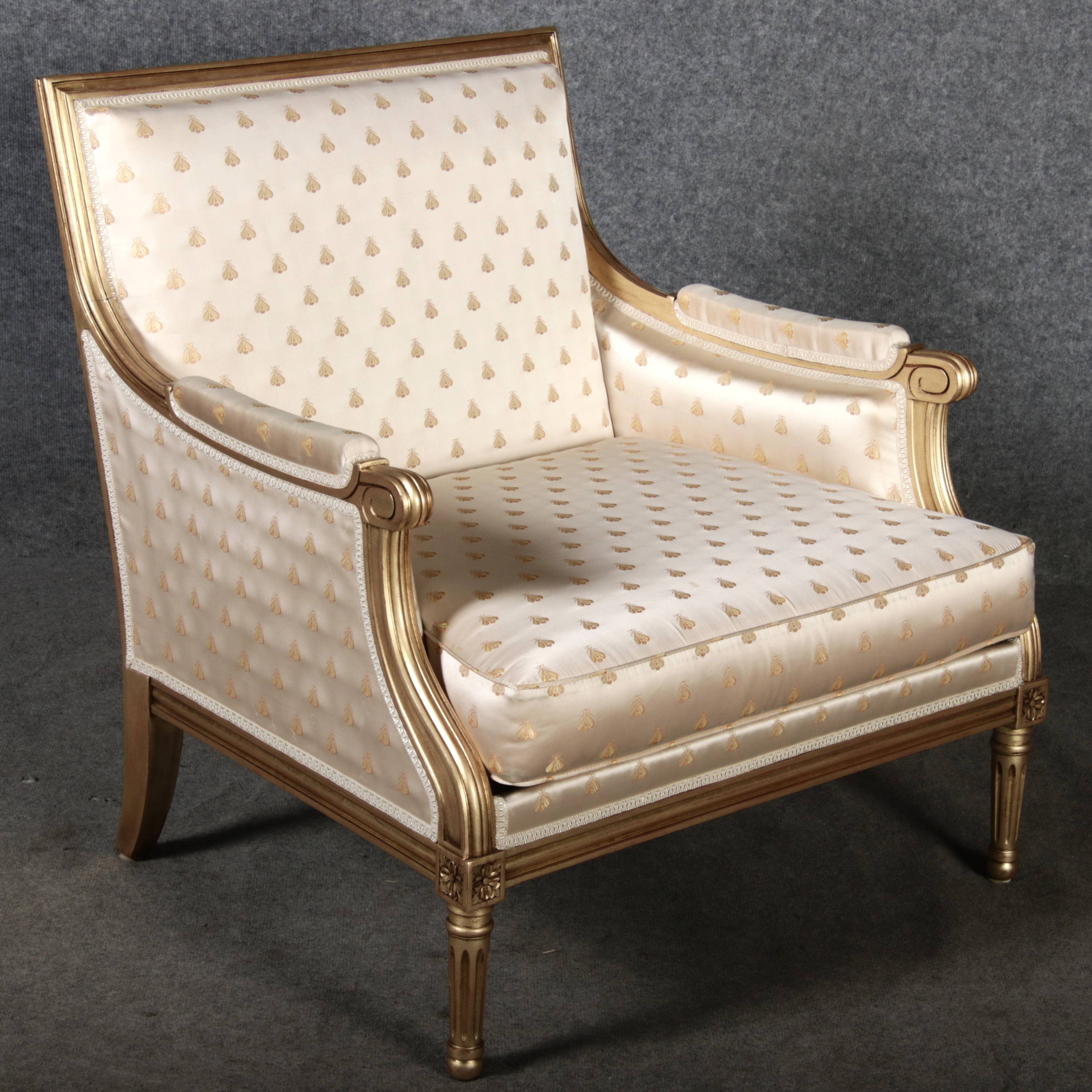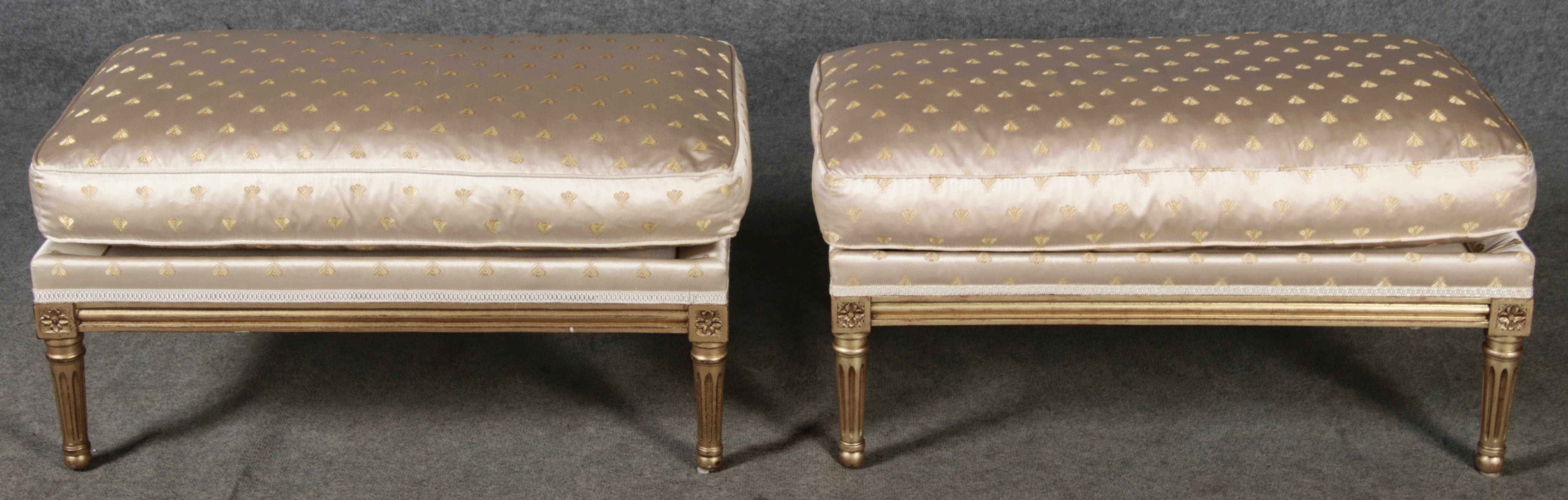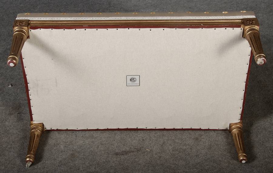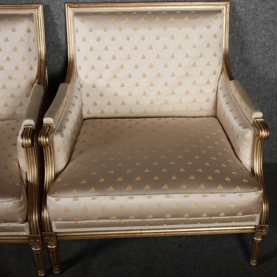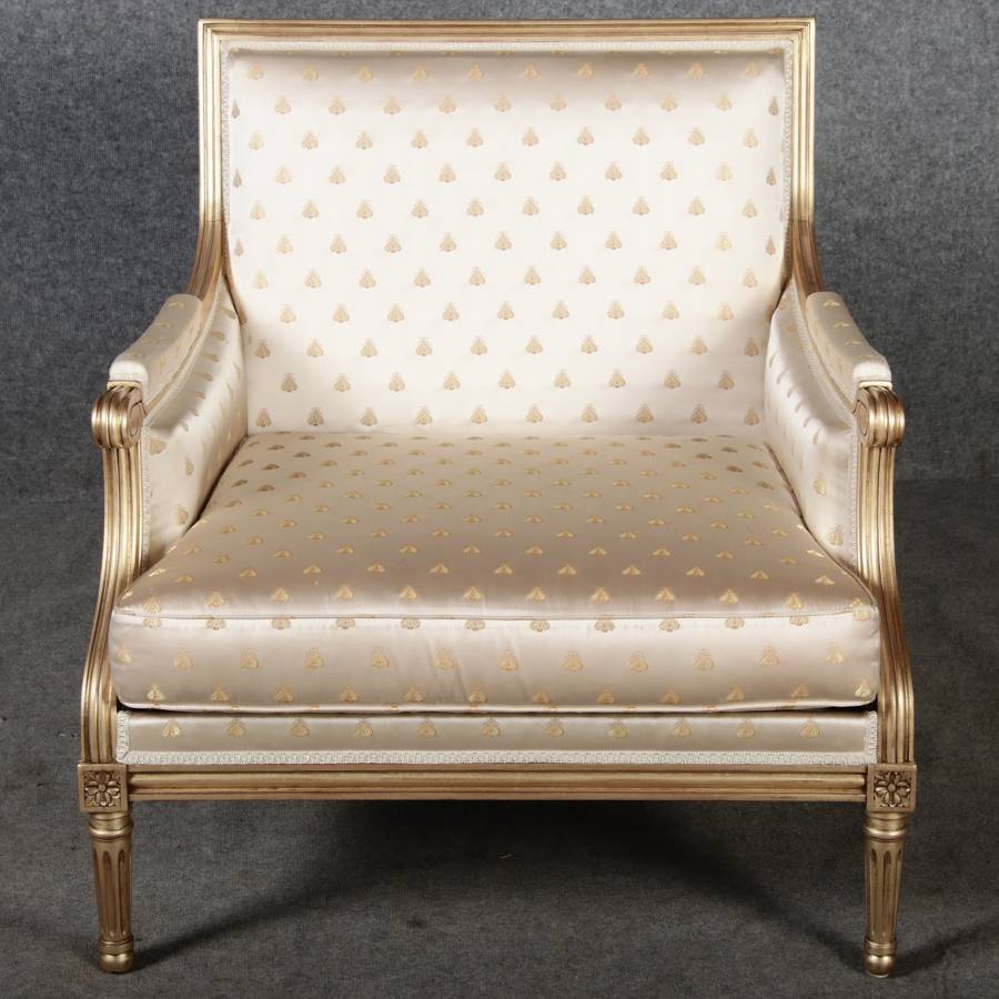Exklusive Sitzgruppe im Louis-XVI-Stil – Pierre Counot Blandin, Frankreich Diese außergewöhnliche, gepolsterte Sitzgruppe besteht aus vier vergoldeten Bergères sowie zwei passenden Bänken und wurde von der renommierten französischen Manufaktur Pierre Counot Blandin gefertigt. Die Möbel sind im eleganten Louis-XVI-Stil gehalten und überzeugen durch ihre klassische Linienführung, hochwertige Materialien und exzellente handwerkliche Verarbeitung. Die Sitzgruppe befindet sich insgesamt in sehr gutem Zustand. Lediglich minimale, Flecken sind vorhanden, siehe Bilder. Die Bezüge sind abziehbar und waschbar, was sowohl Pflegeleichtigkeit als auch Alltagstauglichkeit gewährleistet. Die Polsterung der Kissen von den Sitzbänken sowie die Kissen – vermutlich mit Daunenfedern gefüllt – sorgt für außergewöhnlichen Sitzkomfort. Aufgrund der Ausführung ist davon auszugehen, dass es sich um eine Sonderanfertigung handelt, da diese Sitzgruppe in dieser Form nicht im aktuellen Katalog von Counot Blandin gelistet ist. Vergleichbare Modelle sind jedoch im Herstellerkatalog zu finden. Bereits auf den ersten Blick wird deutlich, dass es sich um handgefertigte Möbel von höchster Qualität handelt. Die Sitzgruppe stammt von