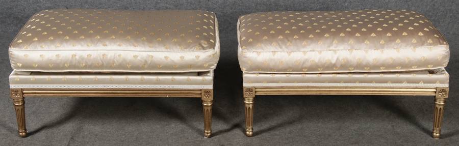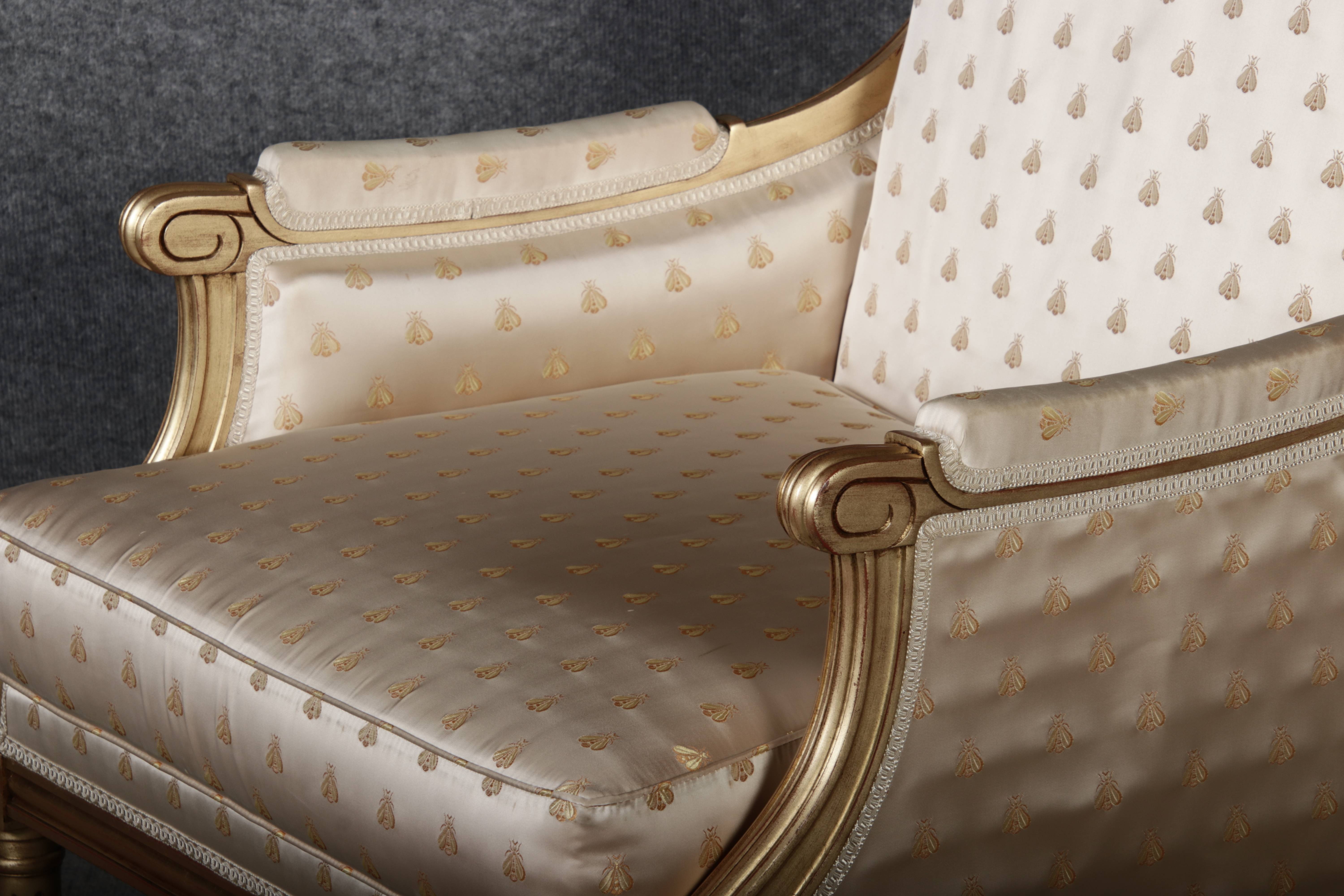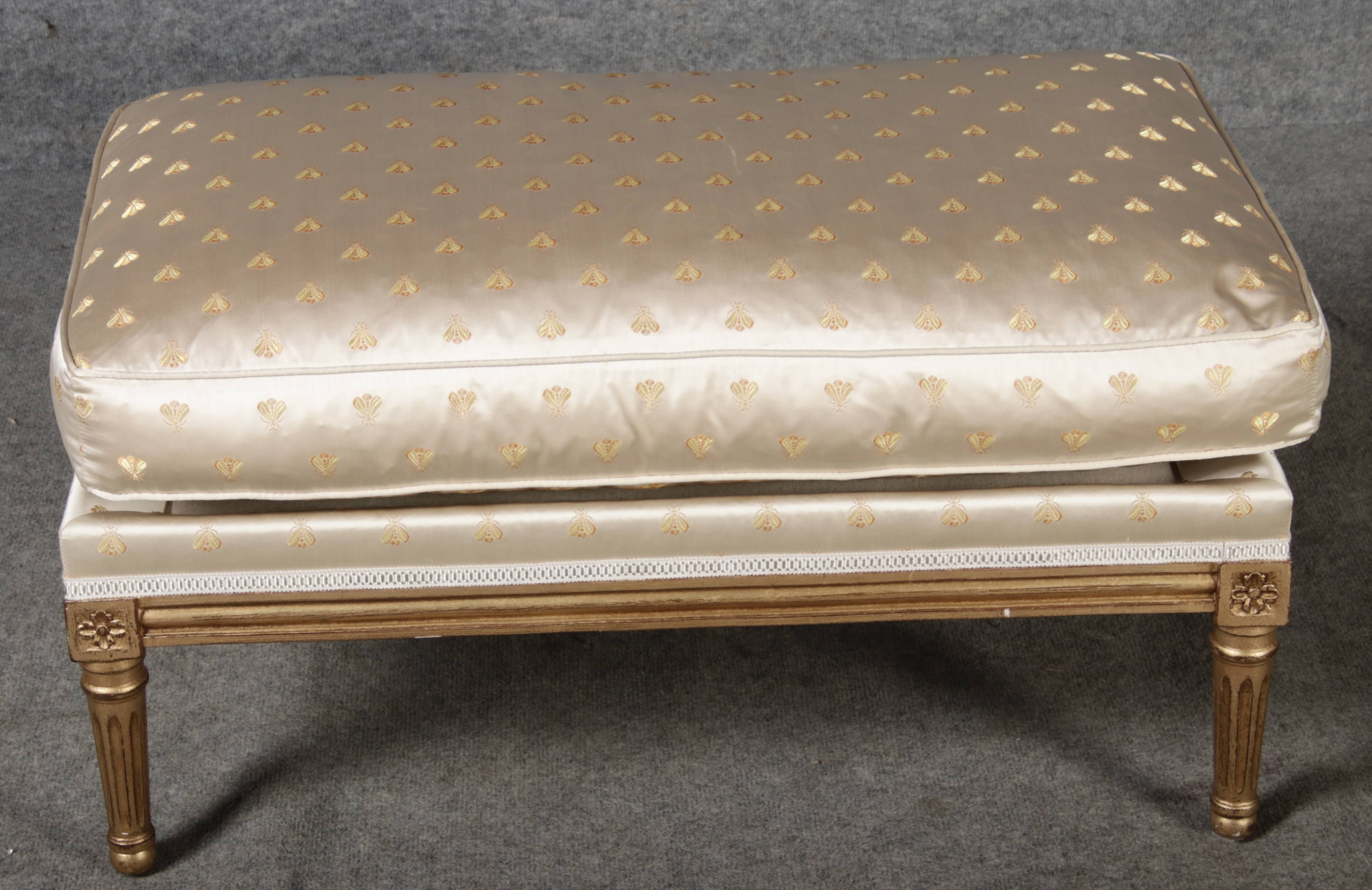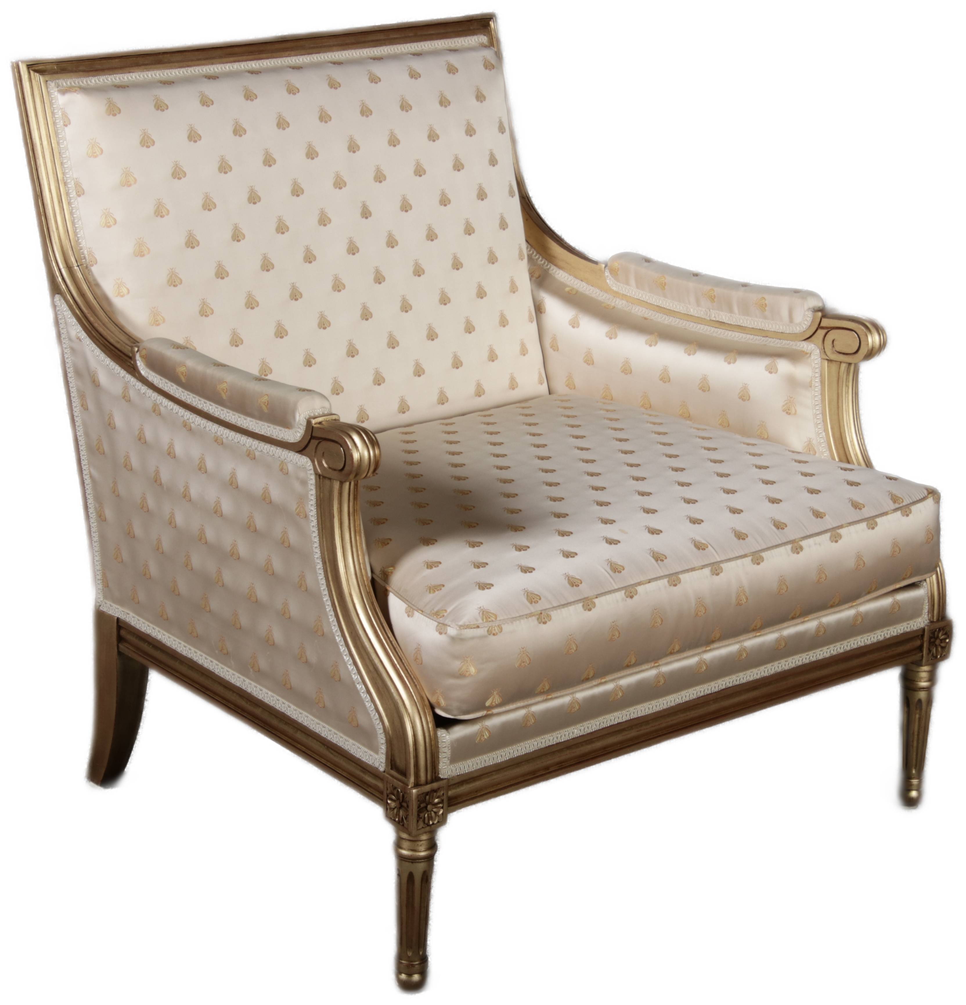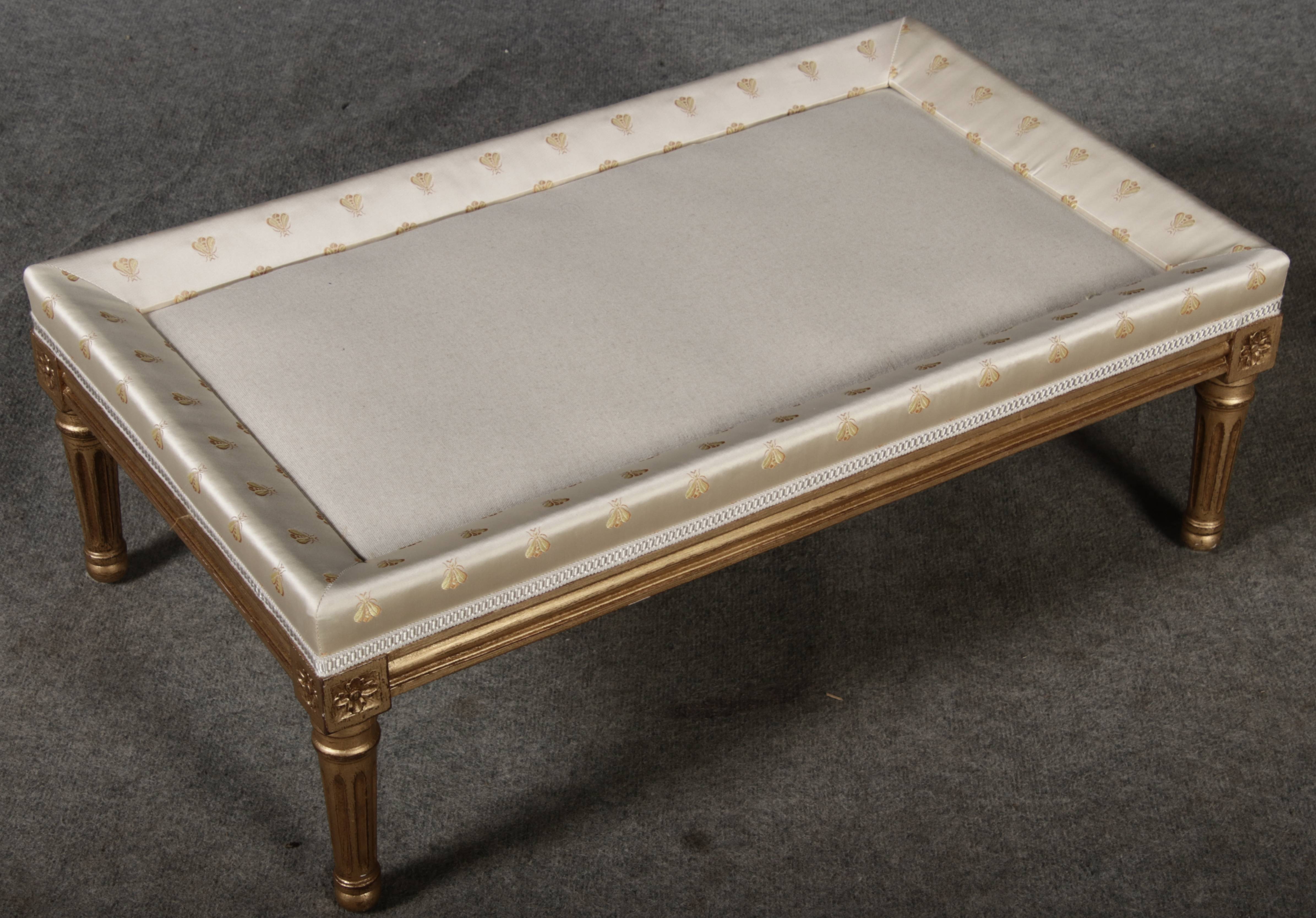 Exklusive Sitzgruppe im Louis-XVI-Stil – Pierre Counot Blandin, Frankreich Diese außergewöhnliche, gepolsterte Sitzgruppe besteht aus vier vergoldeten Bergères sowie zwei passenden Bänken und wurde von der renommierten französischen Manufaktur Pierre Counot Blandin gefertigt. Die Möbel sind im eleganten Louis-XVI-Stil gehalten und überzeugen durch ihre klassische Linienführung, hochwertige Materialien und exzellente handwerkliche Verarbeitung. Die Sitzgruppe befindet sich insgesamt in sehr gutem Zustand. Lediglich minimale, Flecken sind vorhanden, siehe Bilder. Die Bezüge sind abziehbar und waschbar, was sowohl Pflegeleichtigkeit als auch Alltagstauglichkeit gewährleistet. Die Polsterung der Kissen von den Sitzbänken sowie die Kissen – vermutlich mit Daunenfedern gefüllt – sorgt für außergewöhnlichen Sitzkomfort. Aufgrund der Ausführung ist davon auszugehen, dass es sich um eine Sonderanfertigung handelt, da diese Sitzgruppe in dieser Form nicht im aktuellen Katalog von Counot Blandin gelistet ist. Vergleichbare Modelle sind jedoch im Herstellerkatalog zu finden. Bereits auf den ersten Blick wird deutlich, dass es sich um handgefertigte Möbel von höchster Qualität handelt. Die Sitzgruppe stammt von