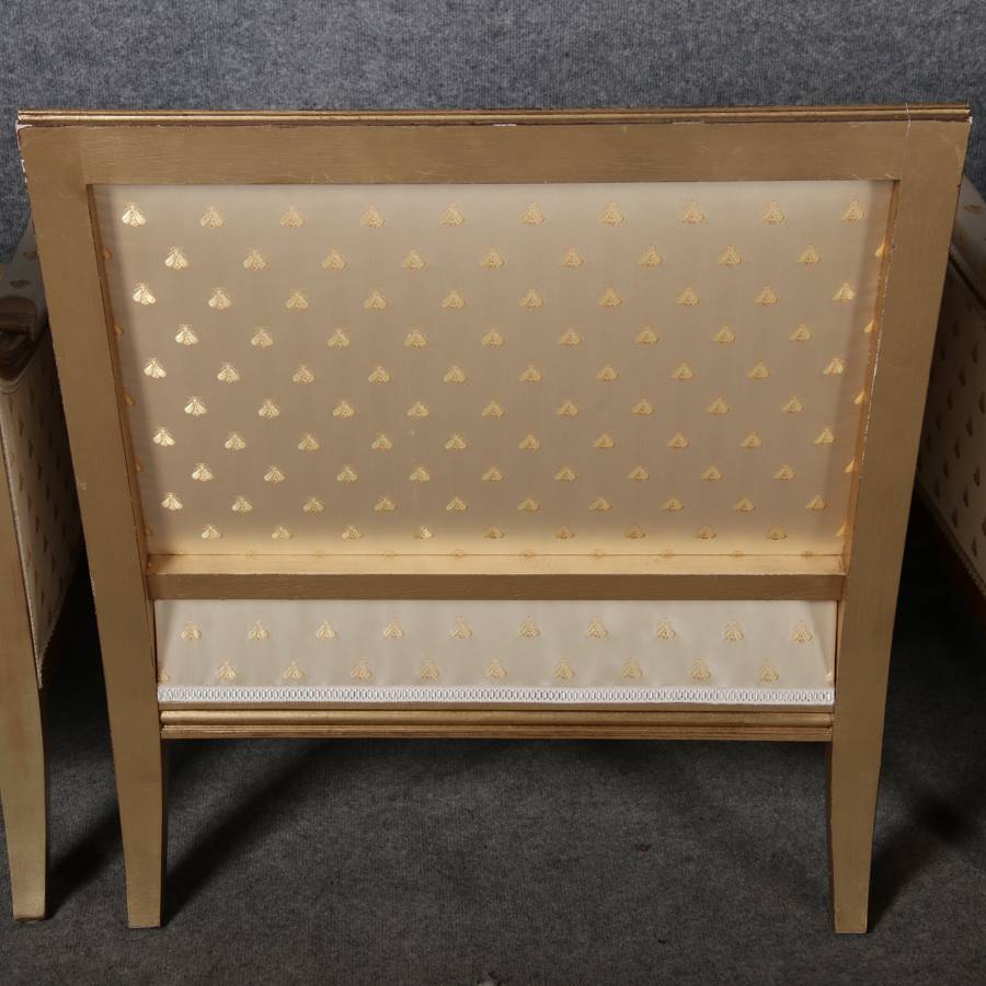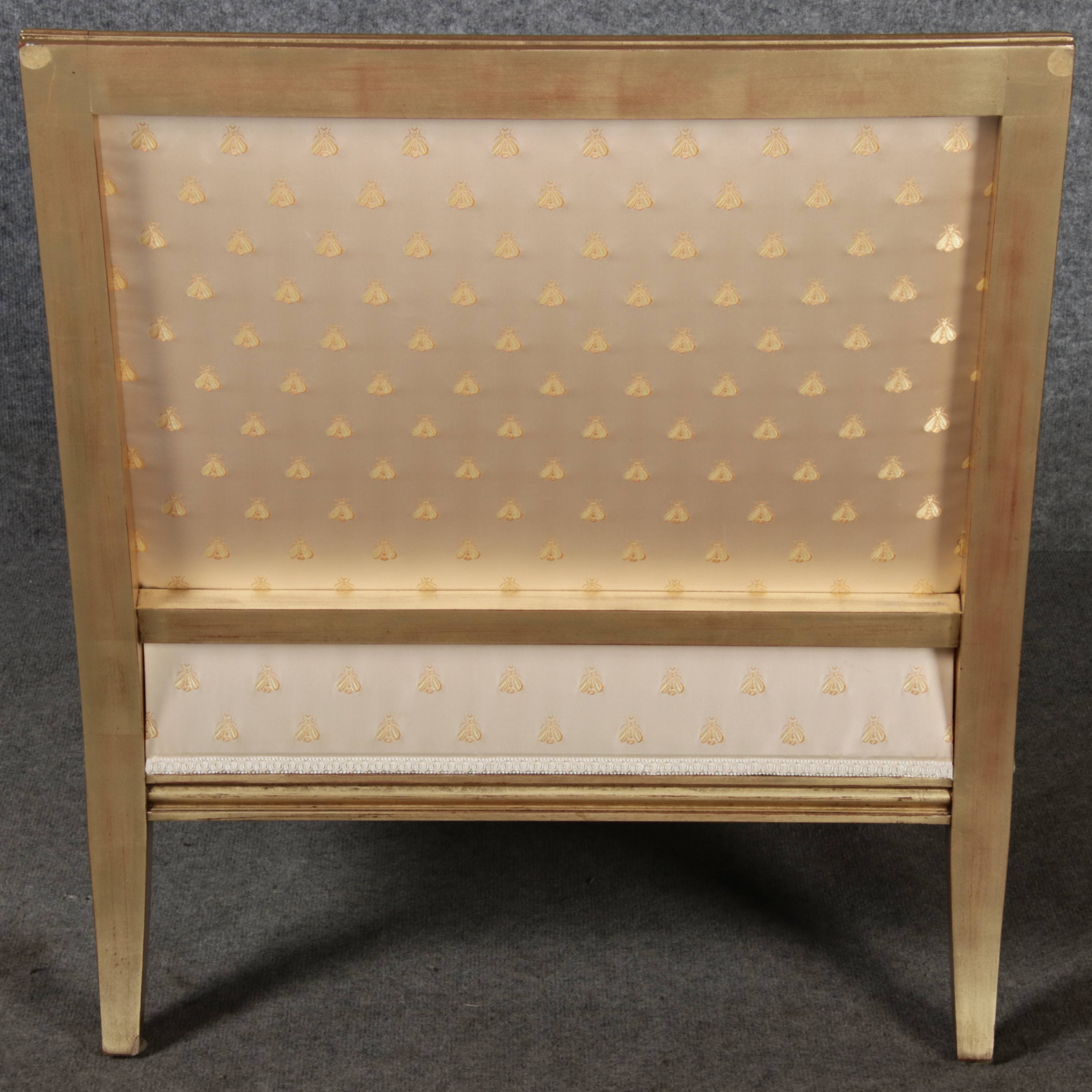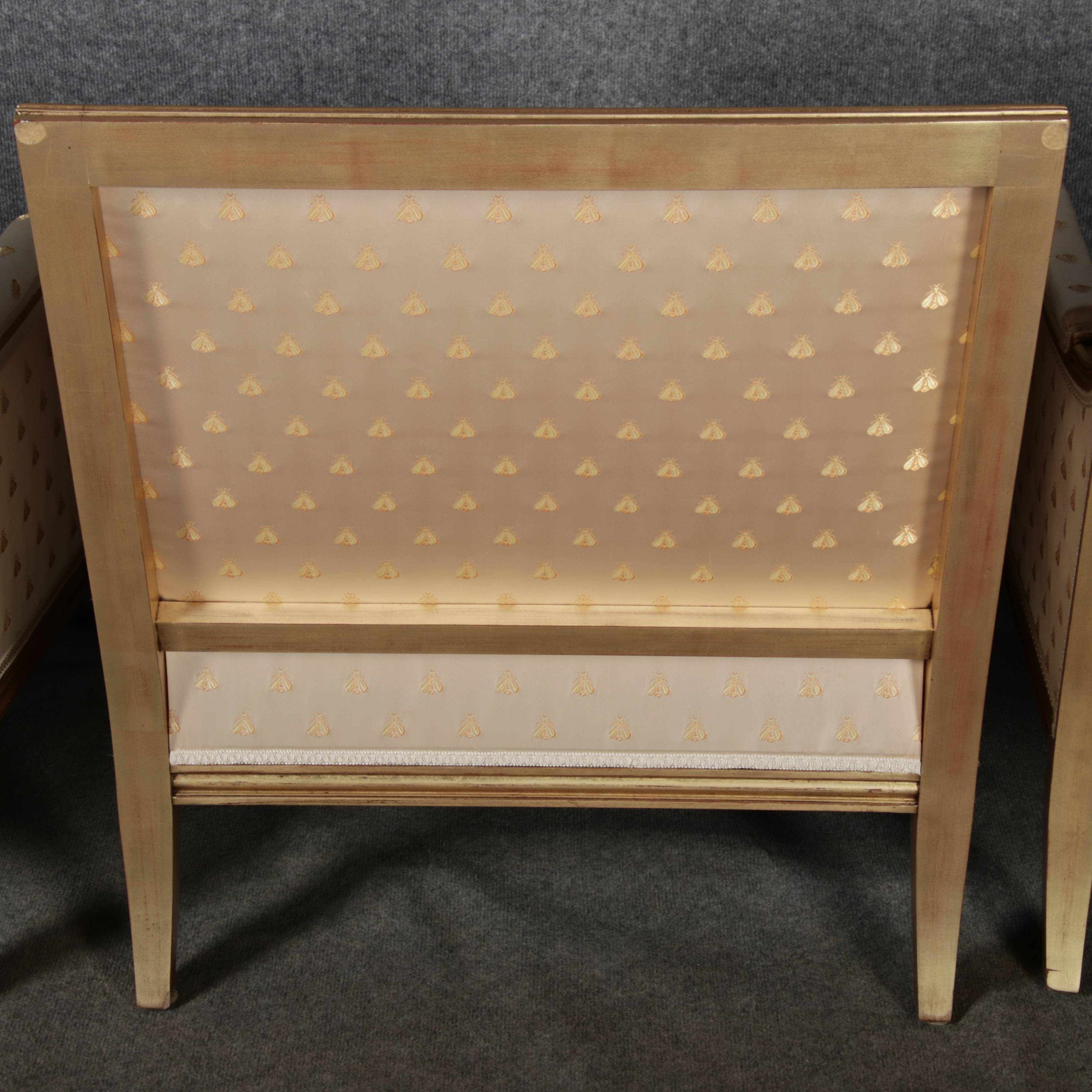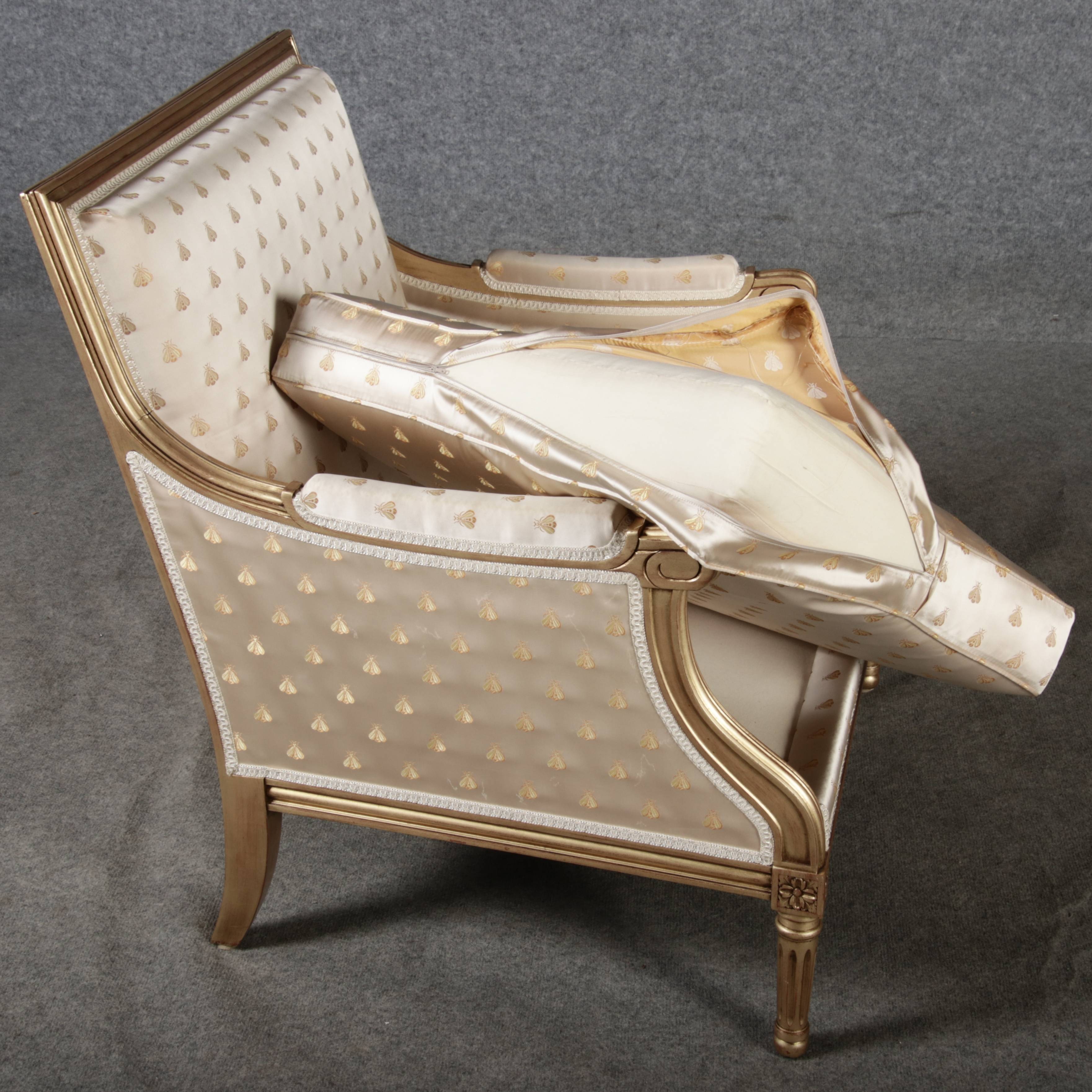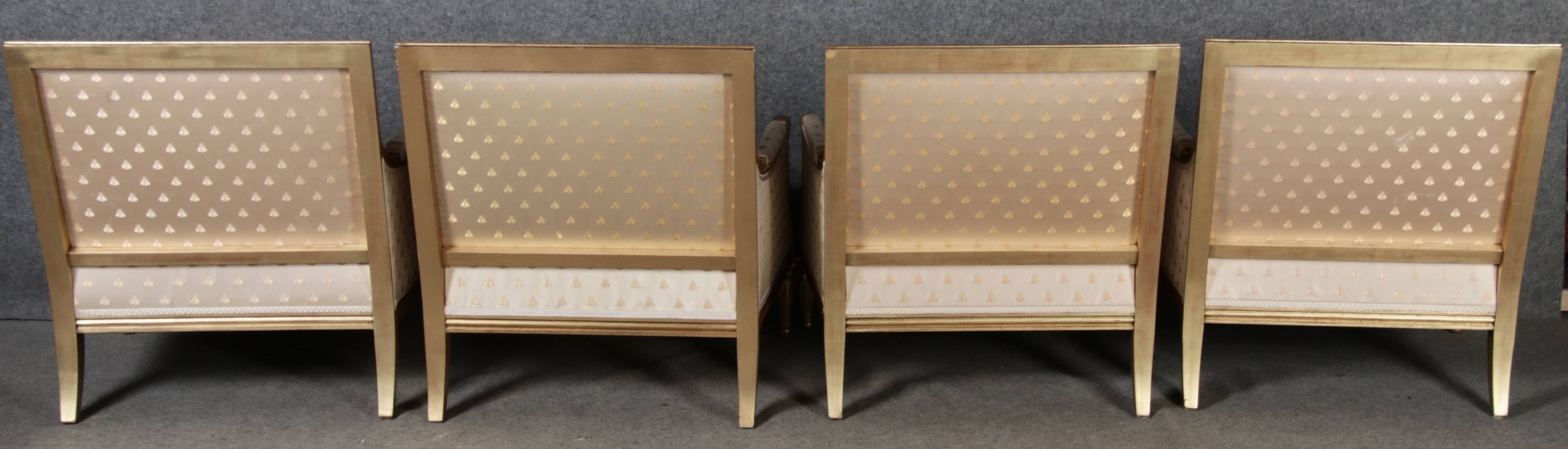 Exklusive Sitzgruppe im Louis-XVI-Stil – Pierre Counot Blandin, Frankreich Diese außergewöhnliche, gepolsterte Sitzgruppe besteht aus vier vergoldeten Bergères sowie zwei passenden Bänken und wurde von der renommierten französischen Manufaktur Pierre Counot Blandin gefertigt. Die Möbel sind im eleganten Louis-XVI-Stil gehalten und überzeugen durch ihre klassische Linienführung, hochwertige Materialien und exzellente handwerkliche Verarbeitung. Die Sitzgruppe befindet sich insgesamt in sehr gutem Zustand. Lediglich minimale, Flecken sind vorhanden, siehe Bilder. Die Bezüge sind abziehbar und waschbar, was sowohl Pflegeleichtigkeit als auch Alltagstauglichkeit gewährleistet. Die Polsterung der Kissen von den Sitzbänken sowie die Kissen – vermutlich mit Daunenfedern gefüllt – sorgt für außergewöhnlichen Sitzkomfort. Aufgrund der Ausführung ist davon auszugehen, dass es sich um eine Sonderanfertigung handelt, da diese Sitzgruppe in dieser Form nicht im aktuellen Katalog von Counot Blandin gelistet ist. Vergleichbare Modelle sind jedoch im Herstellerkatalog zu finden. Bereits auf den ersten Blick wird deutlich, dass es sich um handgefertigte Möbel von höchster Qualität handelt. Die Sitzgruppe stammt von