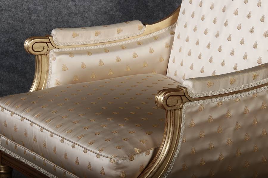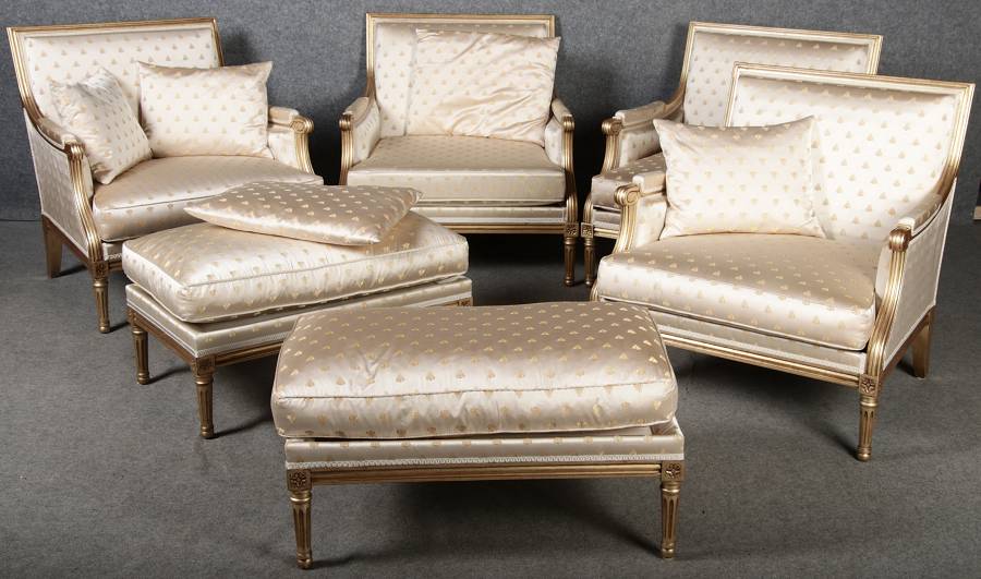 Beschreibung/description: Exklusive Sitzgruppe im Louis-XVI-Stil – Pierre Counot Blandin, Frankreich Diese außergewöhnliche, gepolsterte Sitzgruppe besteht aus vier vergoldeten Bergères sowie zwei passenden Bänken und wurde von der renommierten französischen Manufaktur Pierre Counot Blandin gefertigt. Die Möbel sind im eleganten Louis-XVI-Stil gehalten und überzeugen durch ihre klassische Linienführung, hochwertige Materialien und exzellente handwerkliche Verarbeitung. Die Sitzgruppe befindet sich insgesamt in sehr gutem Zustand. Lediglich minimale, Flecken sind vorhanden, siehe Bilder. Die Bezüge sind abziehbar und waschbar, was sowohl Pflegeleichtigkeit als auch Alltagstauglichkeit gewährleistet. Die Polsterung der Kissen von den Sitzbänken sowie die Kissen – vermutlich mit Daunenfedern gefüllt – sorgt für außergewöhnlichen Sitzkomfort. Aufgrund der Ausführung ist davon auszugehen, dass es sich um eine Sonderanfertigung handelt, da diese Sitzgruppe in dieser Form nicht im aktuellen Katalog von Counot Blandin gelistet ist. Vergleichbare Modelle sind jedoch im Herstellerkatalog zu finden. Bereits auf den ersten Blick wird deutlich, dass es sich um handgefertigte Möbel von höchster Qualität handelt. Die Sitzgruppe stammt von