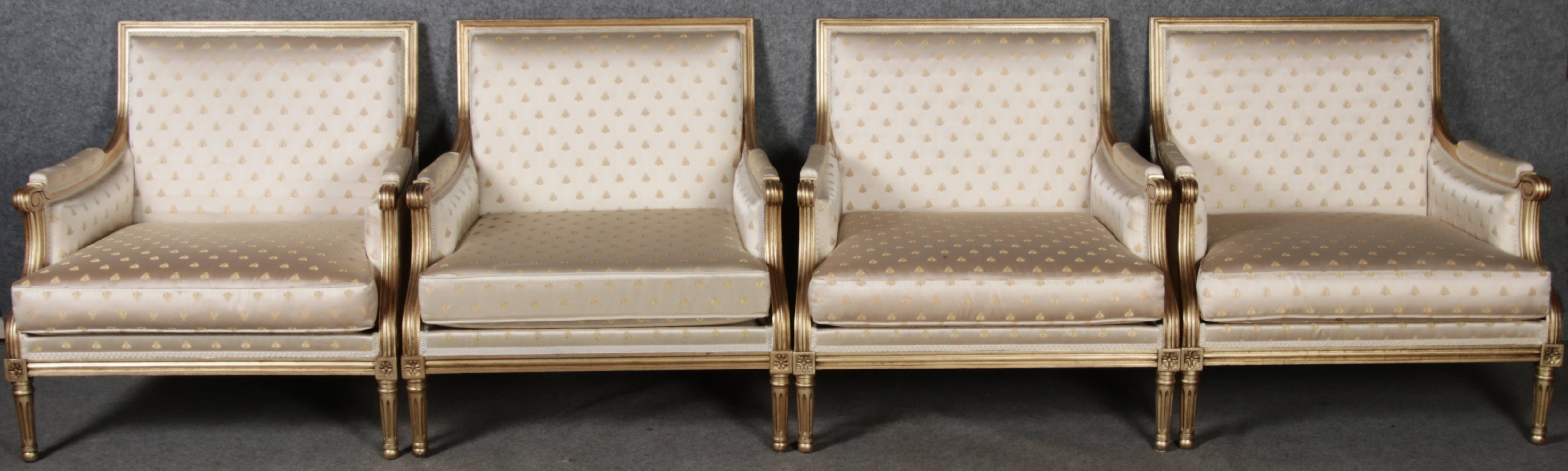 Vergleichswerte zeigen jedoch das hohe Marktsegment: Der geschätzte Neupreis dieser exklusiven Sitzgruppe aus vier Sesseln und zwei Bänken dürfte daher bei ca. 25.000–30.000 €, möglicherweise auch darüber, gelegen haben. Ein seltenes Ensemble für Liebhaber klassischer französischer Möbelkunst, das Eleganz, Komfort und handwerkliche Perfektion vereint.