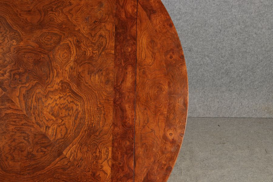 Der runde Tisch hat vier Klappseiten, die den Tisch von einem Kreis mit