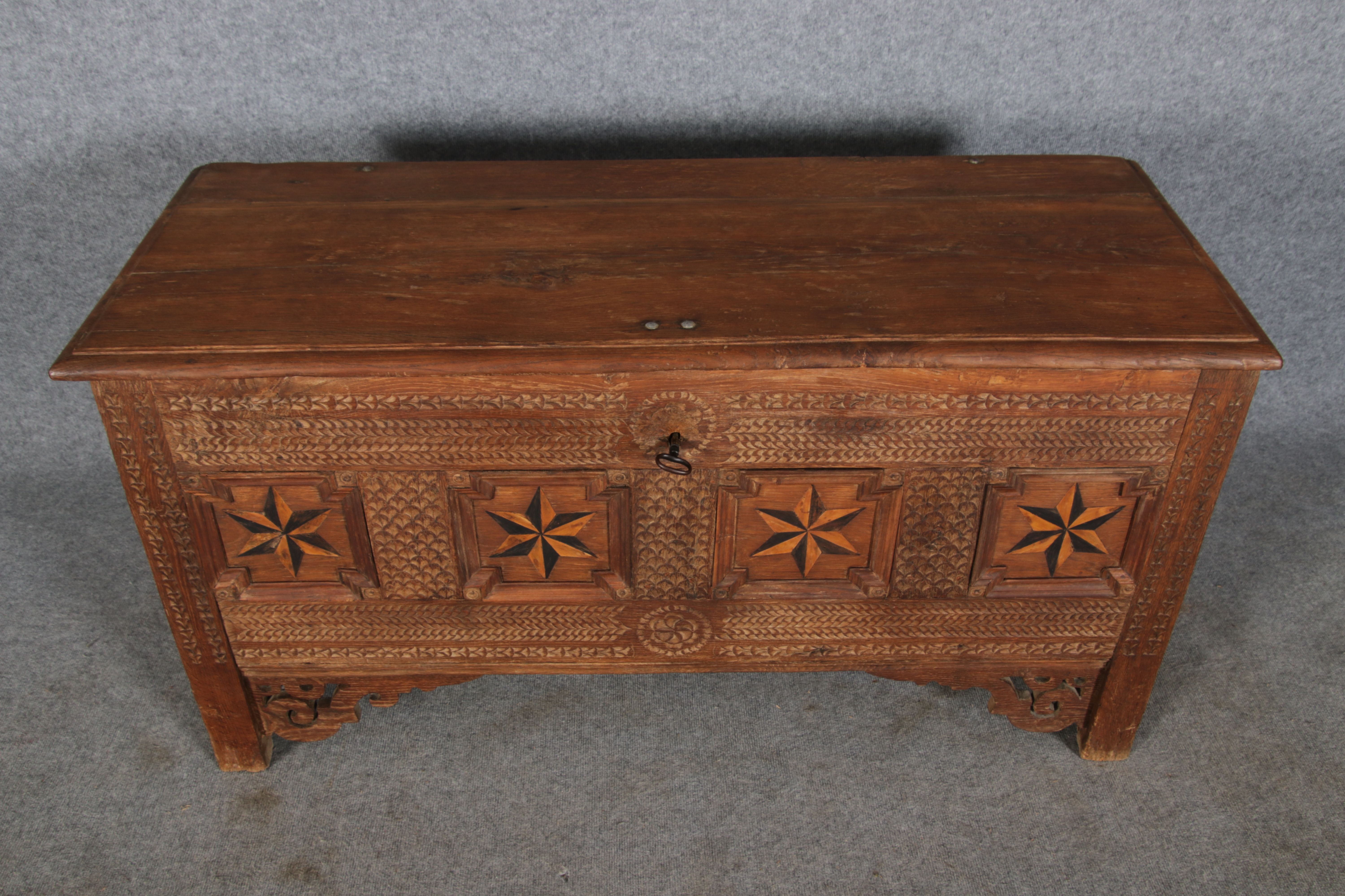 | Barocktruhe mit Kerbschnitzereien und Einlegearbeiten um 1700 | ||||||||||||||||||||||||||||||||||||||||||||||||||||||||||||||||||