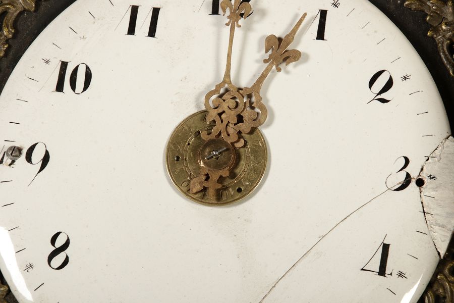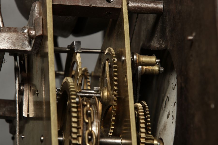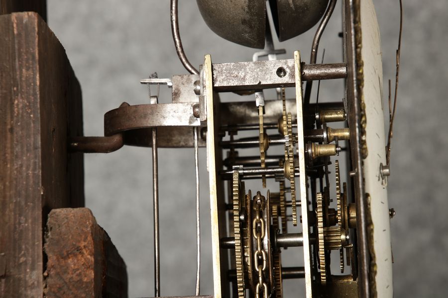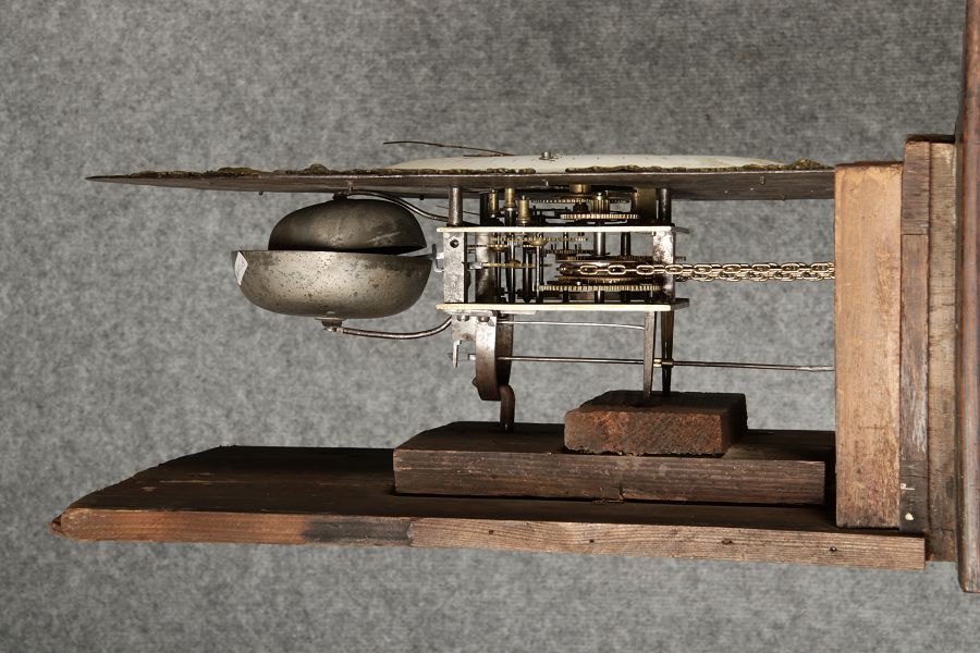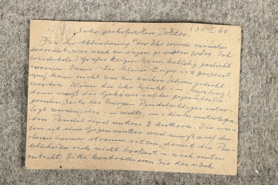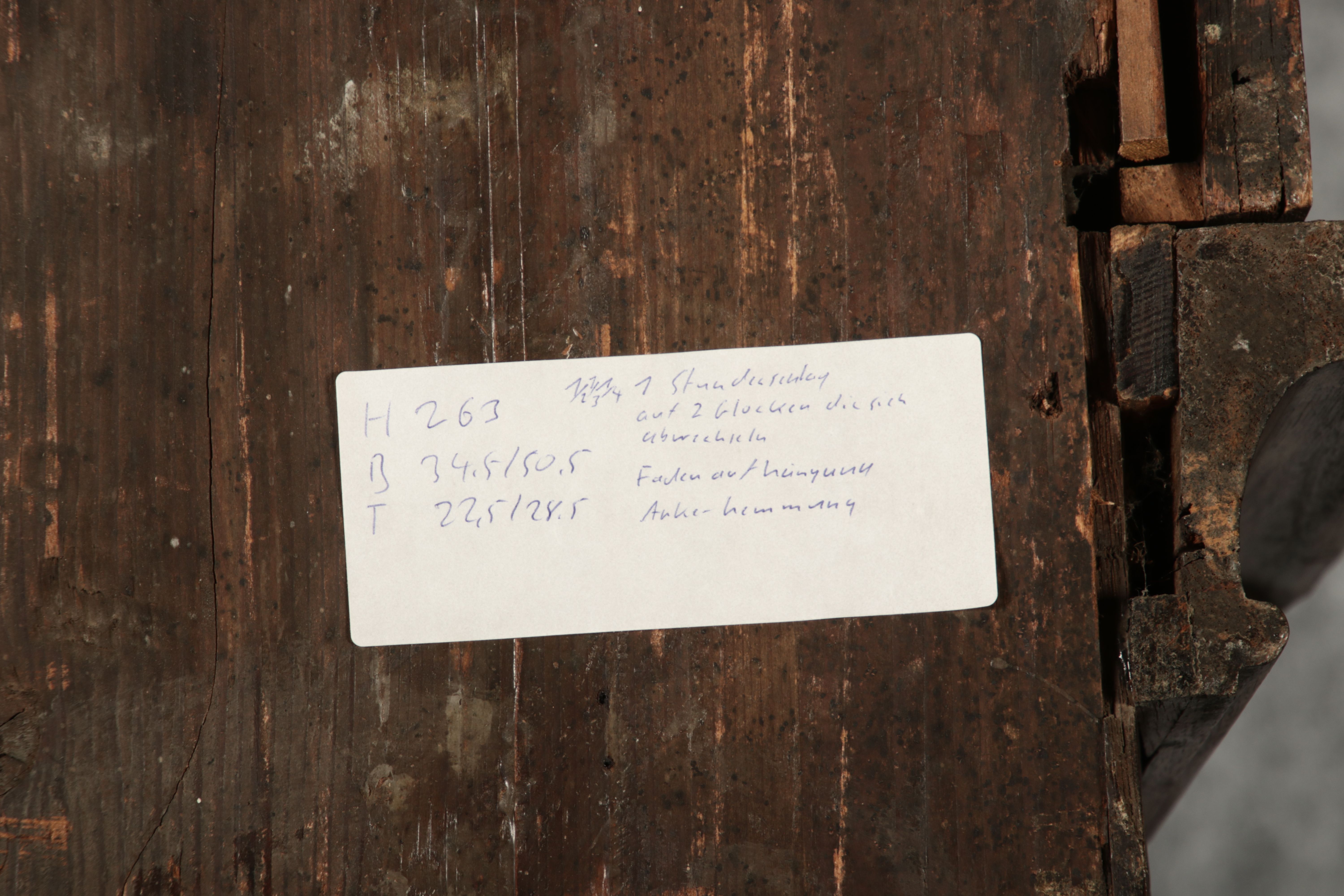Für XXL Bild hier klicken1 ![]() Uhren Spezifikationen Art der Uhr Standuhr mit zwei Glocken Alter und Herkunft 18 Jahrhundert Gehäuse Material Eichen Holz Masse Höhe ca. 263 cm, Breite ca. 34,5/50,5 cm, Tiefe ca. 22,5/28,5 cm Material Uhrwerk Messing Eisen Silber Holz Pendel- Aufhängung Fadenaufhängung Hemmung und Gewichte Ankerhemmung Schlagwerk auf zwei Glocke 1/4 1/2 3/4 1/1 Stundenschlag auf kleine Glocke, schlag der vollen Stunde auf große Glocke. Kipphammer Schlagwerkssteuerung (der Glockenhammer kippt um von einer auf die andere Glocke zu wechseln). Zertifikate Dokumente alte Rechnung einer Überholung, Postkarte vom 31.01.1960 mit einer Handschriftlichen Anweisung für die Uhr. Zustand Gehäuse Guter Zustand mit Gebrauchsspuren, das Zifferblatt ist beschädigt, alt restauriert siehe Bilder. Bilder sind Bestandteil der Auktion. Zustand Uhrwerk Guter Zustand mit Gebrauchsspuren. Uhrwerk läuft an und ist nicht geprüft auf Funktion, keine Garantie das die Uhr läuft. Kann aber gerne von meinem Uhrmacher überholt werden. Preis und dauer der Überholung auf Anfrage. Bilder sind Bestandteil der Auktion. |