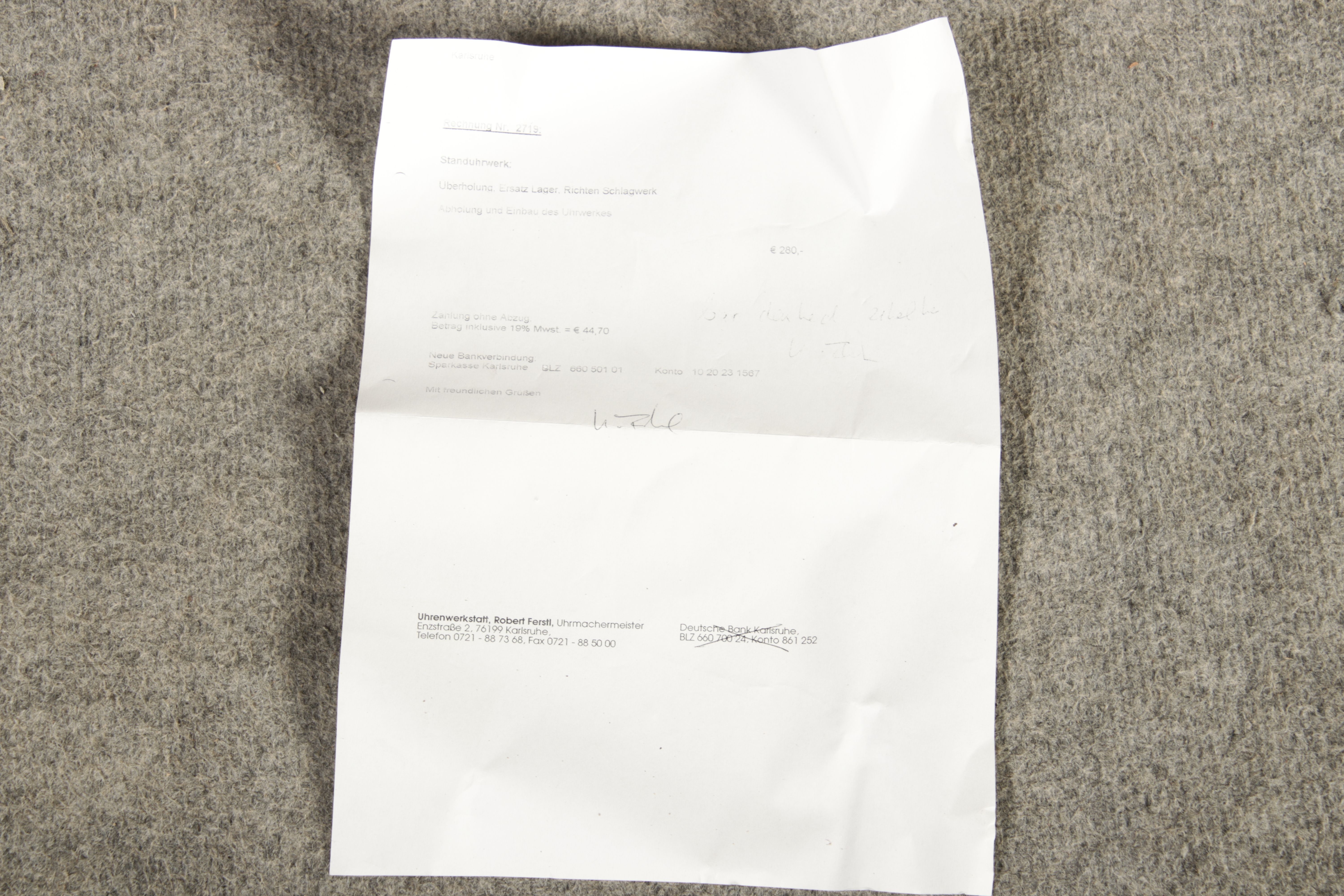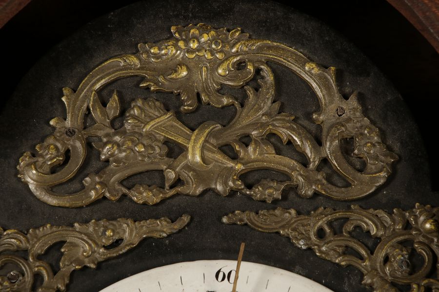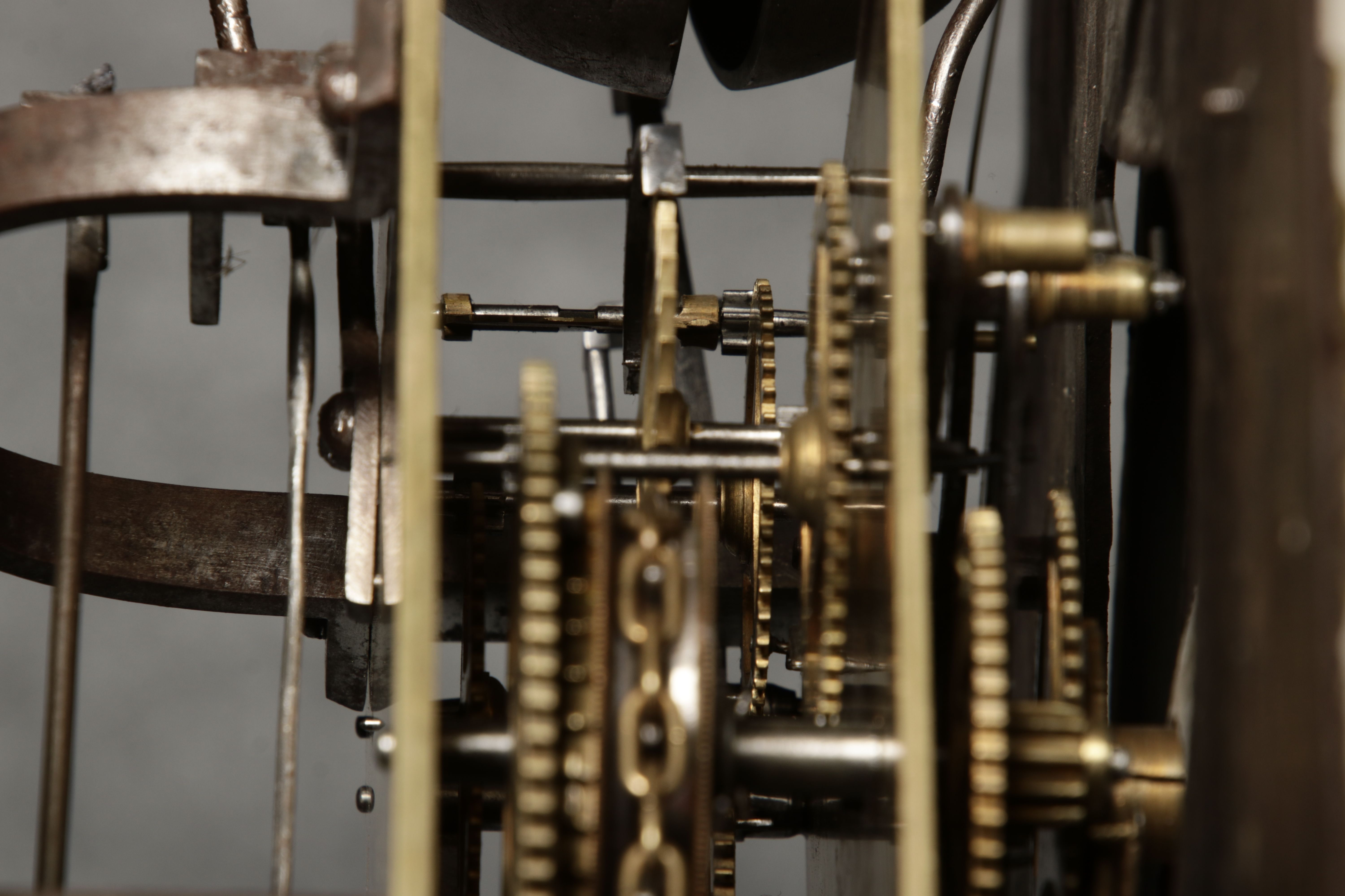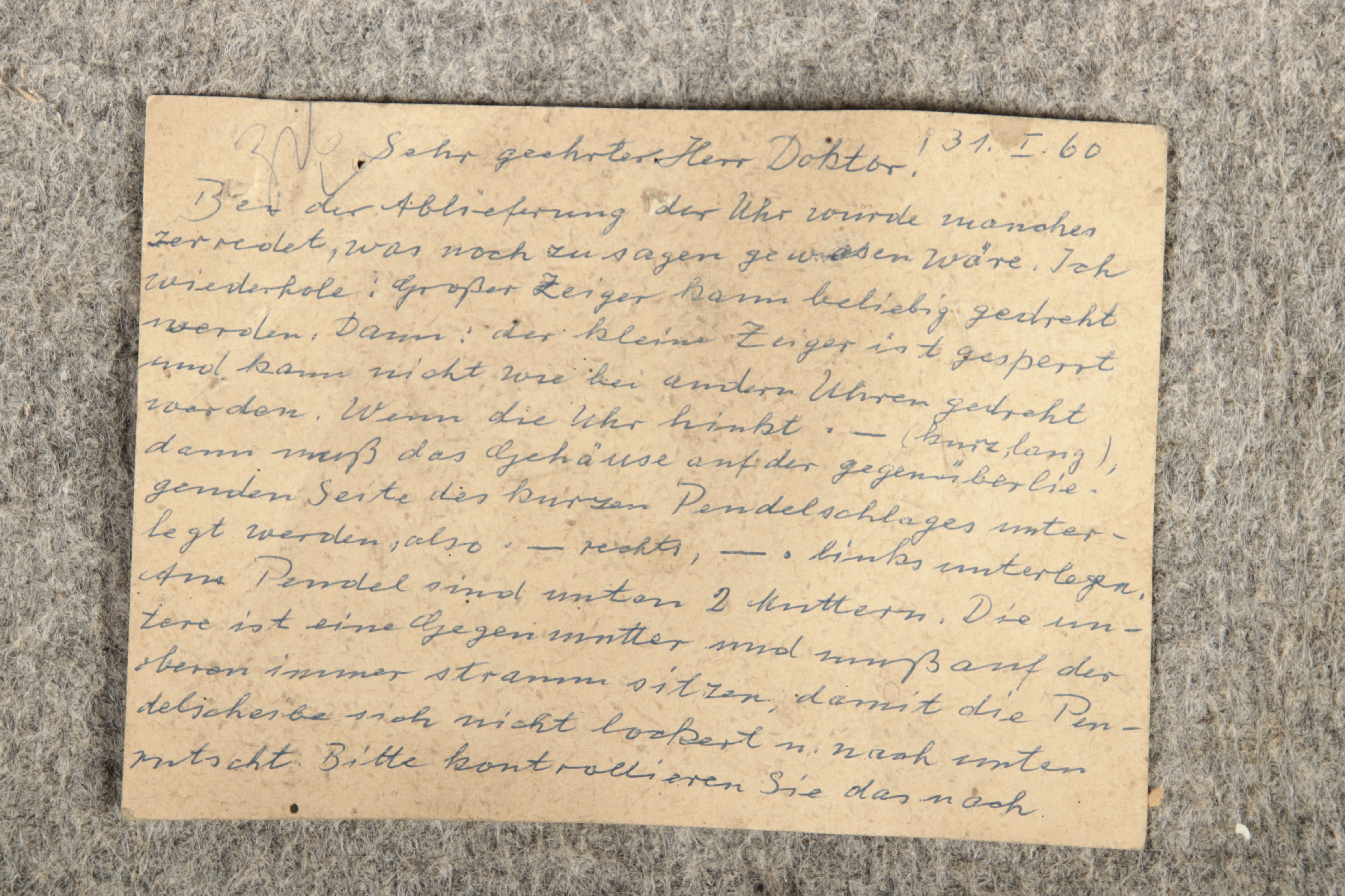 Für XXL Bild hier klicken1 ![]() Uhren Spezifikationen Art der Uhr Standuhr mit zwei Glocken Alter und Herkunft 18 Jahrhundert Gehäuse Material Eichen Holz Masse Höhe ca. 263 cm, Breite ca. 34,5/50,5 cm, Tiefe ca. 22,5/28,5 cm Material Uhrwerk Messing Eisen Silber Holz Pendel- Aufhängung Fadenaufhängung Hemmung und Gewichte Ankerhemmung Schlagwerk auf zwei Glocke 1/4 1/2 3/4 1/1 Stundenschlag auf kleine Glocke, schlag der vollen Stunde auf große Glocke. Kipphammer Schlagwerkssteuerung (der Glockenhammer kippt um von einer auf die andere Glocke zu wechseln). Zertifikate Dokumente alte Rechnung einer Überholung, Postkarte vom 31.01.1960 mit einer Handschriftlichen Anweisung für die Uhr. Zustand Gehäuse Guter Zustand mit Gebrauchsspuren, das Zifferblatt ist beschädigt, alt restauriert siehe Bilder. Bilder sind Bestandteil der Auktion. Zustand Uhrwerk Guter Zustand mit Gebrauchsspuren. Uhrwerk läuft an und ist nicht geprüft auf Funktion, keine Garantie das die Uhr läuft. Kann aber gerne von meinem Uhrmacher überholt werden. Preis und dauer der Überholung auf Anfrage. Bilder sind Bestandteil der Auktion. |