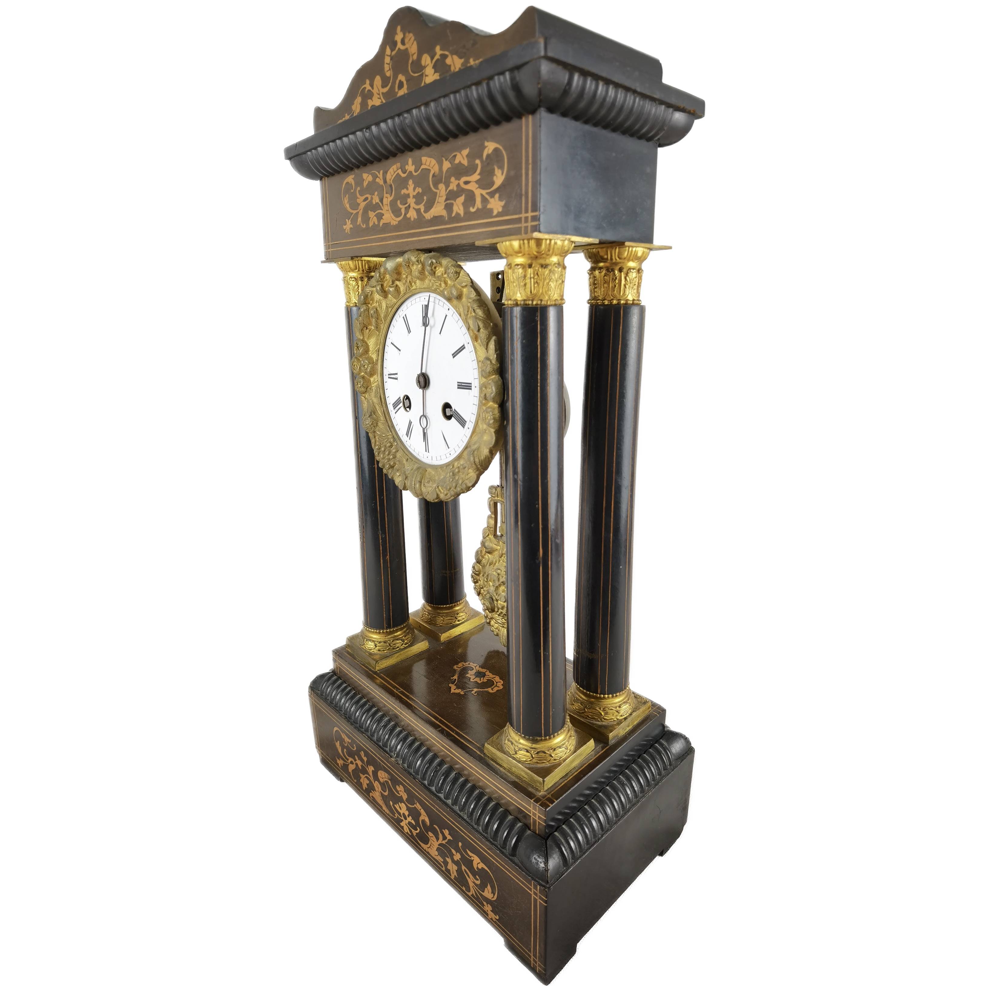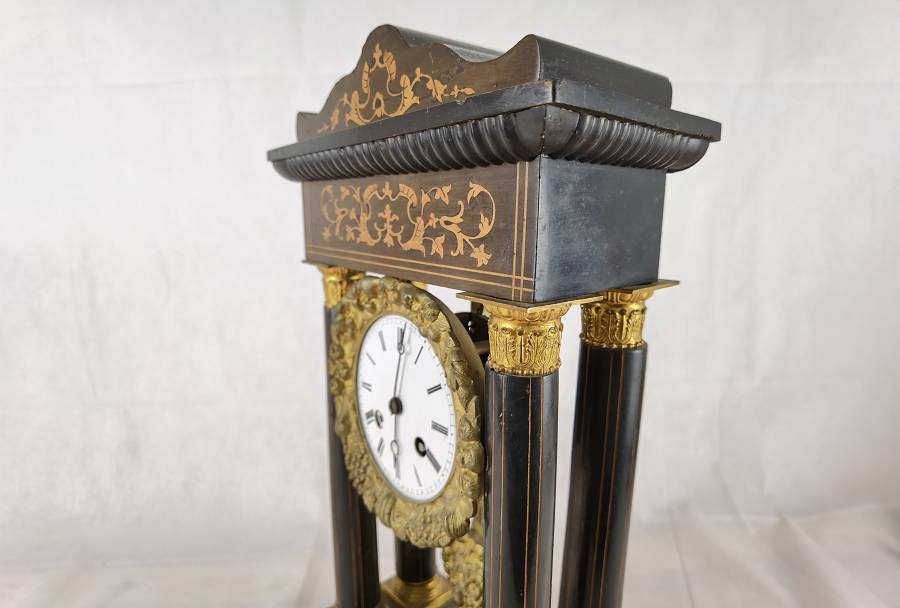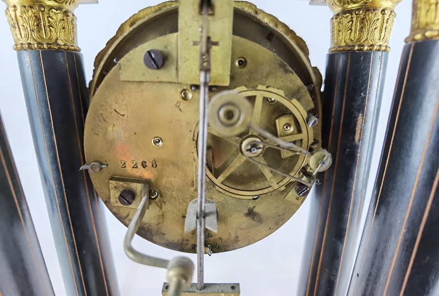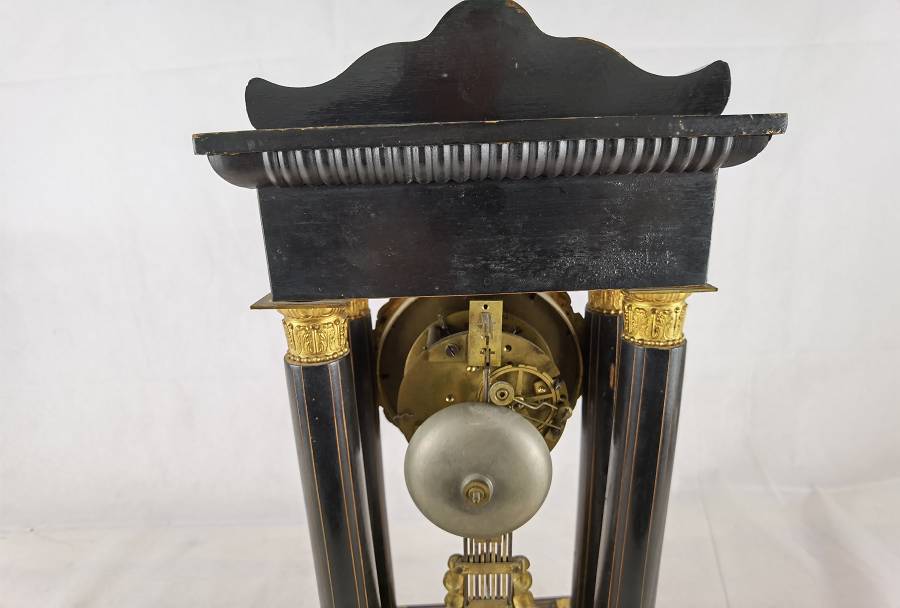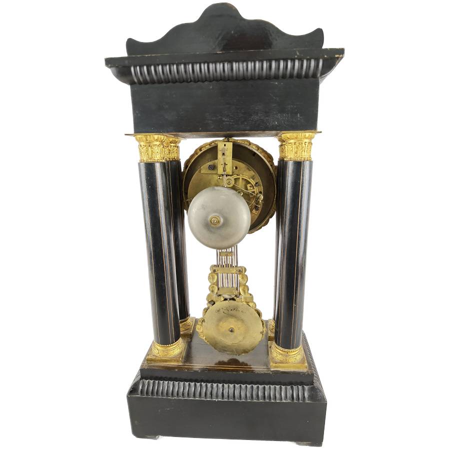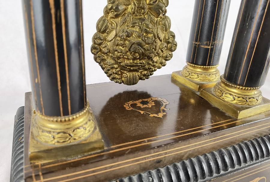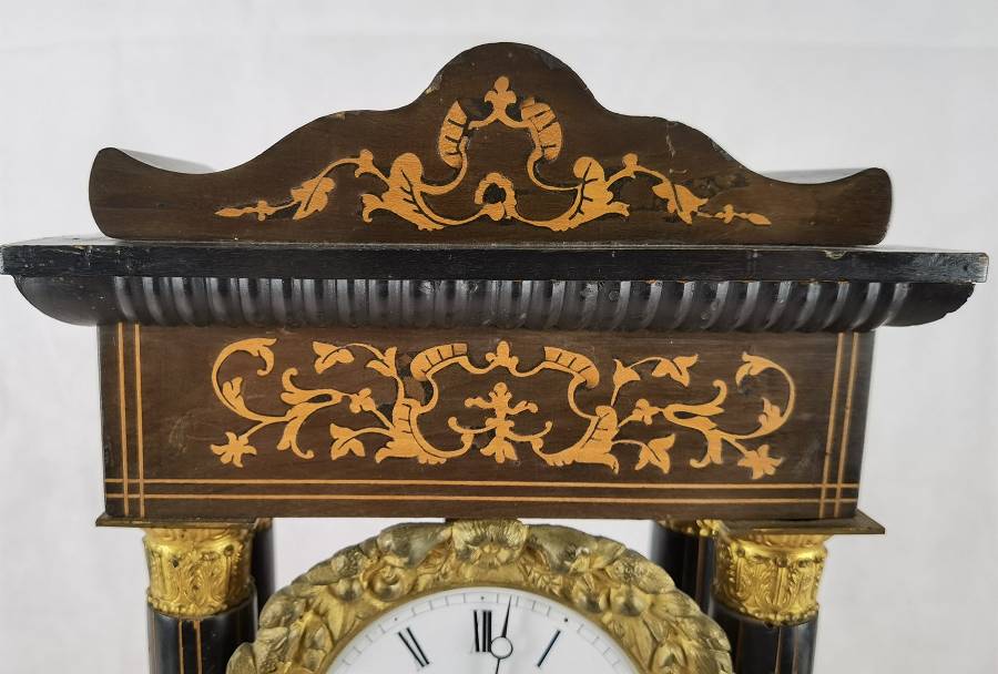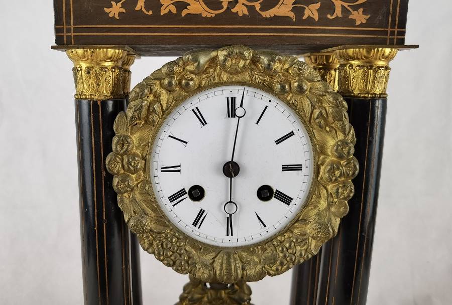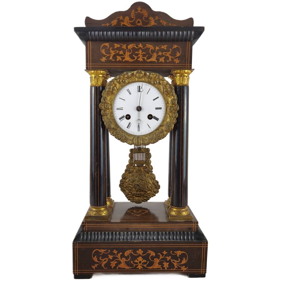 Beschreibung/description: Antike französische Säulenuhr, signiert „Japy Frères, Paris“, um 1840/50 Elegante Pendeluhr mit achttägigem Federzugwerk und klassischem Aufbau in viersäuliger Architektur. Das Uhrwerk verfügt über Stunden- und Halbstundenschlag auf Glocke sowie eine Pendelfederaufhängung. Das Emailzifferblatt mit römischen Ziffern ist von vergoldeter Bronzelunette eingefasst und mit feinen gebläuten Stahlzeigern ausgestattet. Auch die reich verzierte Pendellinse besteht aus feuervergoldeter Bronze. Das sorgfältig gearbeitete Holzgehäuse zeigt kunstvolle Marketerie-Intarsien im Biedermeier-Stil und ist mit dekorativen Bronzeapplikationen veredelt. Die vier schwarzen Säulen mit vergoldeten Basen und Kapitellen verleihen der Uhr einen repräsentativen, klassizistisch inspirierten Charakter.
