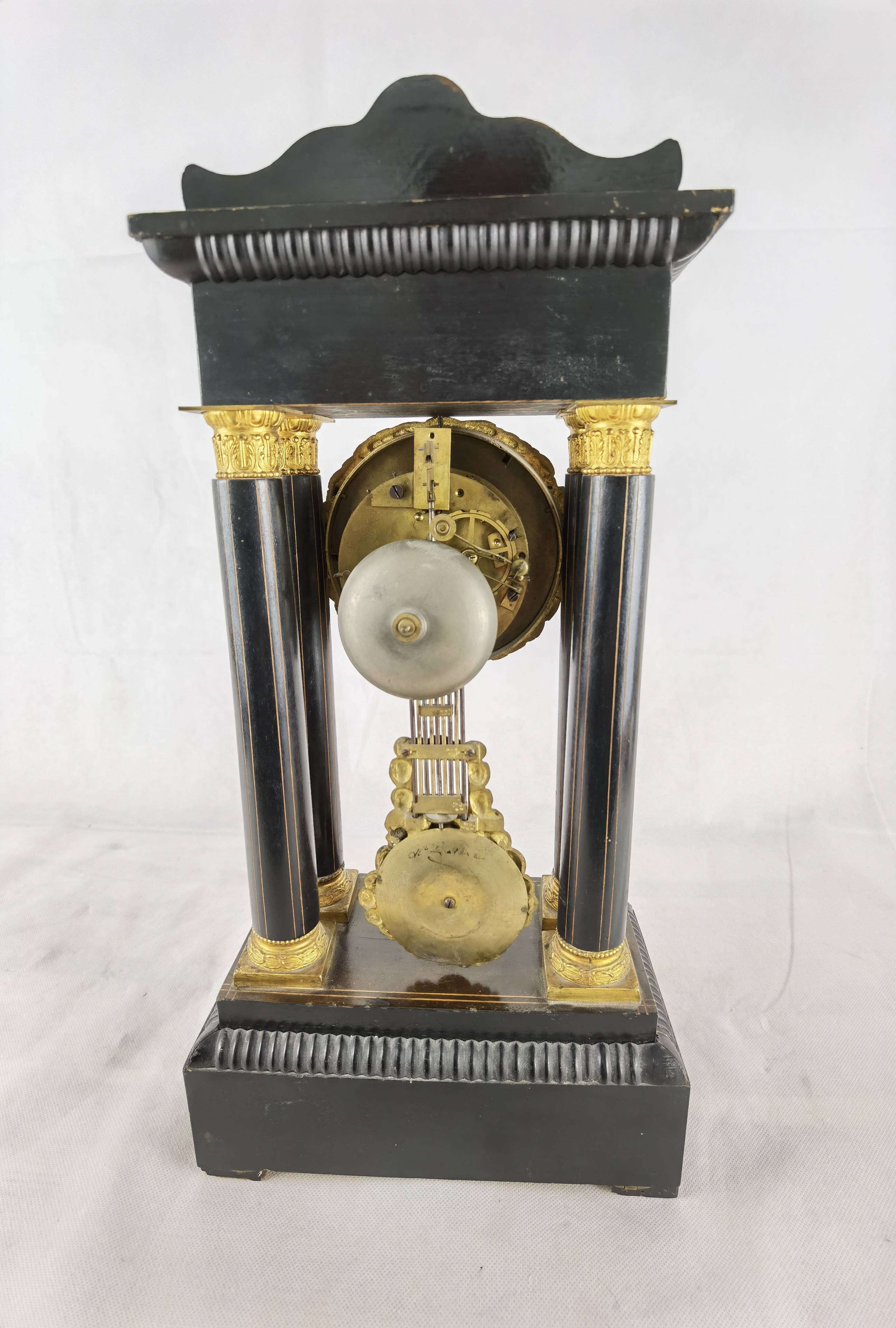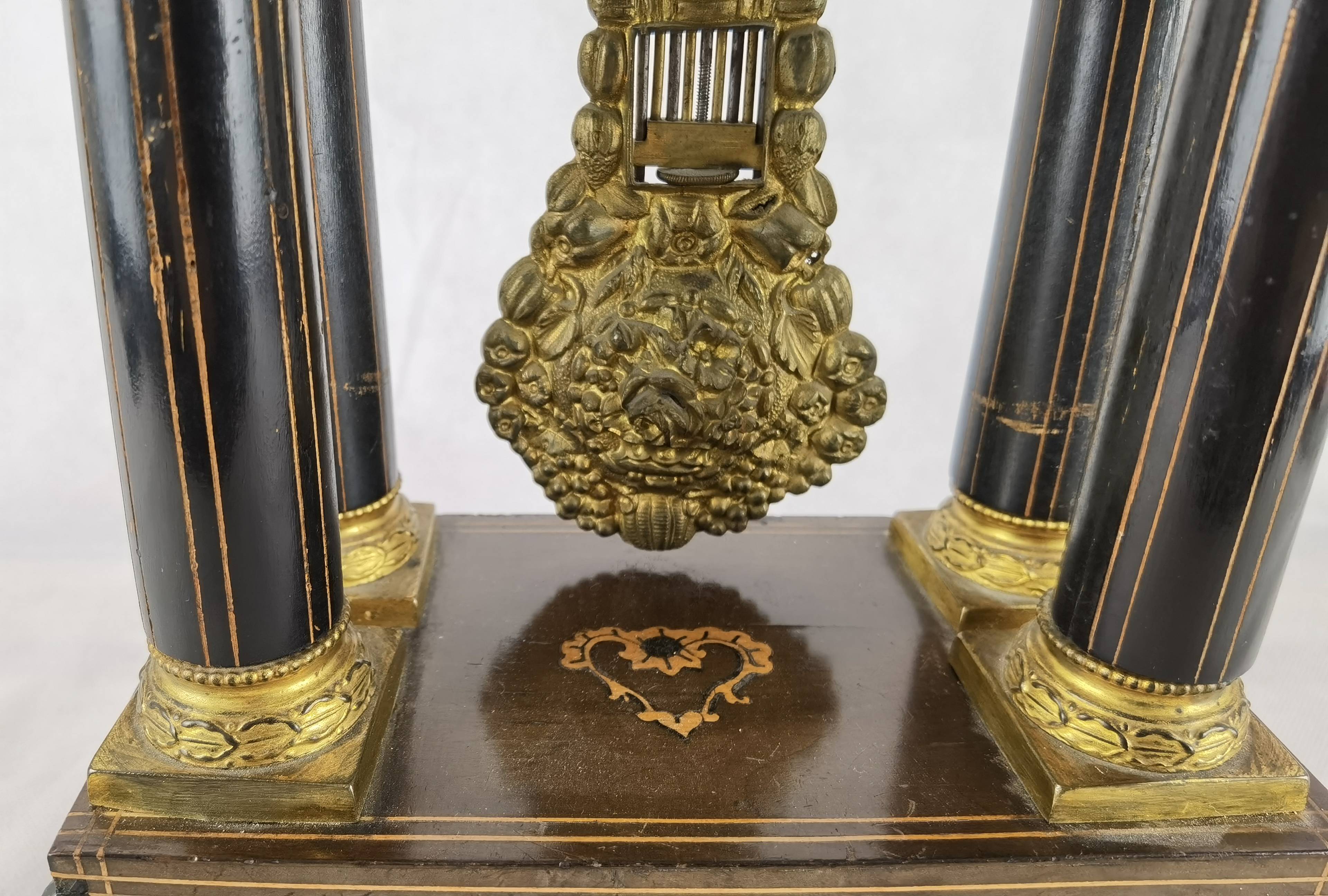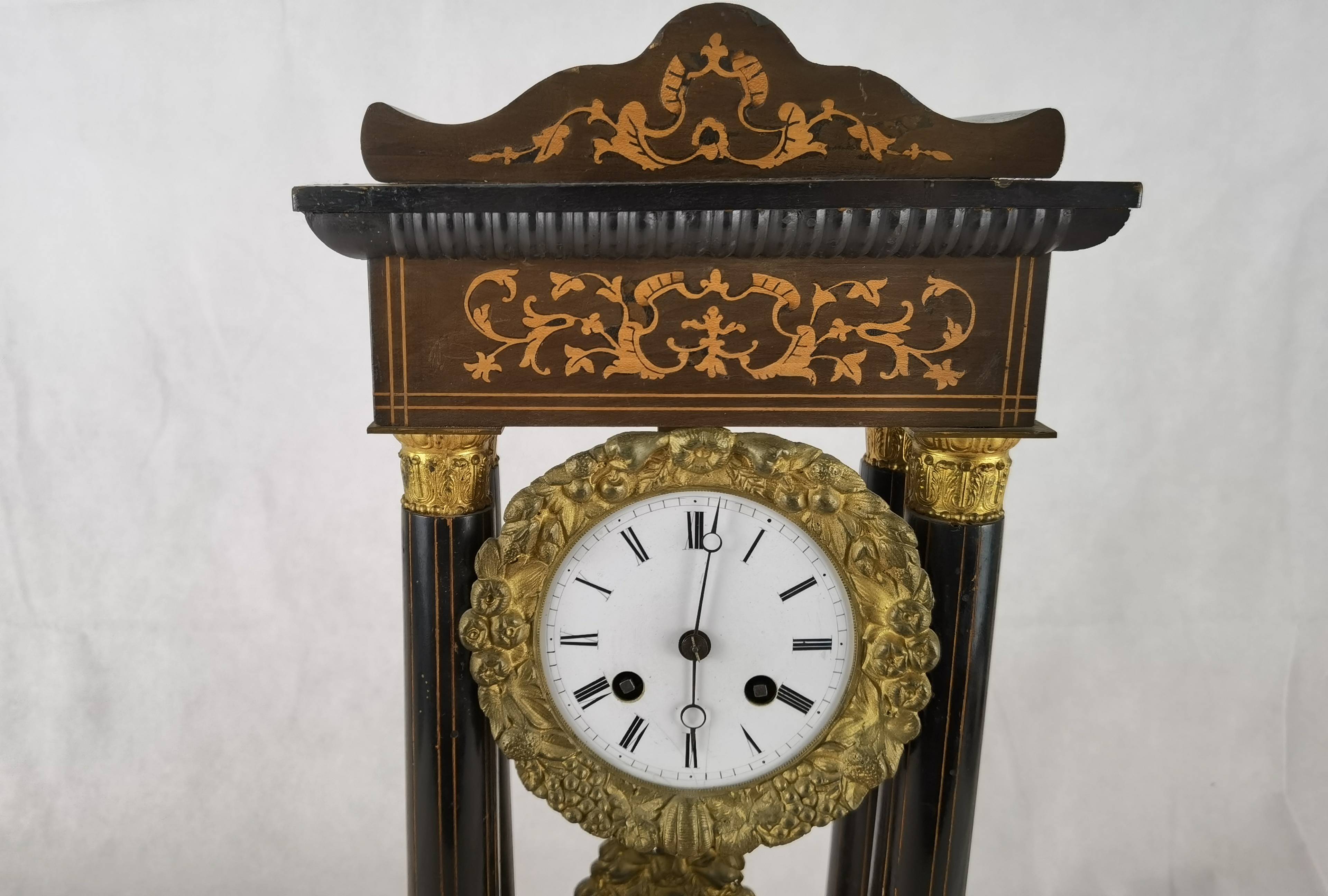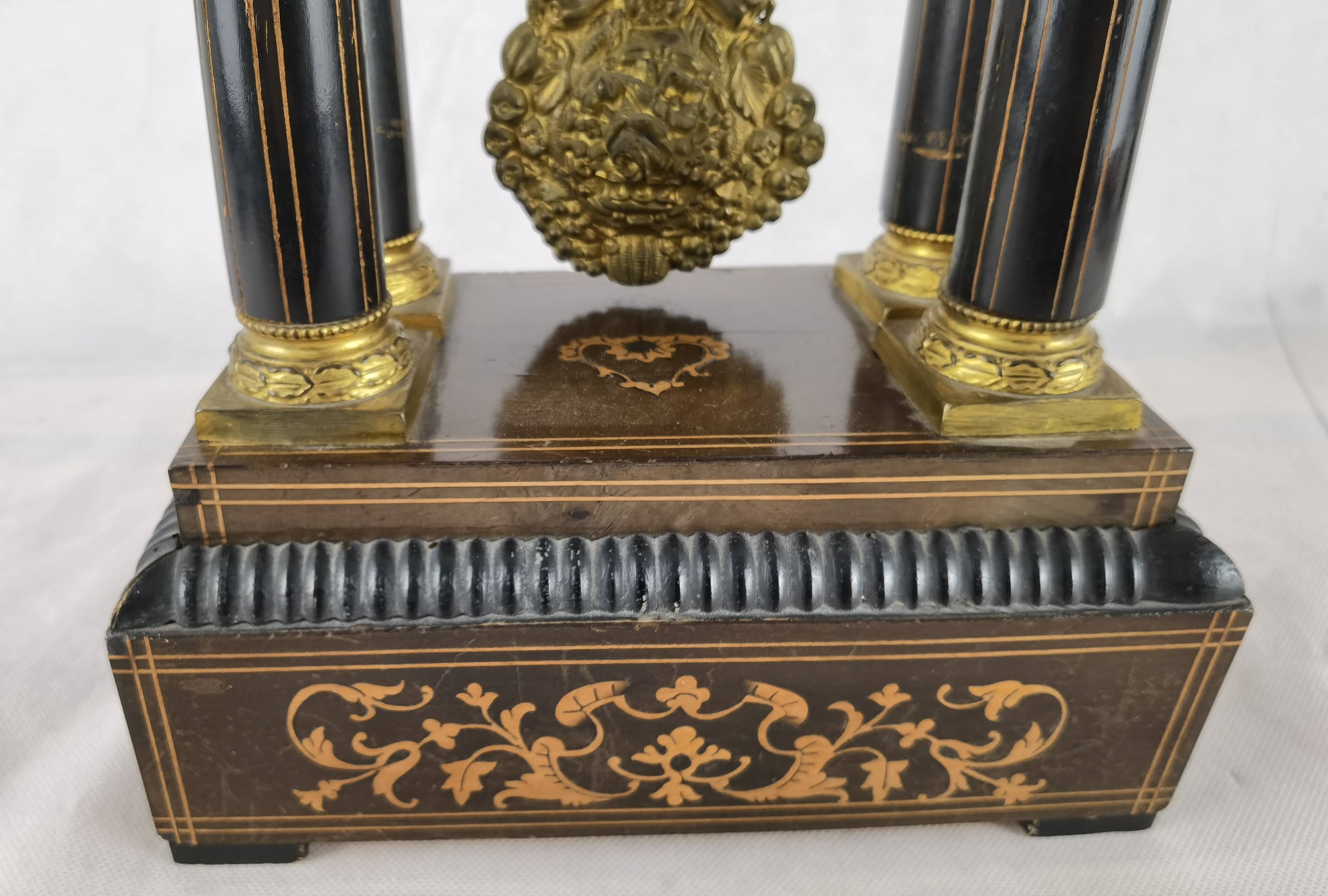 Beschreibung/description: Antike französische Säulenuhr, signiert „Japy Frères, Paris“, um 1840/50 Elegante Pendeluhr mit achttägigem Federzugwerk und klassischem Aufbau in viersäuliger Architektur. Das Uhrwerk verfügt über Stunden- und Halbstundenschlag auf Glocke sowie eine Pendelfederaufhängung. Das Emailzifferblatt mit römischen Ziffern ist von vergoldeter Bronzelunette eingefasst und mit feinen gebläuten Stahlzeigern ausgestattet. Auch die reich verzierte Pendellinse besteht aus feuervergoldeter Bronze. Das sorgfältig gearbeitete Holzgehäuse zeigt kunstvolle Marketerie-Intarsien im Biedermeier-Stil und ist mit dekorativen Bronzeapplikationen veredelt. Die vier schwarzen Säulen mit vergoldeten Basen und Kapitellen verleihen der Uhr einen repräsentativen, klassizistisch inspirierten Charakter.