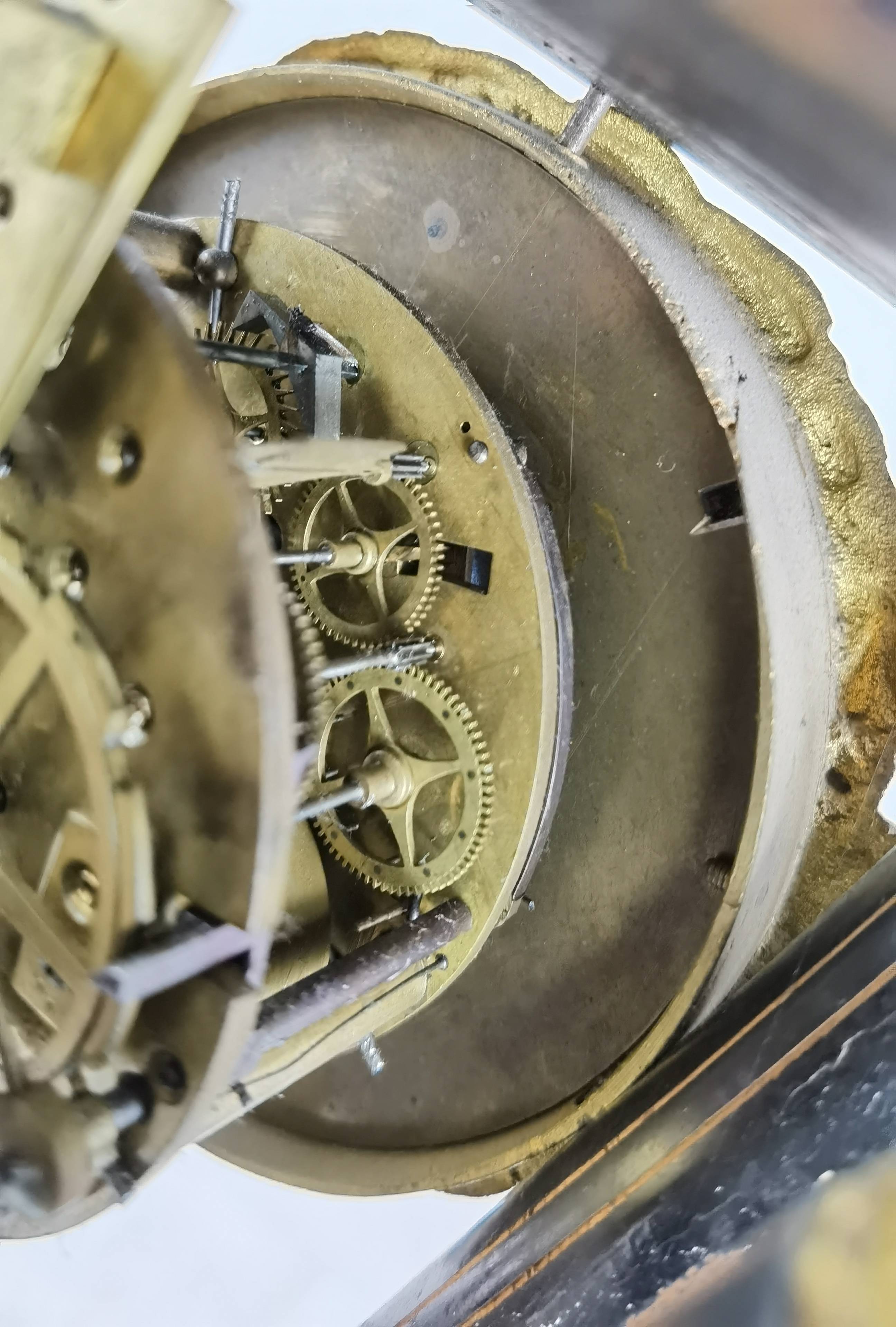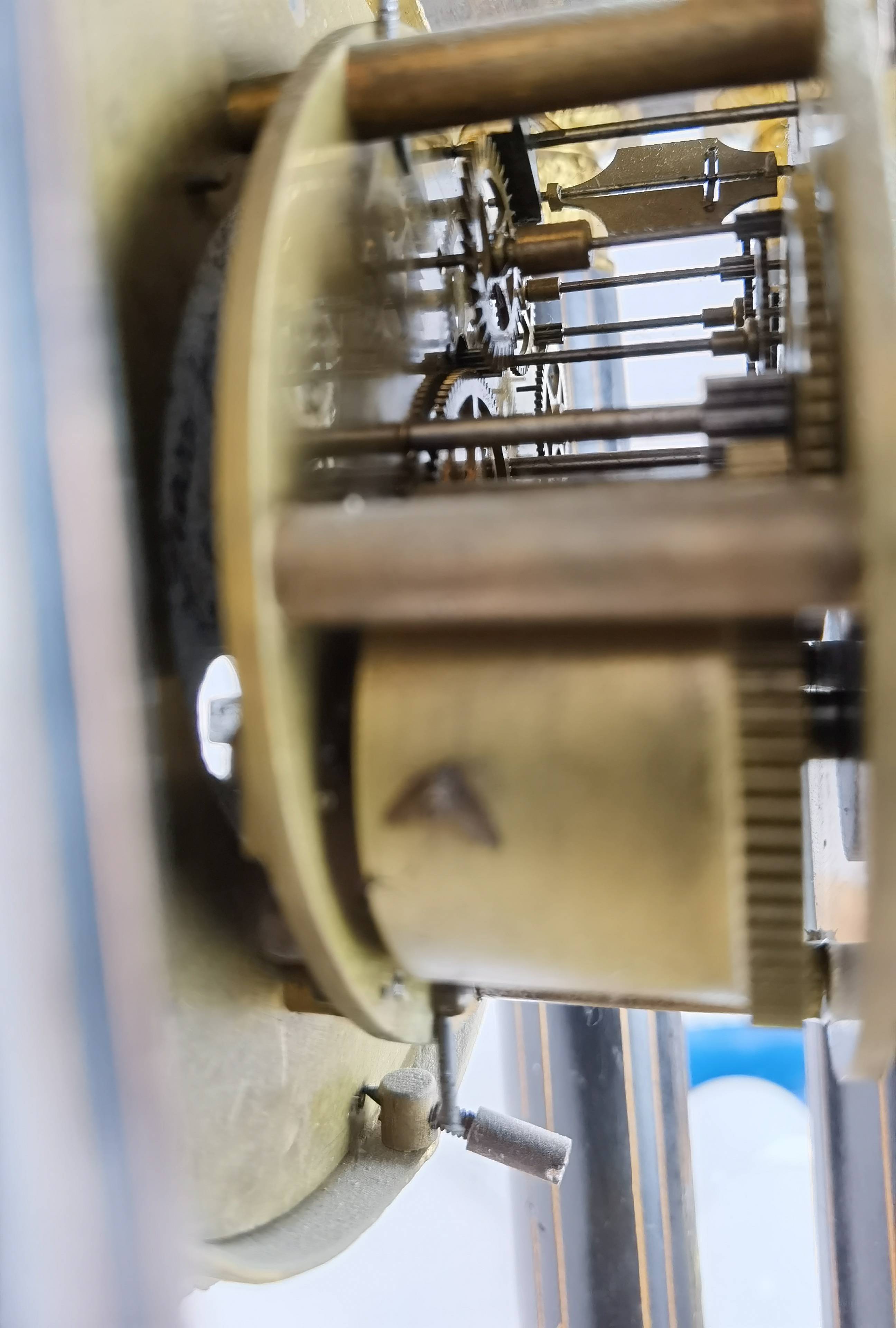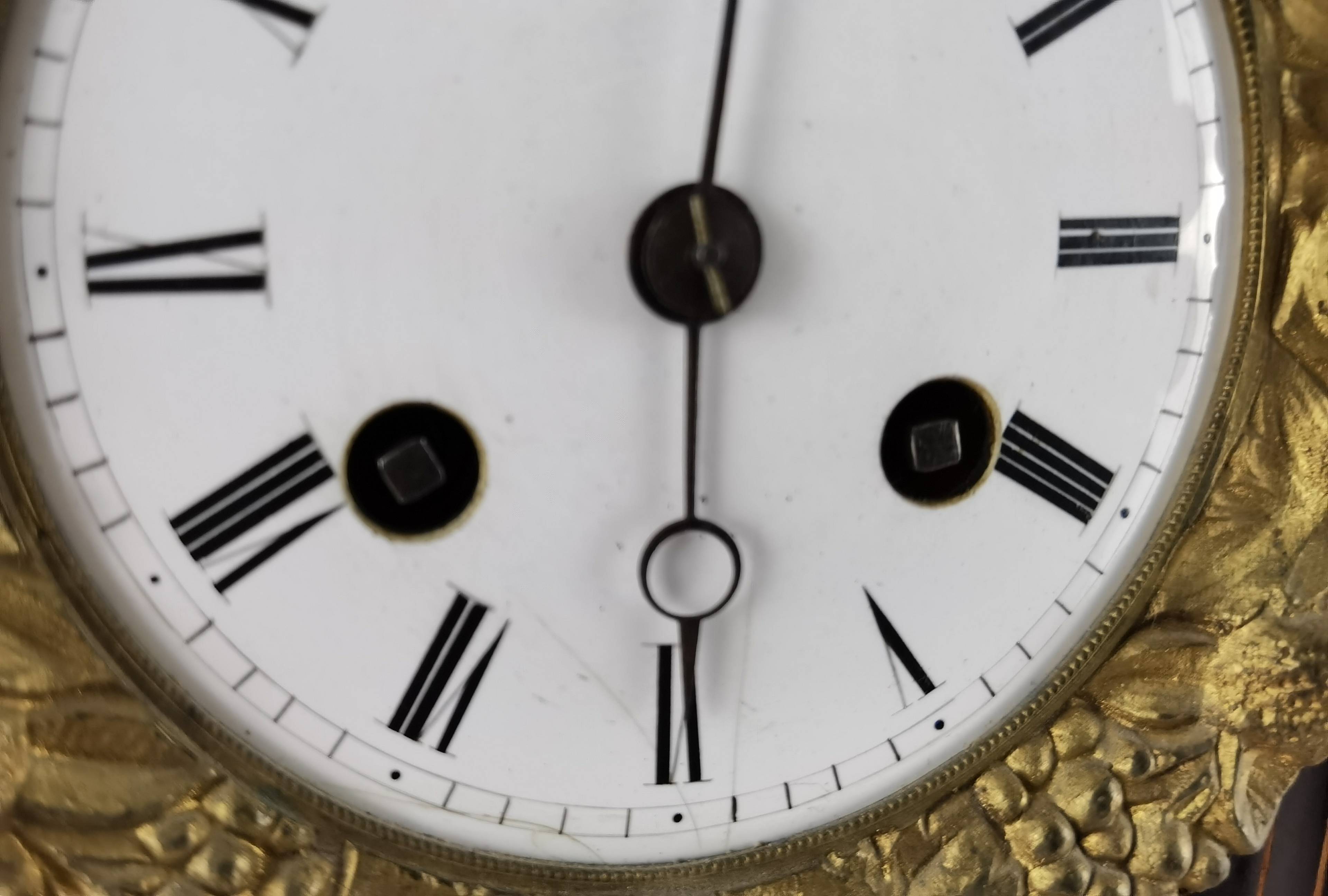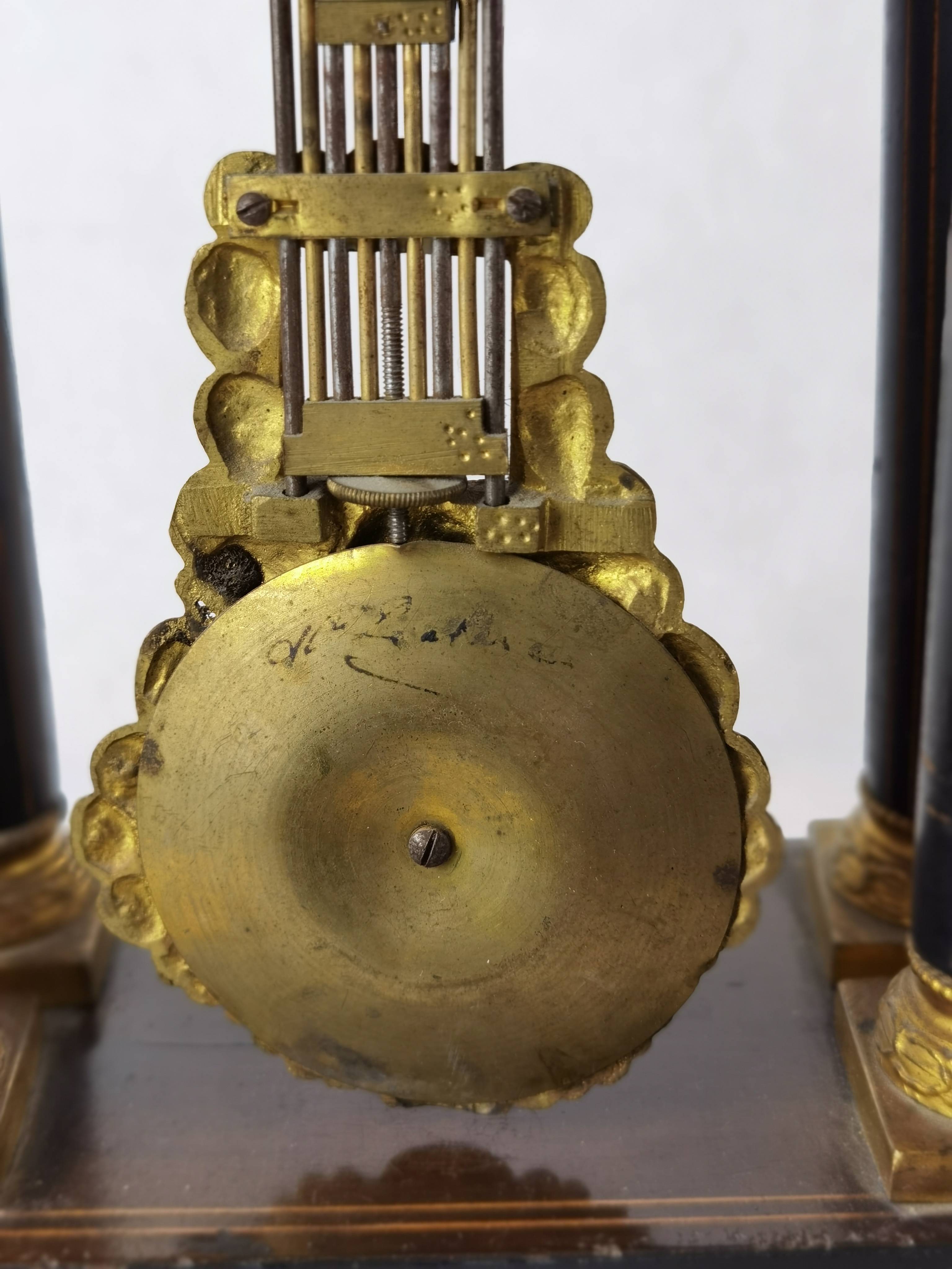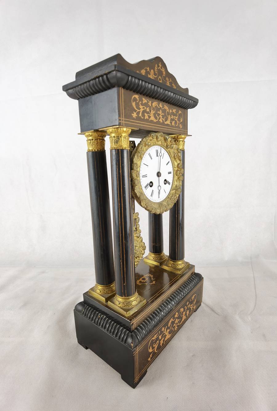 Beschreibung/description: Antike französische Säulenuhr, signiert „Japy Frères, Paris“, um 1840/50 Elegante Pendeluhr mit achttägigem Federzugwerk und klassischem Aufbau in viersäuliger Architektur. Das Uhrwerk verfügt über Stunden- und Halbstundenschlag auf Glocke sowie eine Pendelfederaufhängung. Das Emailzifferblatt mit römischen Ziffern ist von vergoldeter Bronzelunette eingefasst und mit feinen gebläuten Stahlzeigern ausgestattet. Auch die reich verzierte Pendellinse besteht aus feuervergoldeter Bronze. Das sorgfältig gearbeitete Holzgehäuse zeigt kunstvolle Marketerie-Intarsien im Biedermeier-Stil und ist mit dekorativen Bronzeapplikationen veredelt. Die vier schwarzen Säulen mit vergoldeten Basen und Kapitellen verleihen der Uhr einen repräsentativen, klassizistisch inspirierten Charakter.