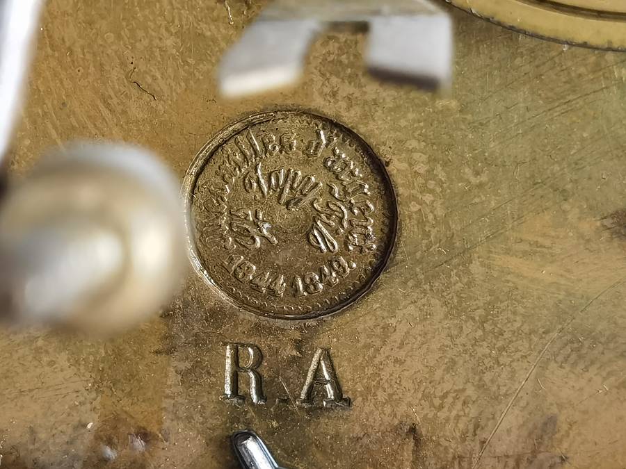 Antike französische Säulenuhr, signiert „Japy Frères, Paris“, um 1840/50 Elegante Pendeluhr mit achttägigem Federzugwerk und klassischem Aufbau in viersäuliger Architektur. Das Uhrwerk verfügt über Stunden- und Halbstundenschlag auf Glocke sowie eine Pendelfederaufhängung. Das Emailzifferblatt mit römischen Ziffern ist von vergoldeter Bronzelunette eingefasst und mit feinen gebläuten Stahlzeigern ausgestattet. Auch die reich verzierte Pendellinse besteht aus feuervergoldeter Bronze. Das sorgfältig gearbeitete Holzgehäuse zeigt kunstvolle Marketerie-Intarsien im Biedermeier-Stil und ist mit dekorativen Bronzeapplikationen veredelt. Die vier schwarzen Säulen mit vergoldeten Basen und Kapitellen verleihen der Uhr einen repräsentativen, klassizistisch inspirierten Charakter. |