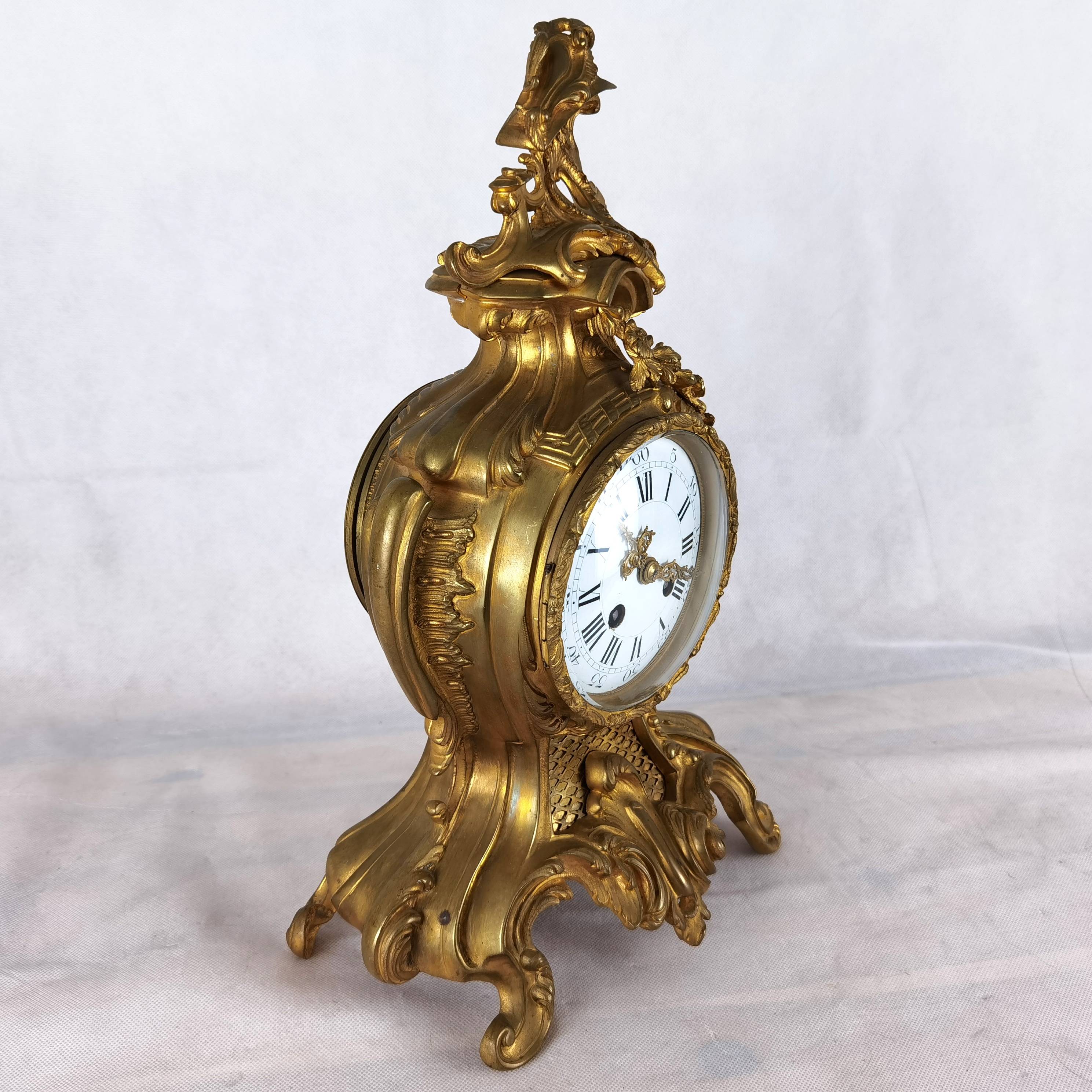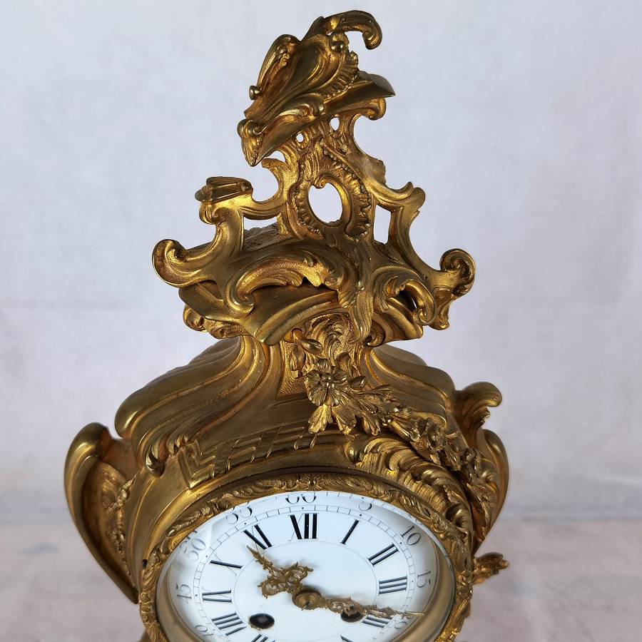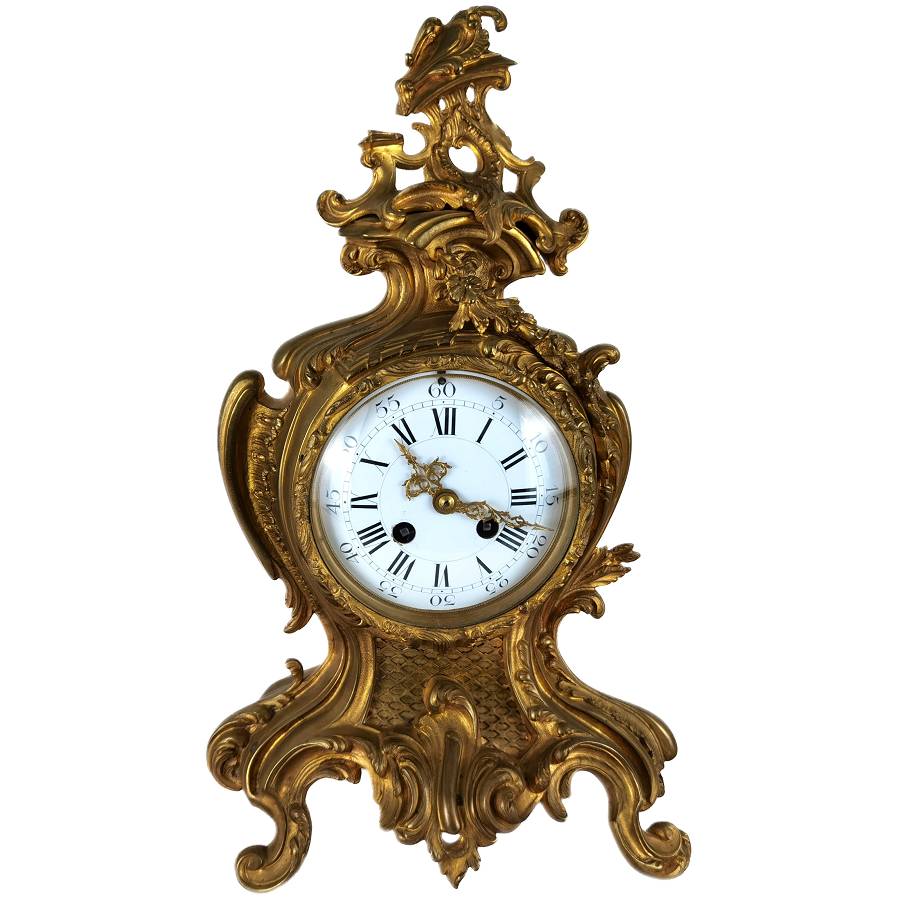 Beschreibung/description: Diese elegante französische Pendule aus dem 19. Jahrhundert präsentiert sich in einem prachtvollen Rokoko-Design mit reichem, geschwungenem Dekor und fein ausgearbeiteten Ornamenten. Das Gehäuse besteht aus feuervergoldetem Bronze (Ormolu) und zeigt die typischen asymmetrischen Formen und floralen Elemente dieser Epoche. Das Emailzifferblatt mit römischen Stunden- und arabischen Minutenangaben ist sehr gut erhalten und verfügt über fein gearbeitete, vergoldete Zeiger. Die Uhr vermittelt einen eindrucksvollen dekorativen Charakter und ist ein klassisches Beispiel französischer Handwerkskunst. Es handelt sich um ein klassisches 8-Tage-Federwerk, typischerweise mit Halbstunden- und Stundenschlag auf Glocke (Gong oder Schale), wie es in französischen Pendulen dieser Zeit üblich ist. ArtikelNummer /number: uhr117