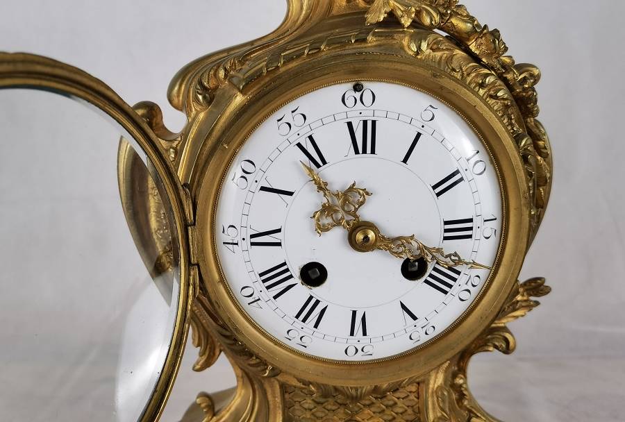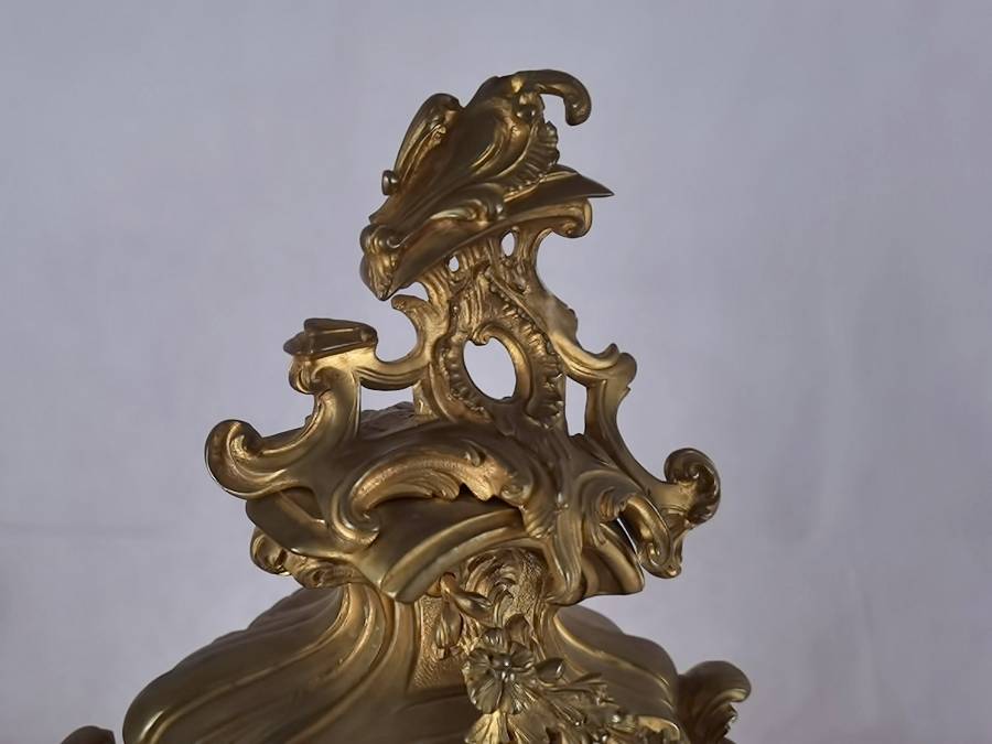 Antike Neorokoko Pendule Bronze, vergoldet 19 Jh. Diese elegante französische Pendule aus dem 19. Jahrhundert präsentiert sich in einem prachtvollen Rokoko-Design mit reichem, geschwungenem Dekor und fein ausgearbeiteten Ornamenten. Das Gehäuse besteht aus feuervergoldetem Bronze (Ormolu) und zeigt die typischen asymmetrischen Formen und floralen Elemente dieser Epoche. Das Emailzifferblatt mit römischen Stunden- und arabischen Minutenangaben ist sehr gut erhalten und verfügt über fein gearbeitete, vergoldete Zeiger. Die Uhr vermittelt einen eindrucksvollen dekorativen Charakter und ist ein klassisches Beispiel französischer Handwerkskunst. Es handelt sich um ein klassisches 8-Tage-Federwerk, typischerweise mit Halbstunden- und Stundenschlag auf Glocke (Gong oder Schale), wie es in französischen Pendulen dieser Zeit üblich ist. |
